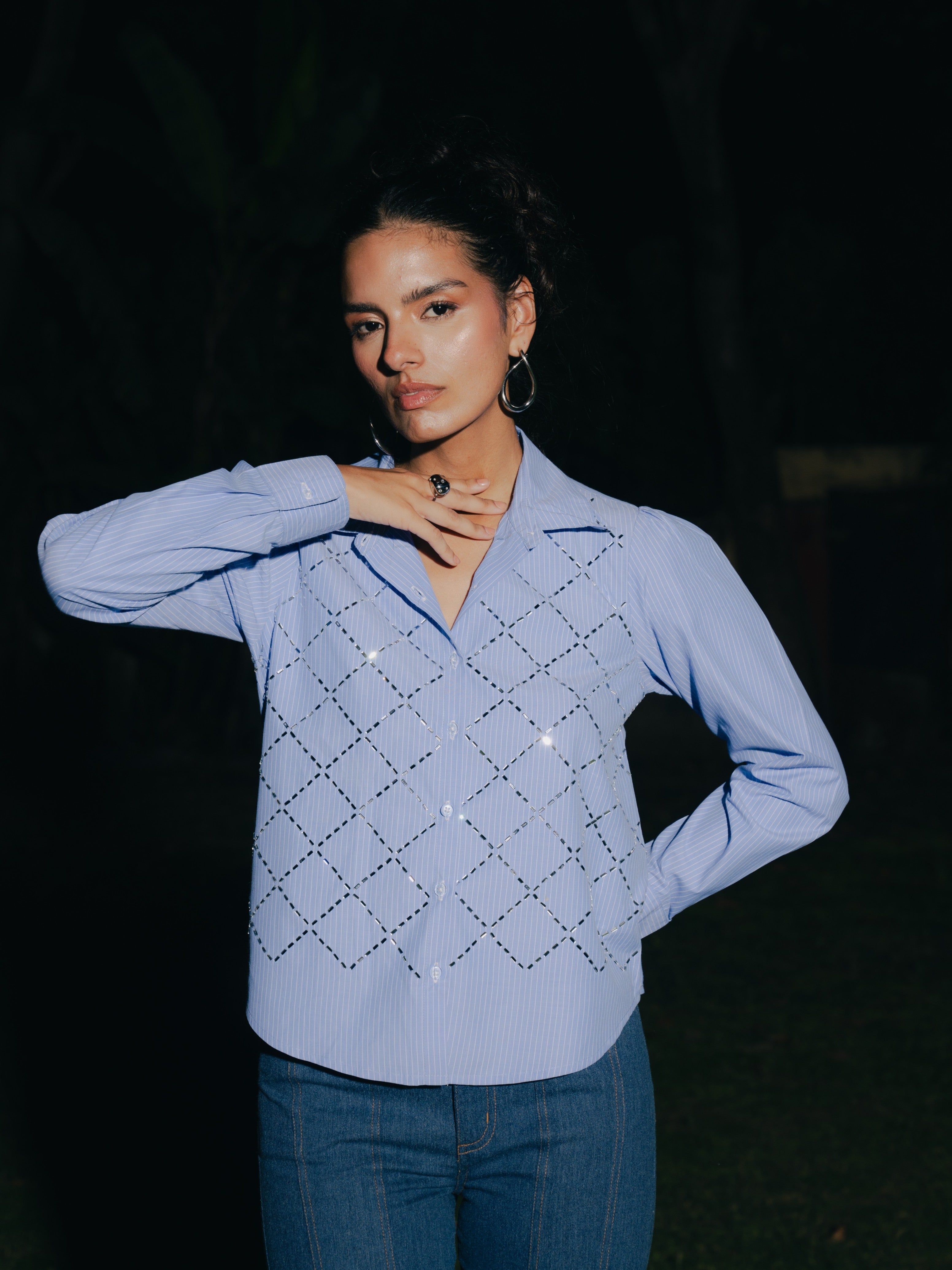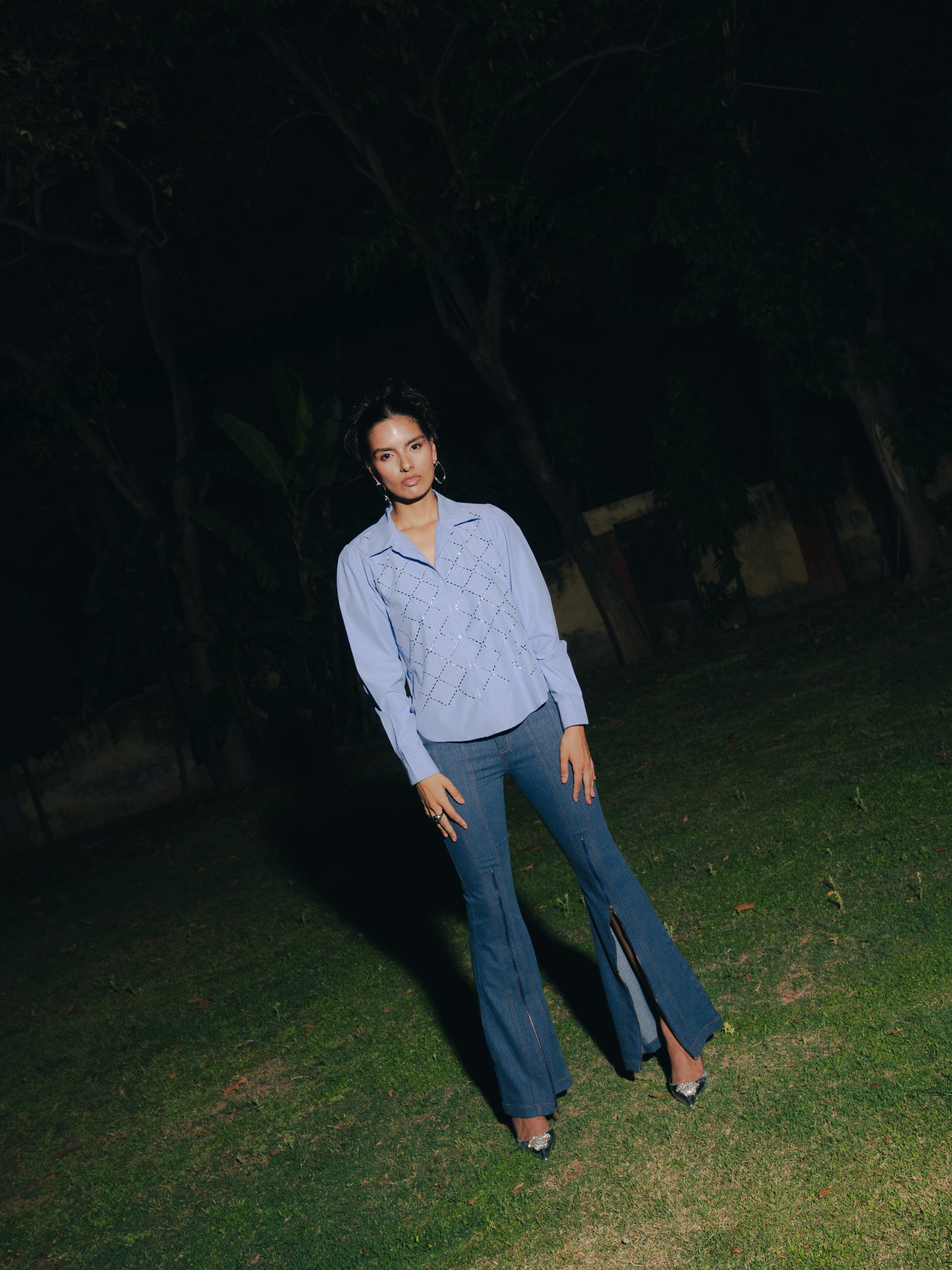 A sophisticated blend of timeless elegance, the luxe blue striped shirt is embellished with French cut stones, teamed with flare denim lower with front zip that can be styled in different ways