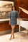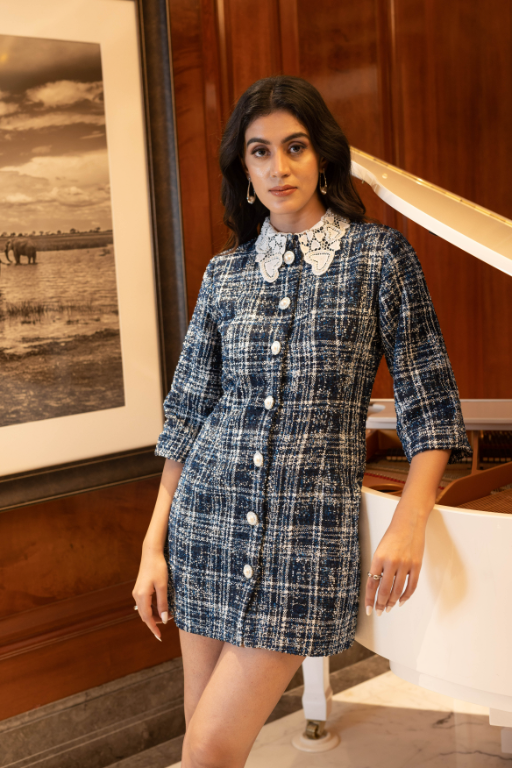 A chic blue tweed dress featuring a French collar and a row of pearl drop buttons down the front. The tailored silhouette flatters every body type. Elegant and timeless, perfect for polished sophistication