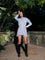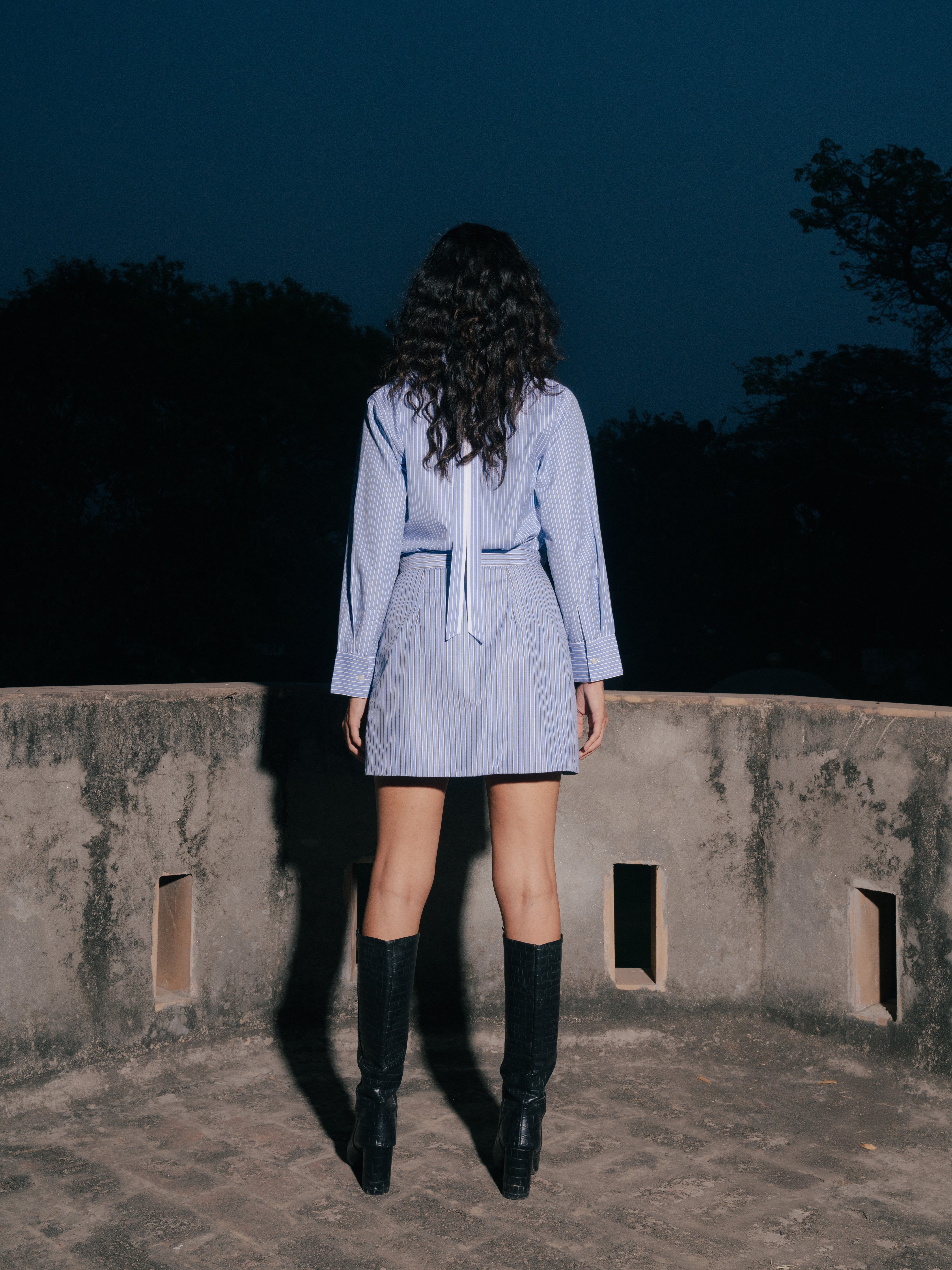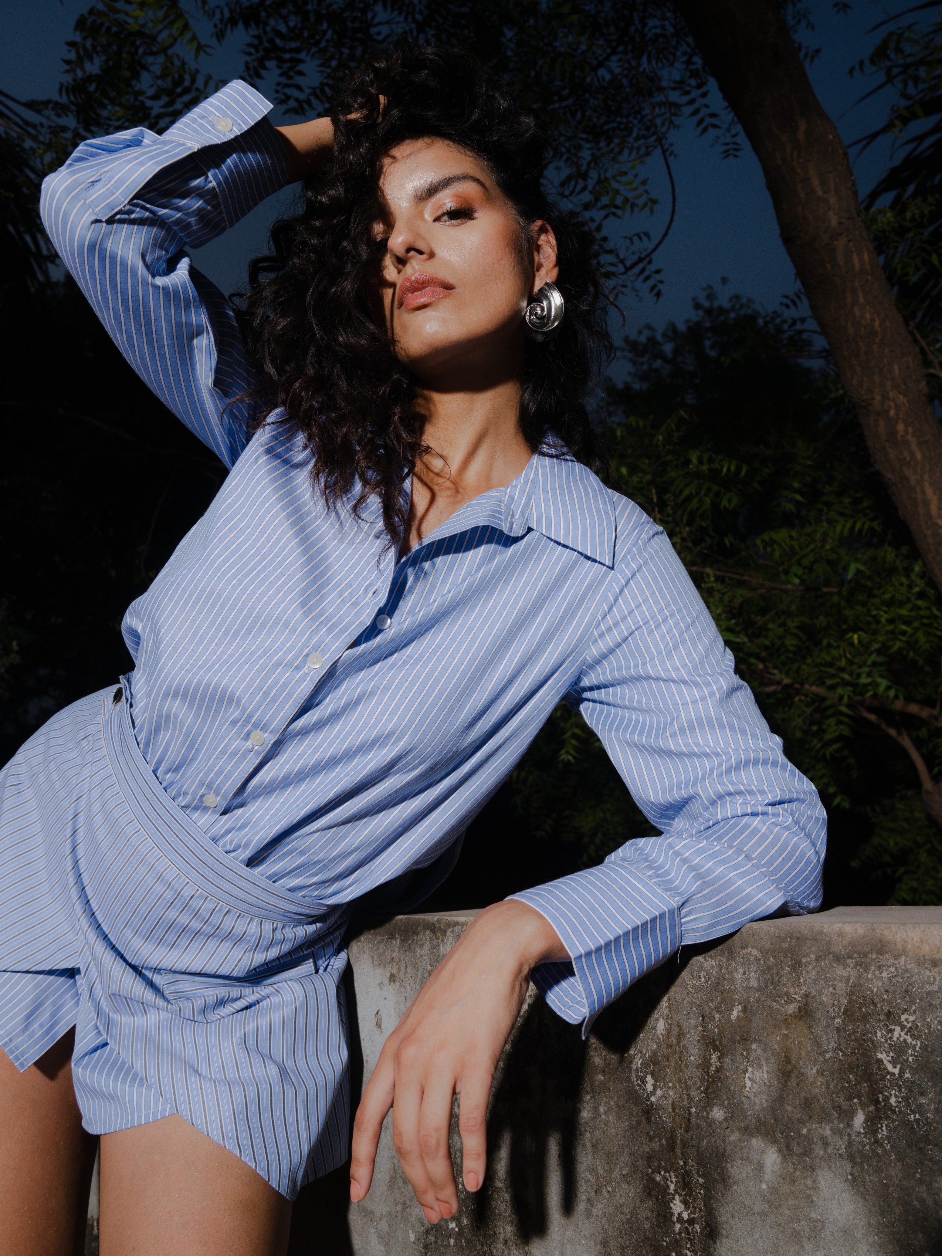 Collared long sleeve button down shirt dress with a detachable flap. A silhouette that flatters every body type