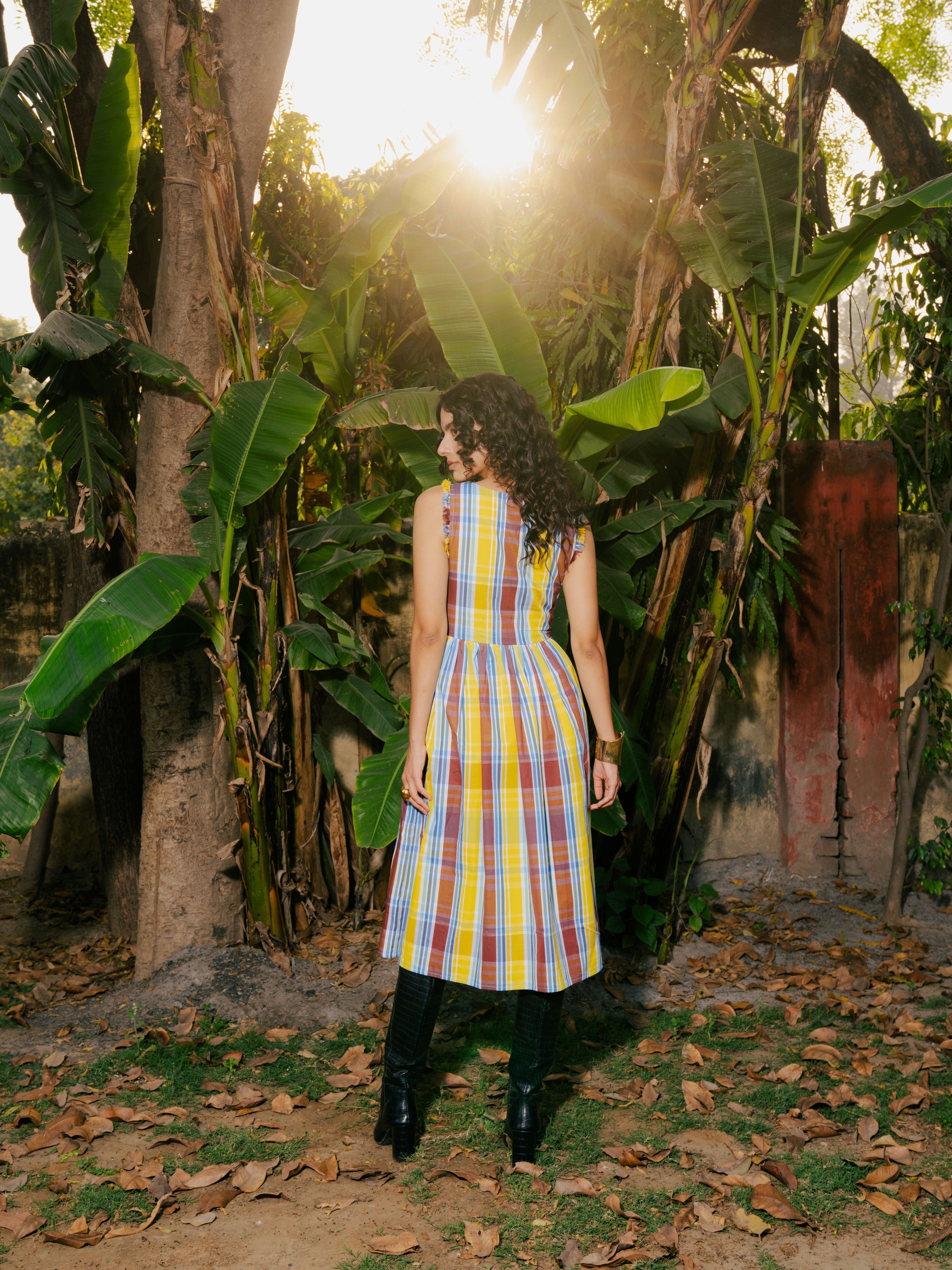 Featuring a classic checkered pattern in warm tones, this full length dress is crafted from soft, breathable fabric. A scoop neckline with delicate bow adds a feminine touch. This dress offers timeless elegance with a playful touch.