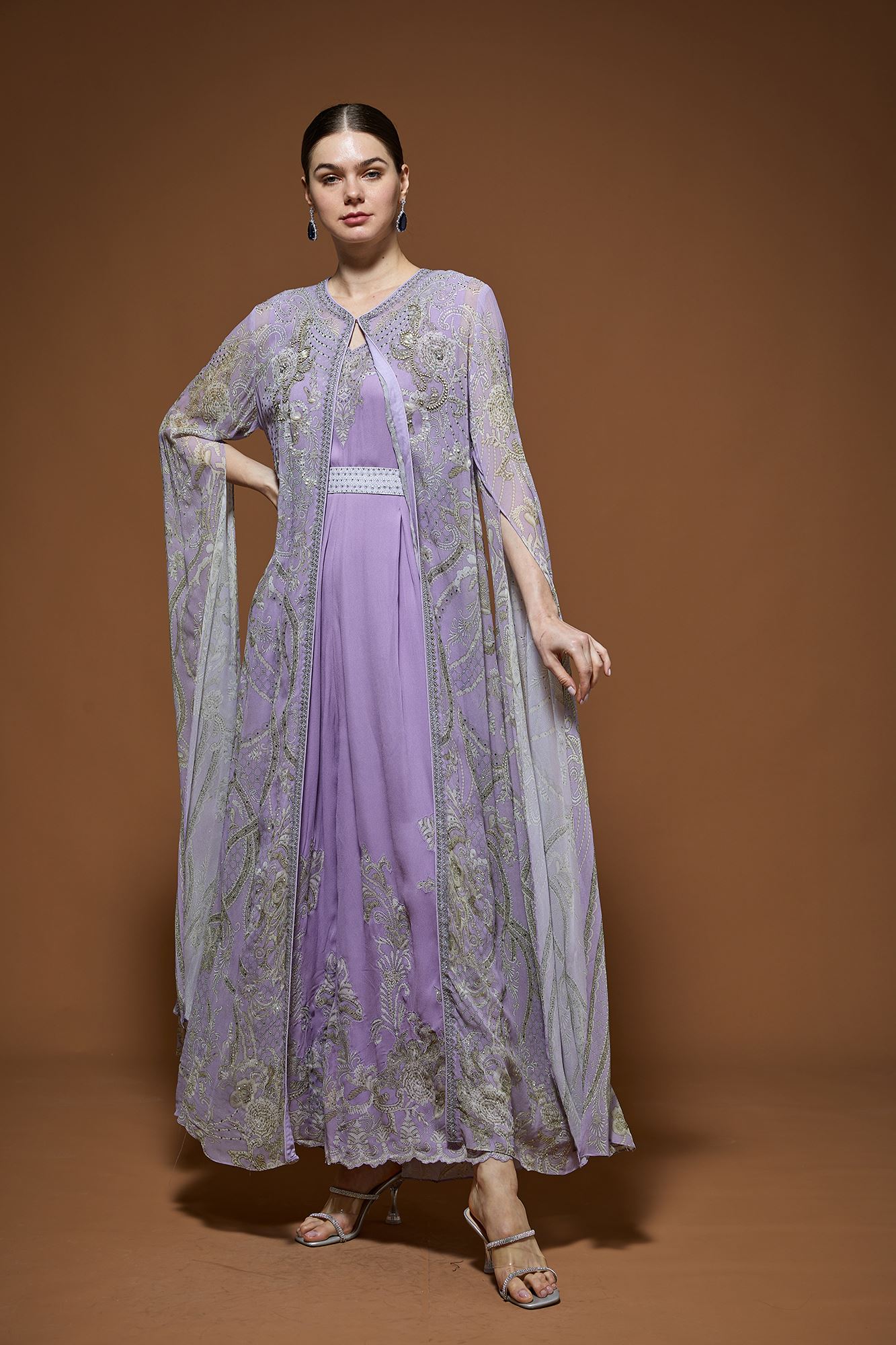 Featuring a digitally printed cape with inner jumpsuit and belt all embellished with rhinestone embroidery.