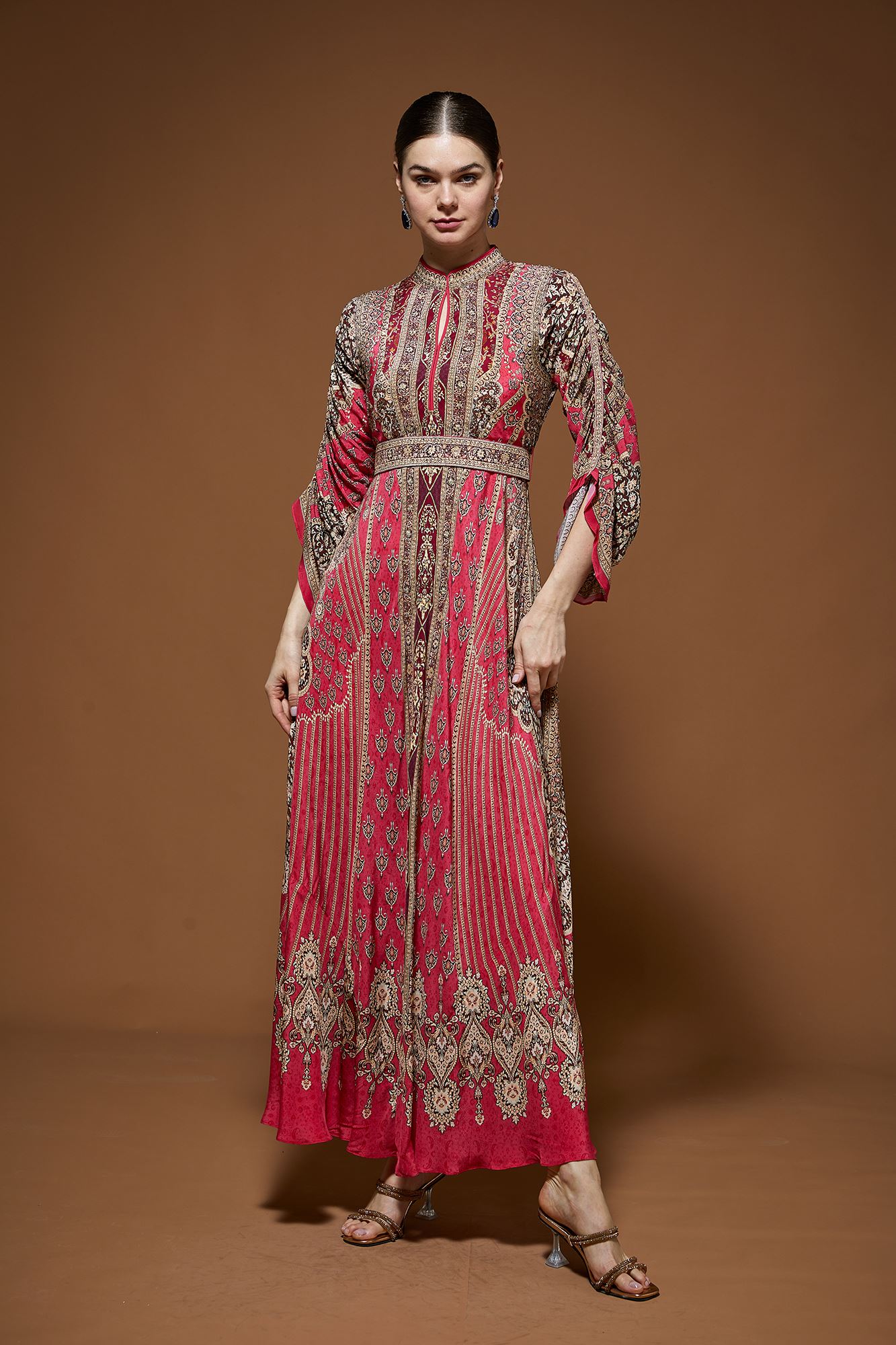 Featuring a digitally printed Kaftan in Crepe with belt embellished all over with rhinestone embroidery.