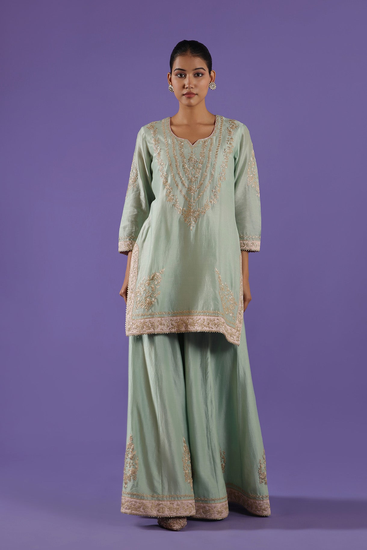 Wrap yourself in the beauty of this Pastel Blue Short Shirt and Sharara Set, a perfect mix of classic style and elegance. The Chanderi Kurta features beautiful Kashmiri embroidery that adds a royal touch. It comes with a stylish, flared Chanderi Sharara, creating a sophisticated look. The Organza Dupatta, with its lovely embroidery, brings a dreamy feel to the outfit. This ensemble is ideal for celebrations, weddings, or special events, blending traditional elements with modern charm to make every occasion feel special.