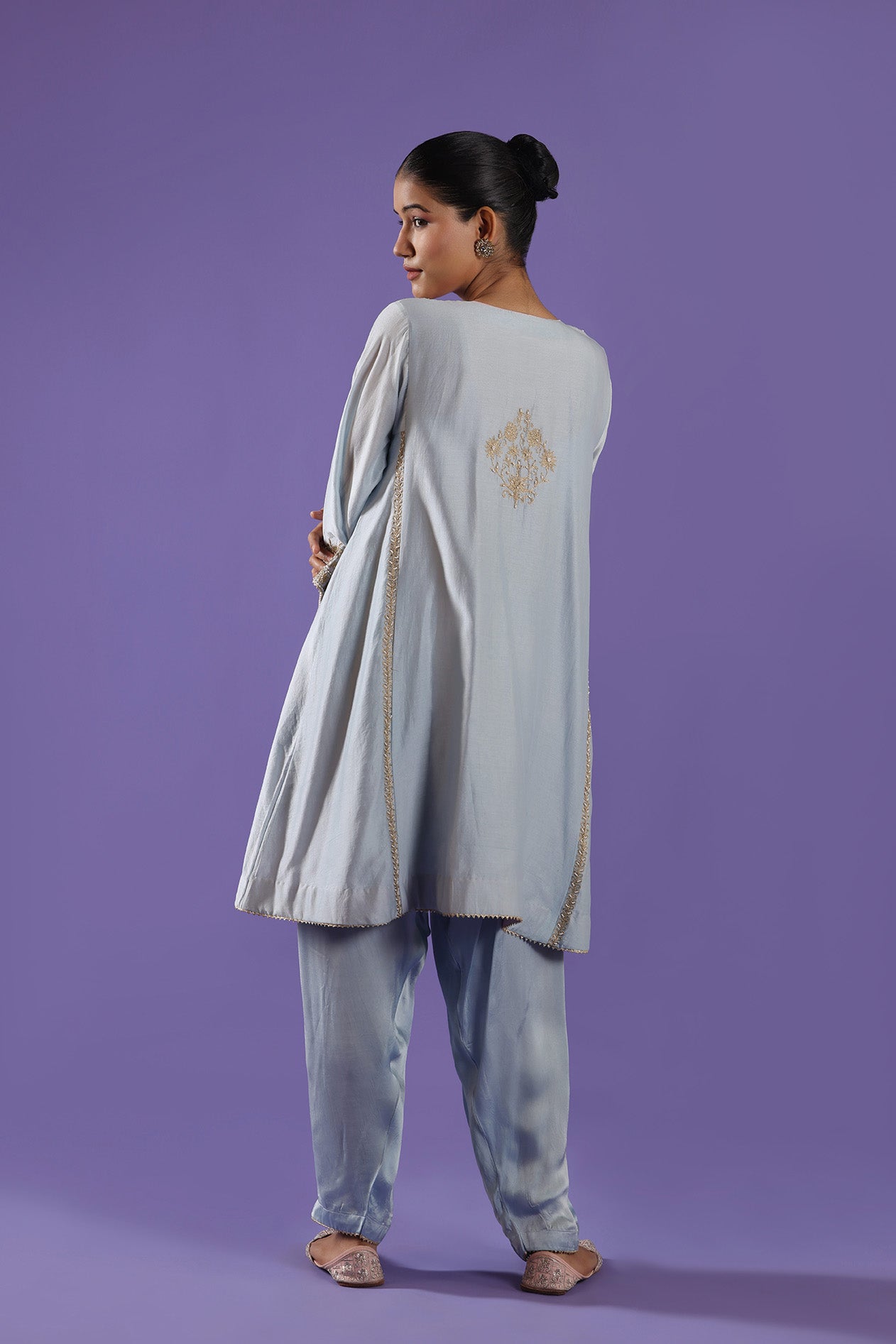 Drift into a world of ethereal charm with this Pastel Blue Choga Set, a poetic blend of tradition and elegance. The Chanderi choga, adorned with intricate Kashmiri Tilla embroidery, reflects timeless craftsmanship, while the satin salwar drapes effortlessly for a regal touch. Completing the ensemble, the organza dupatta, kissed with delicate accents, adds a dreamlike allure. Light, graceful, and mesmerizing, this outfit is a perfect symphony of heritage and contemporary finesse—ideal for intimate soirées and cherished celebrations.