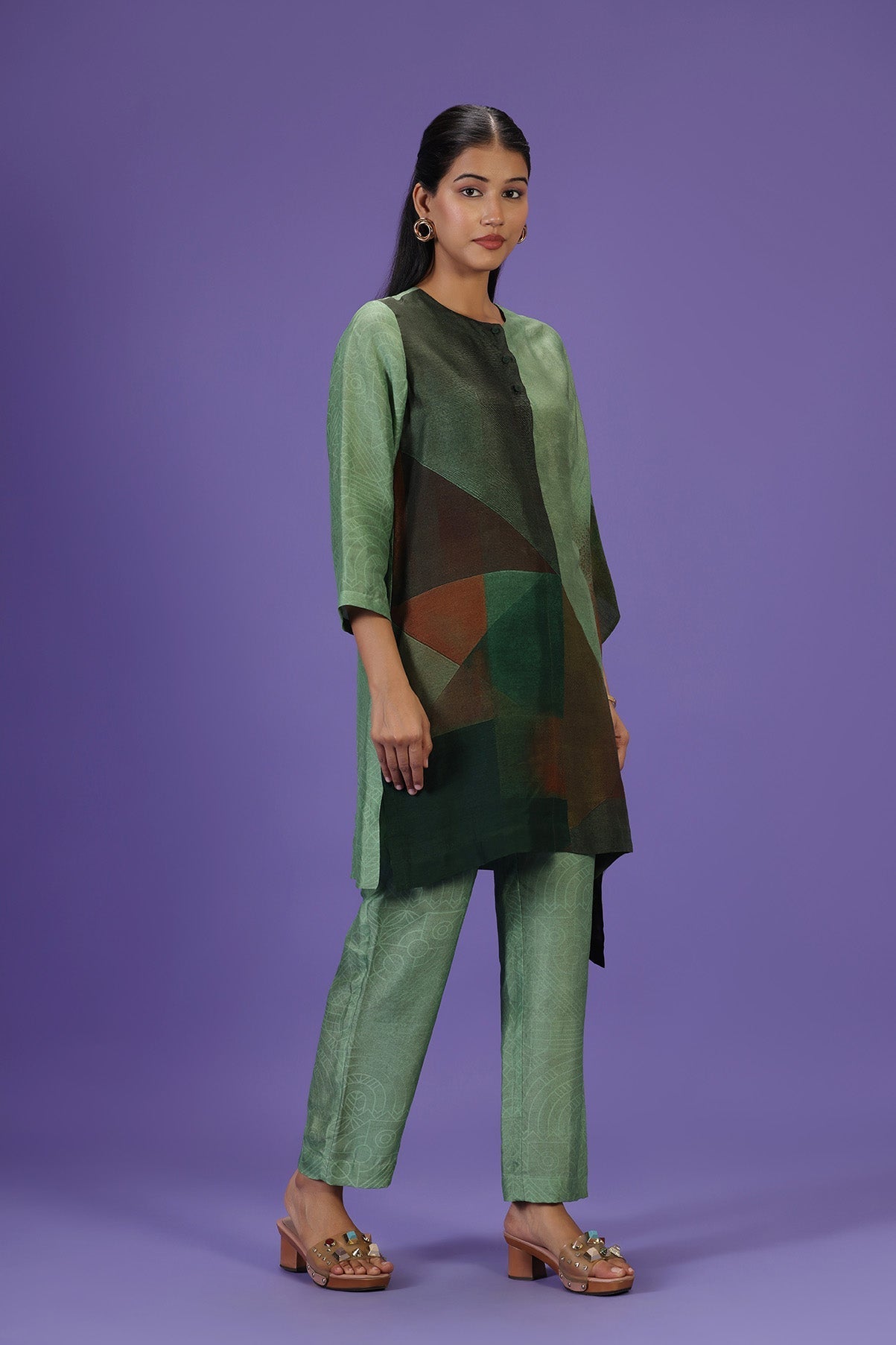Drape yourself in understated luxury with this Dupion Silk Short Kurta Set, a perfect fusion of modern minimalism and timeless grace. The asymmetric cuts and earthy hues bring a refreshing elegance, making it a versatile choice for effortless sophistication.