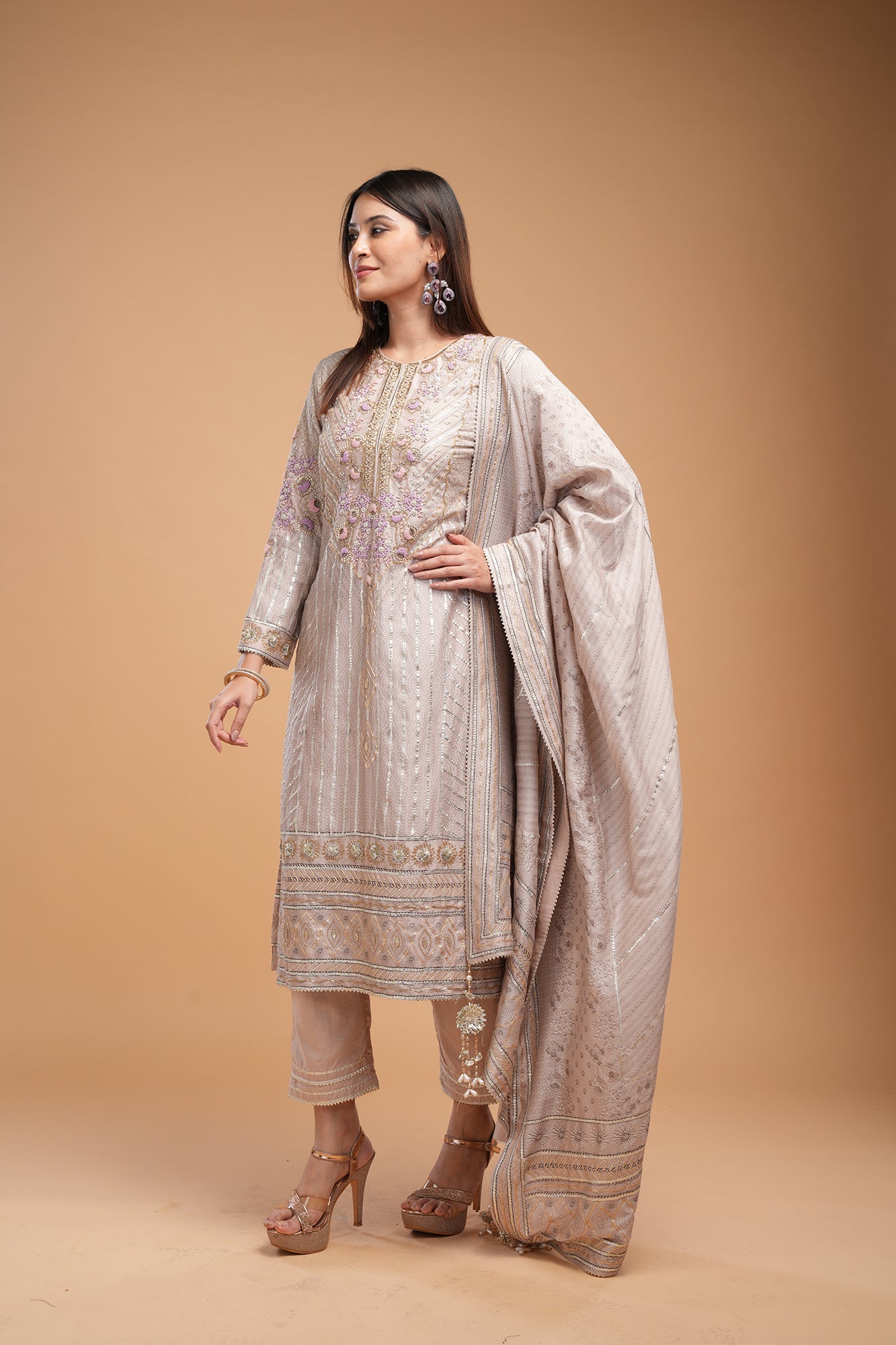 Featuring a digitally printed kurta in Chanderi and dupatta in orgenza, paired with chanderi pants, all embellished with hand embroidery, rhinestone and gota.