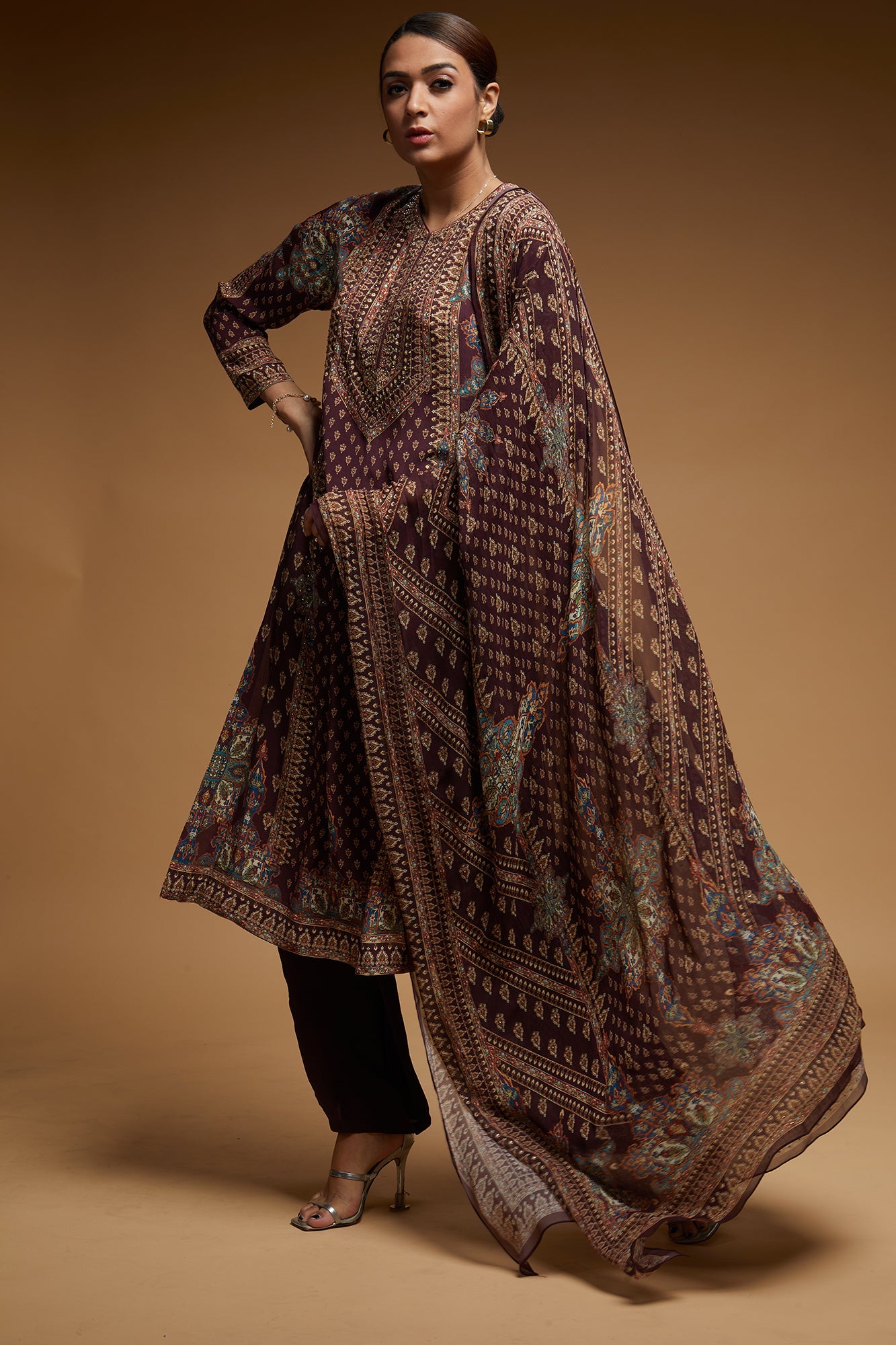 Featuring a Wine Color Printed kurta in crepe and georgette Dupatta with digital print and crystal embroidery. It is paired with matching dyed pants. Accentuate with dangler earrings and heels for any special occassion.