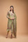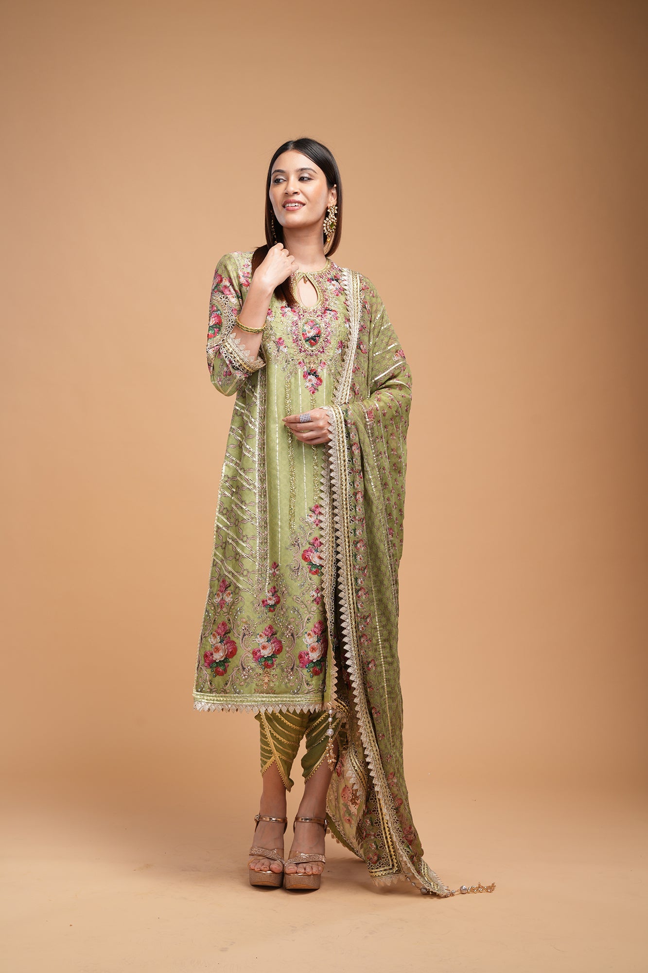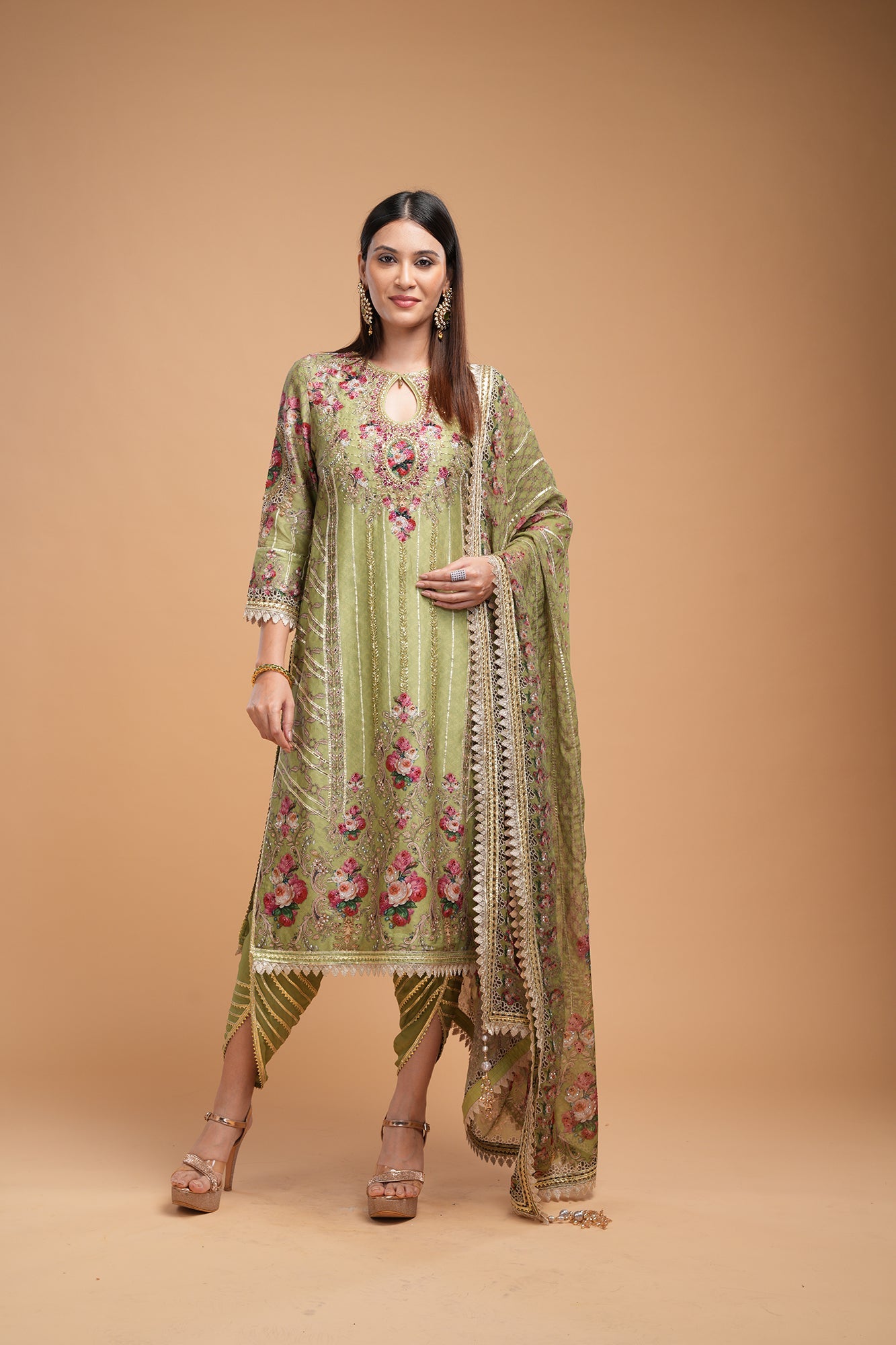 Featuring a digitally printed kurta in Chanderi and dupatta in Orgenza, paired with dhoti pants in Bemberg Crepe, all embellished with hand embroidery, rhinestone and gota.