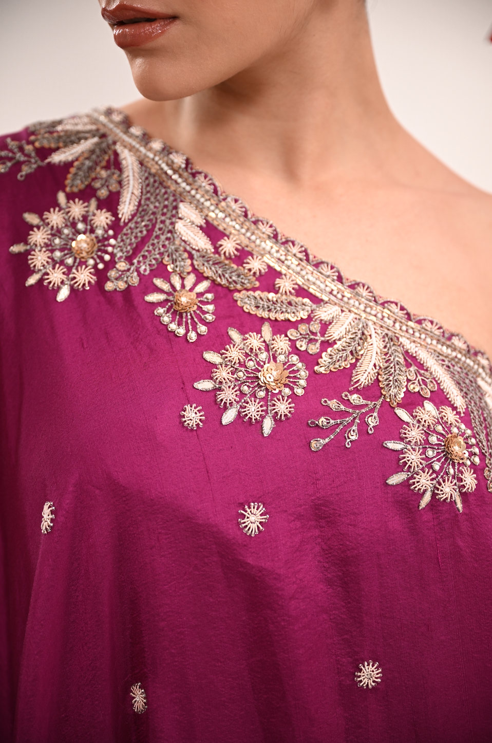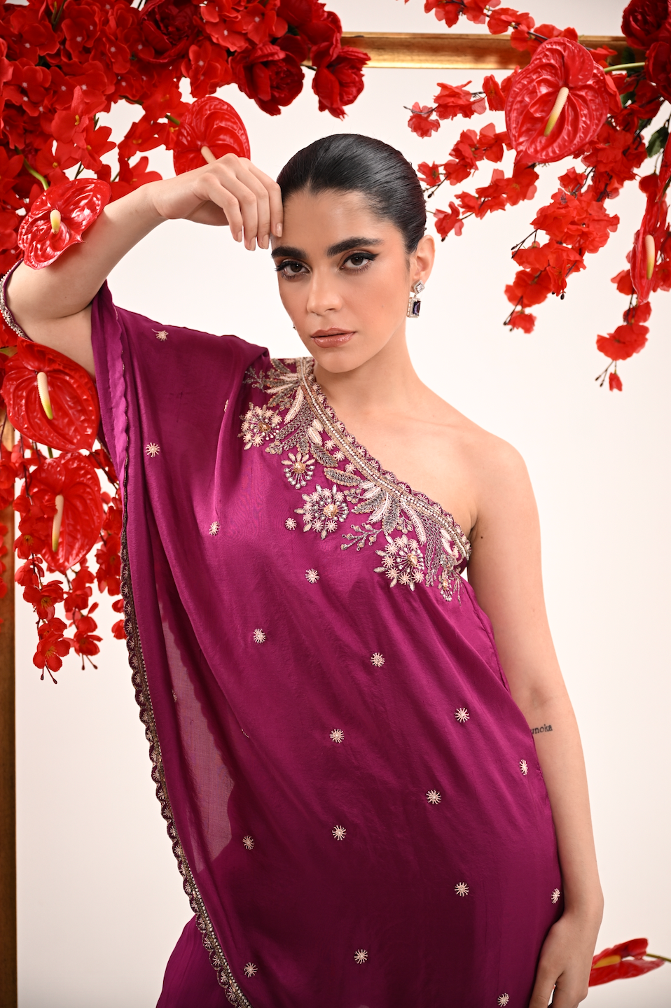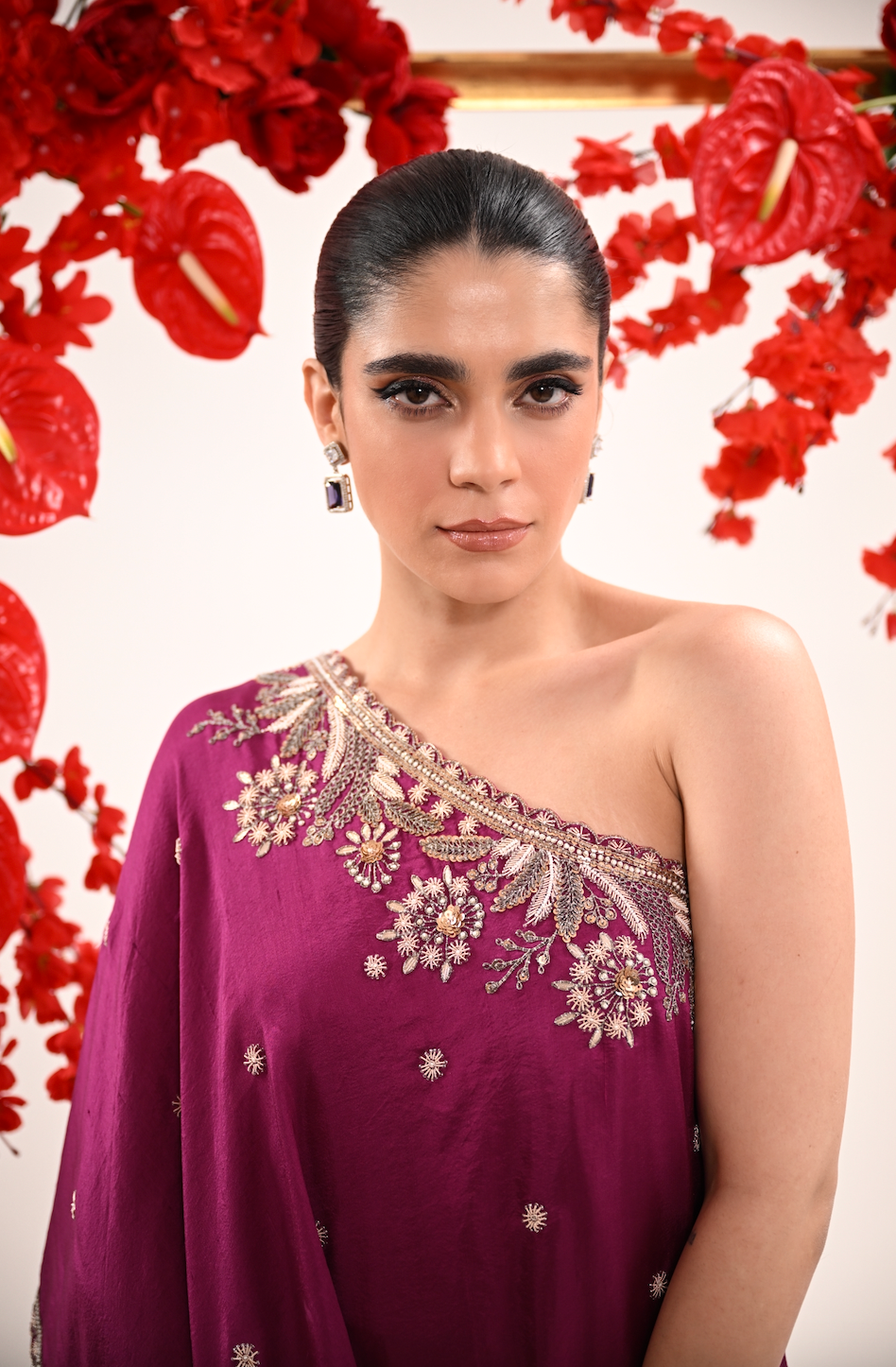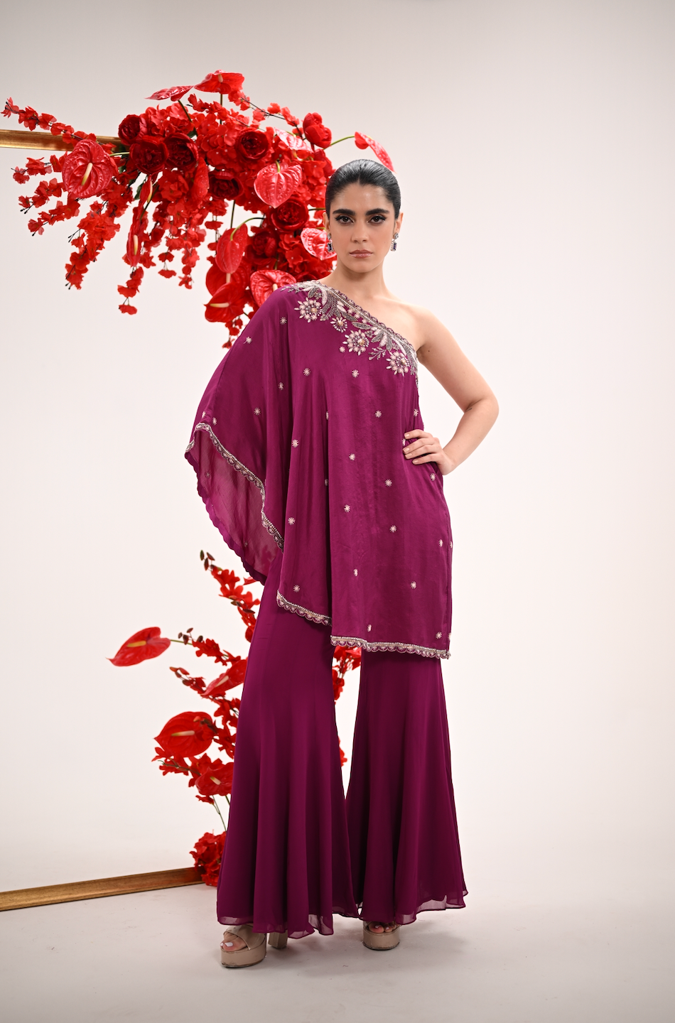 A vibrant magenta cape set with a one-shoulder silhouette, hand embroidered, and flared pants that bring instant movement and style. Light, striking, and made for standout celebrations — this look owns the room, effortlessly.