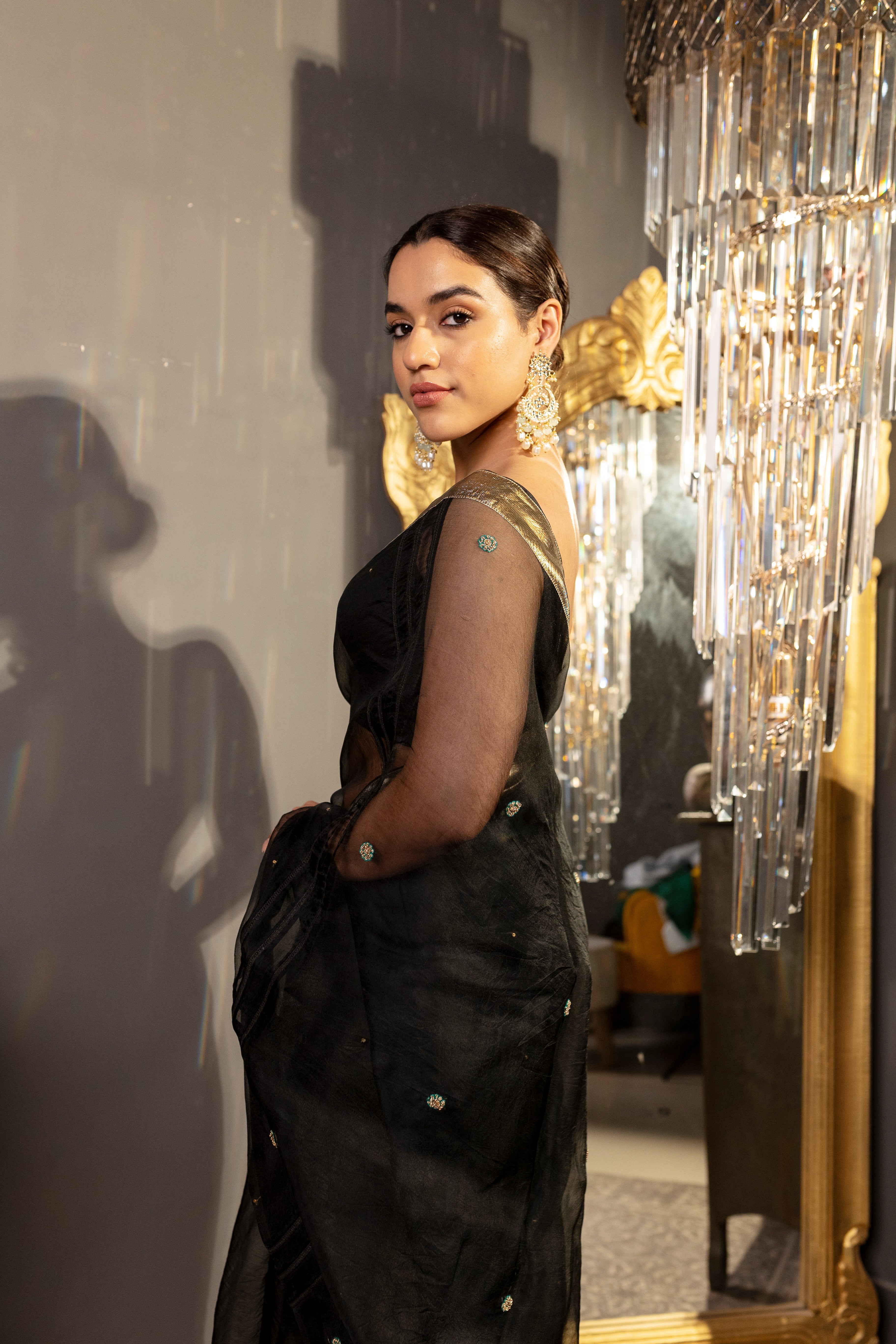 THE SARI HAS DABKA SEQUINS EMERALD GREEN FLOWERS ALL OVER. THE SARI HAS GOLD GOTA ON THE BORDER & PALLA TO GIVE THE PERFECT FINISHING.