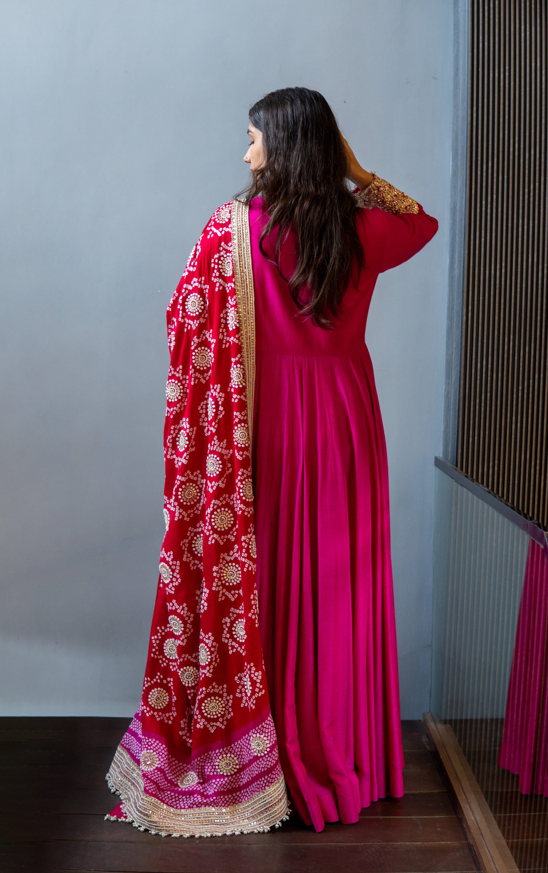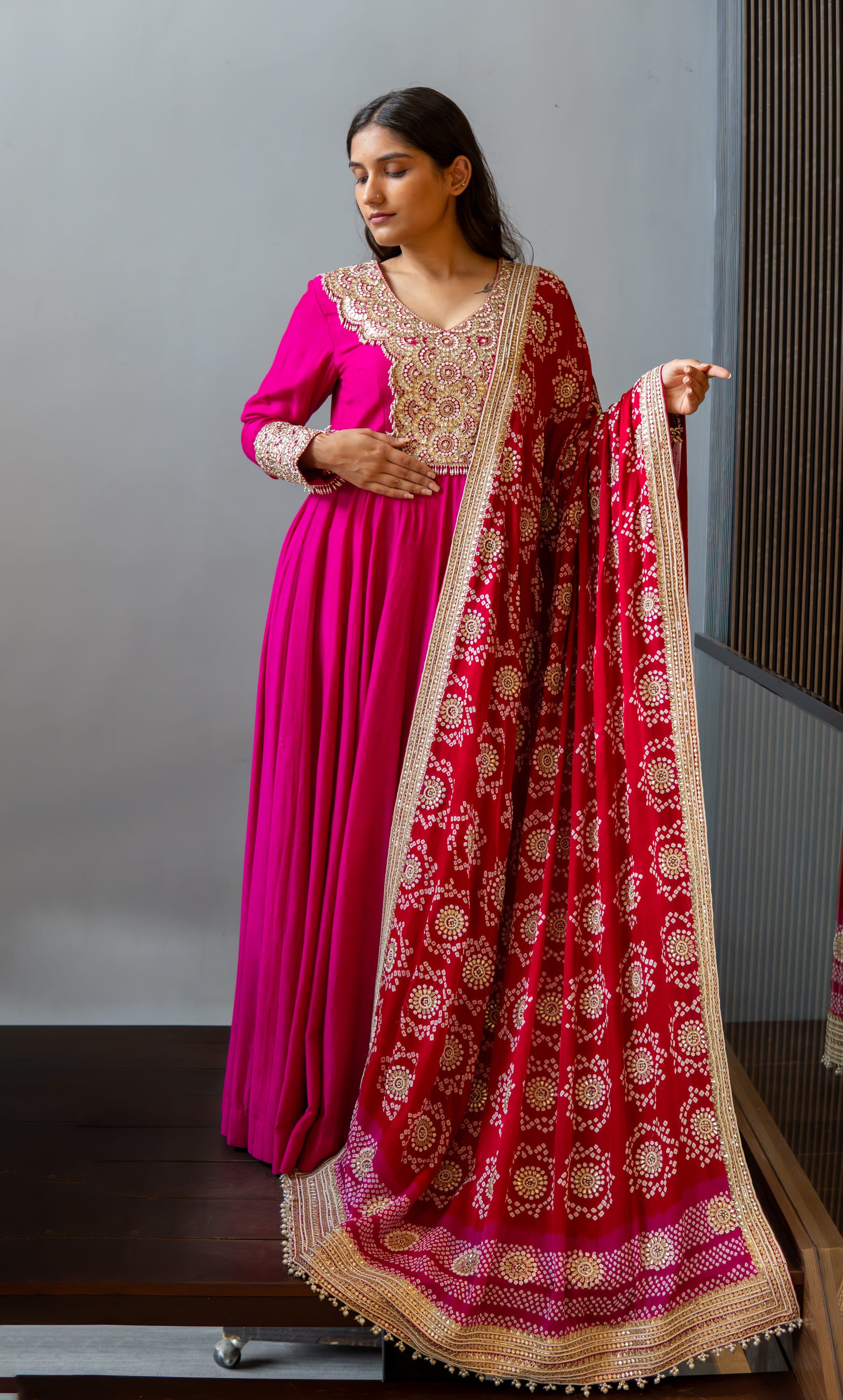 Featuring a pink anarkali in matka silk base. It is paired with a dupatta