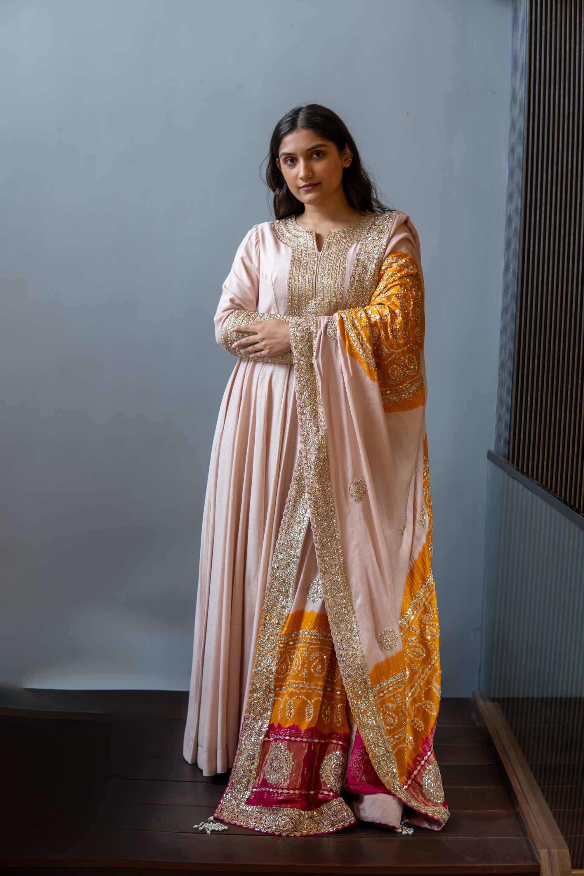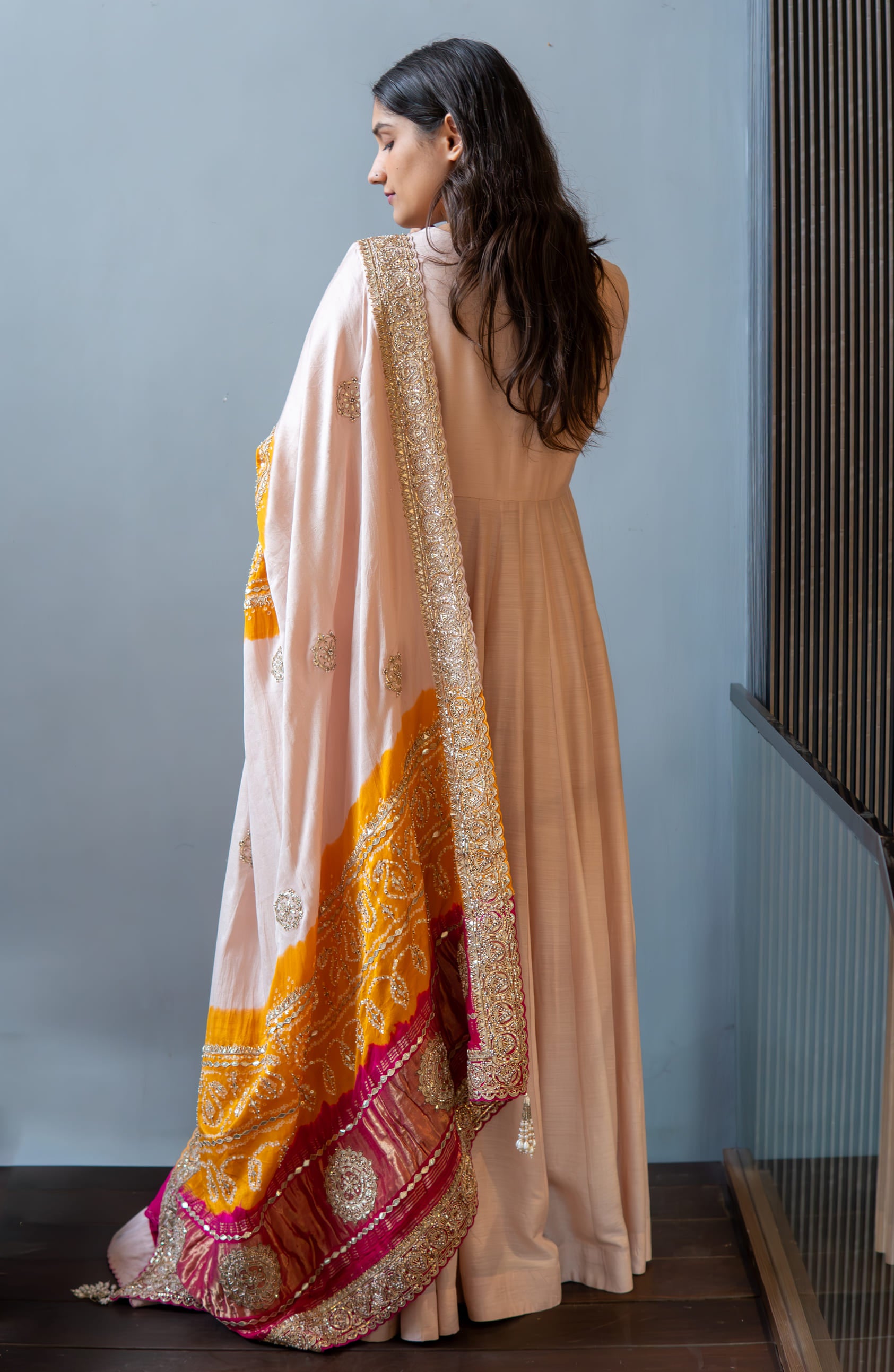 Featuring a Peach anarkali in matka silk base. It is paired with a dupatta