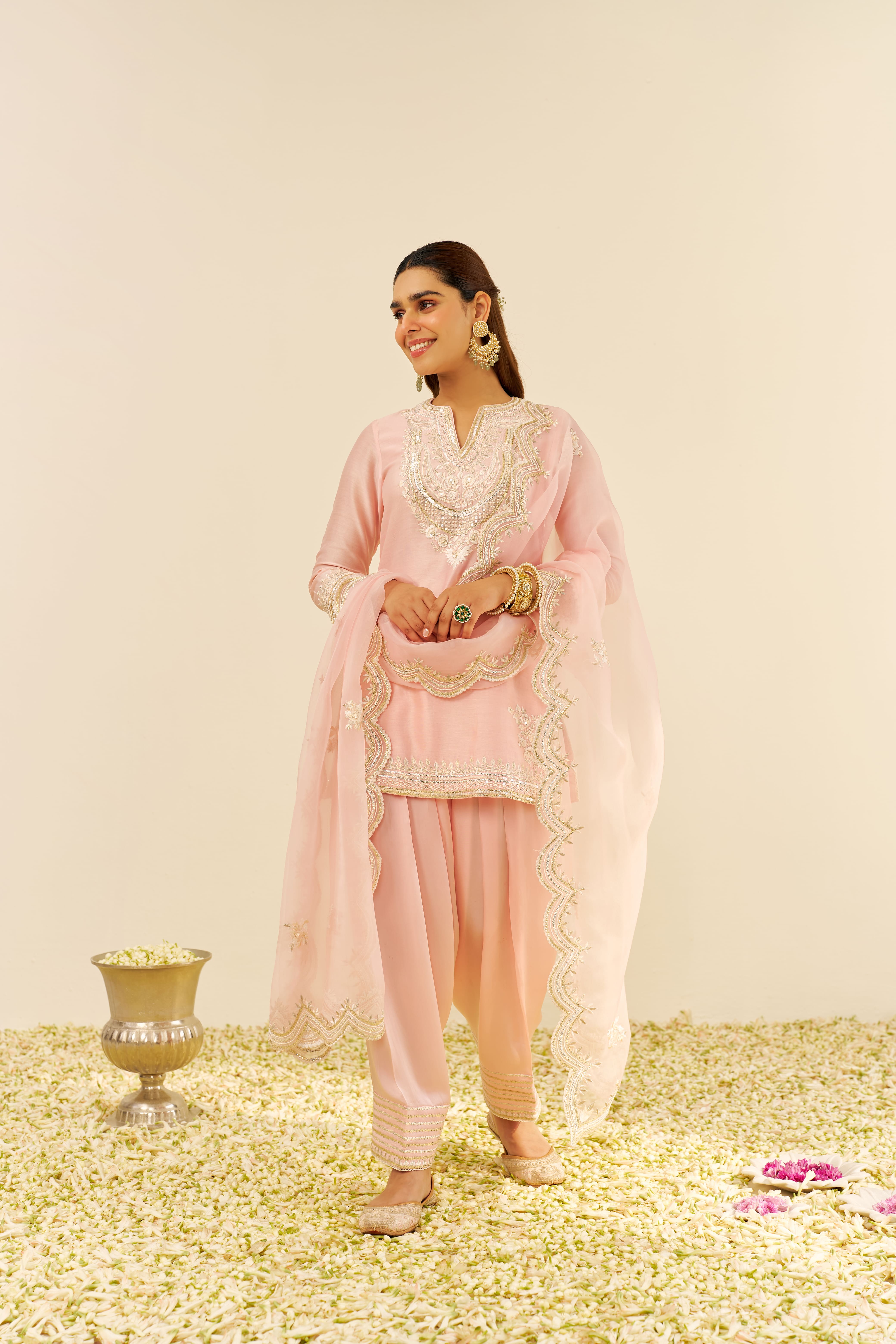 This elegant short A-line Sara ensemble is crafted from pure Silk Chanderi fabric, offering a luxurious and graceful silhouette. It is beautifully teamed with a traditional Dogri salwar and a delicate Silk Organza dupatta, adding a soft and ethereal touch to the look. The outfit features a sophisticated zero-neck design with a slit and three-quarter sleeves, combining modern elements with timeless elegance. The ensemble is adorned with exquisite Parsi Gara embroidery, intricately highlighted with Tilla, Gota, and pearls, creating a stunning visual appeal. The sleeves of the kurta are elegantly finished with detailed pearls, adding a refined and intricate touch. The entire outfit is beautifully completed with a fine lace and the signature Chanderi silk fabric, offering a polished, luxurious finish that exudes both grace and sophistication.
