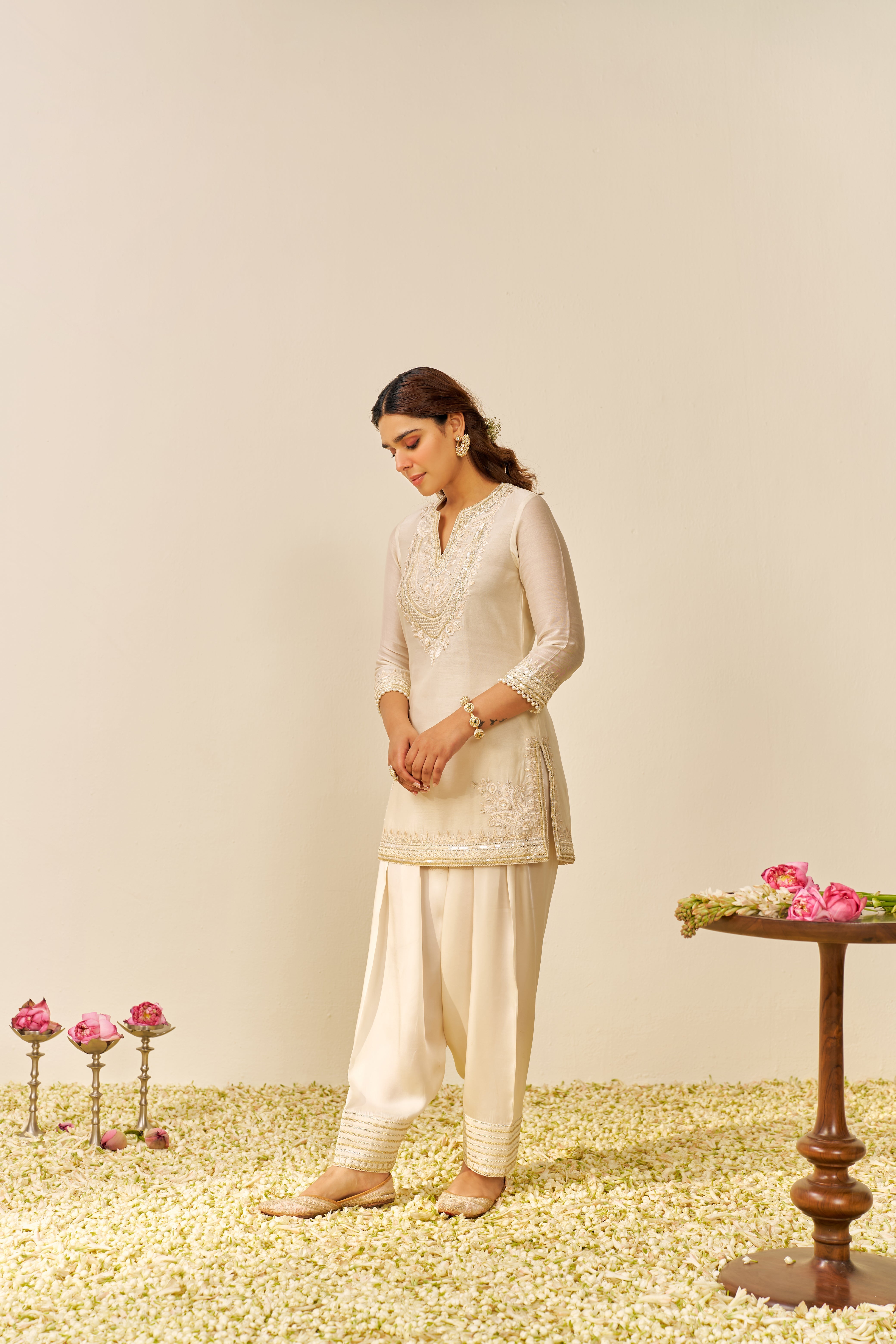 This elegant short A-line Sara ensemble is crafted from pure Silk Chanderi fabric, offering a luxurious and graceful silhouette. It is beautifully teamed with a traditional Dogri salwar and a delicate Silk Organza dupatta, adding a soft and ethereal touch to the look. The outfit features a sophisticated zero-neck design with a slit and three-quarter sleeves, combining modern elements with timeless elegance. The ensemble is adorned with exquisite Parsi Gara embroidery, intricately highlighted with Tilla, Gota, and pearls, creating a stunning visual appeal. The sleeves of the kurta are elegantly finished with detailed pearls, adding a refined and intricate touch. The entire outfit is beautifully completed with a fine lace and the signature Chanderi silk fabric, offering a polished, luxurious finish that exudes both grace and sophistication.