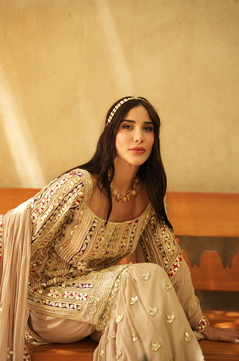 BEIGE PARISAA GARARA (PINK & PURPLE DETAILS)