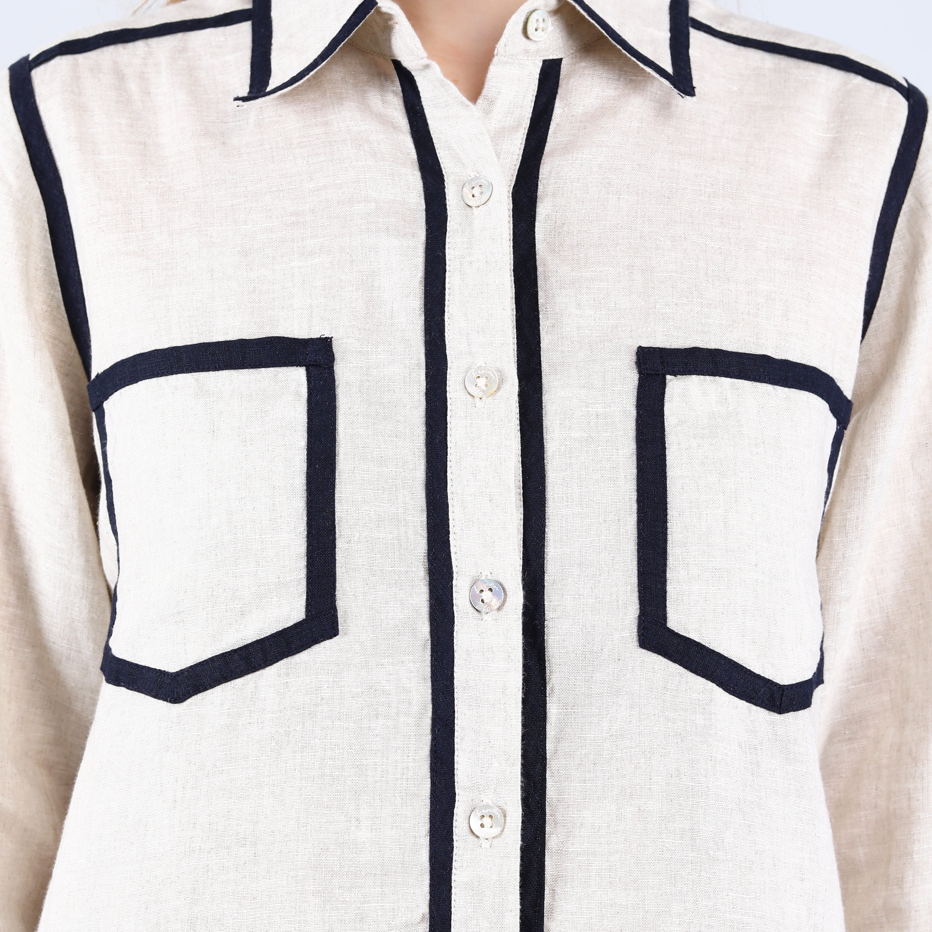 The Beige Double Pocket Shirt features stylish navy piping accents and a classic double-pocket design. Crafted on premium linen fabric, it offers a perfect blend of elegance and functionality for versatile wear.
