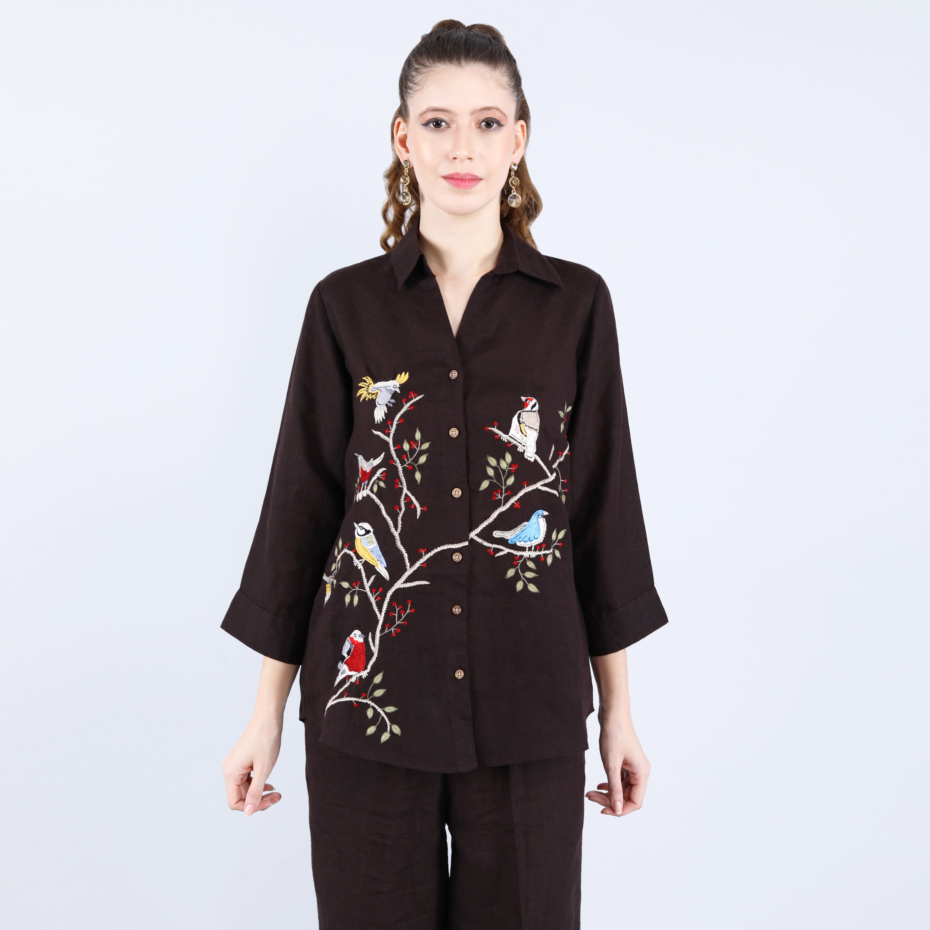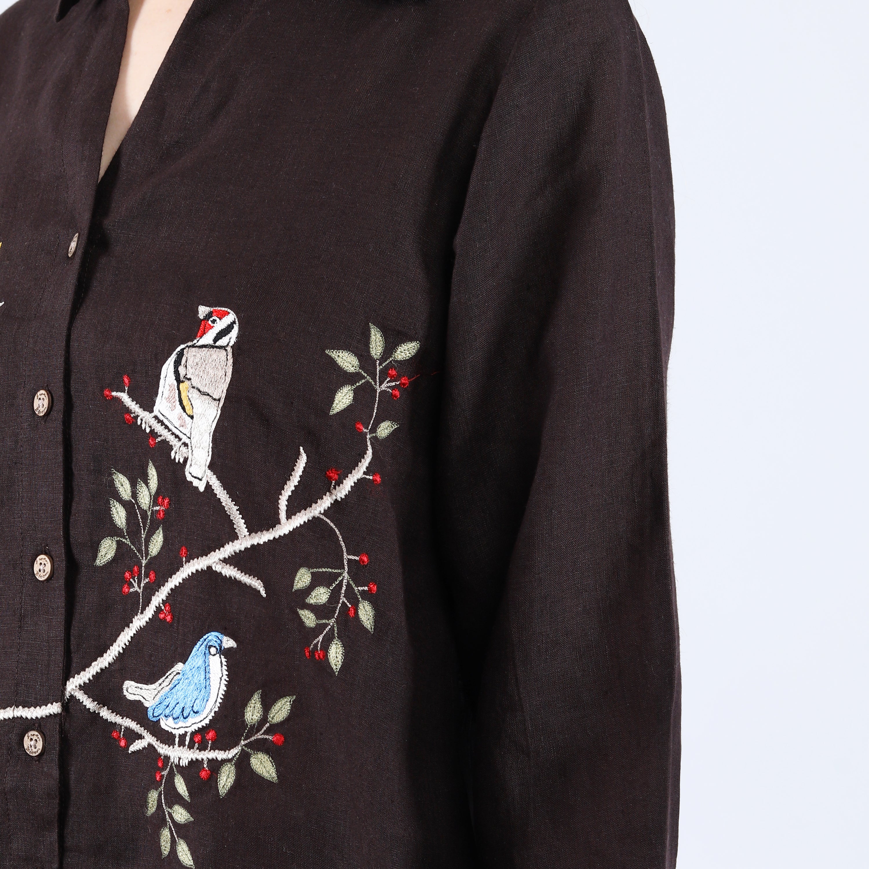Choco Birds on Branch Embroidery Black Linen Shirt