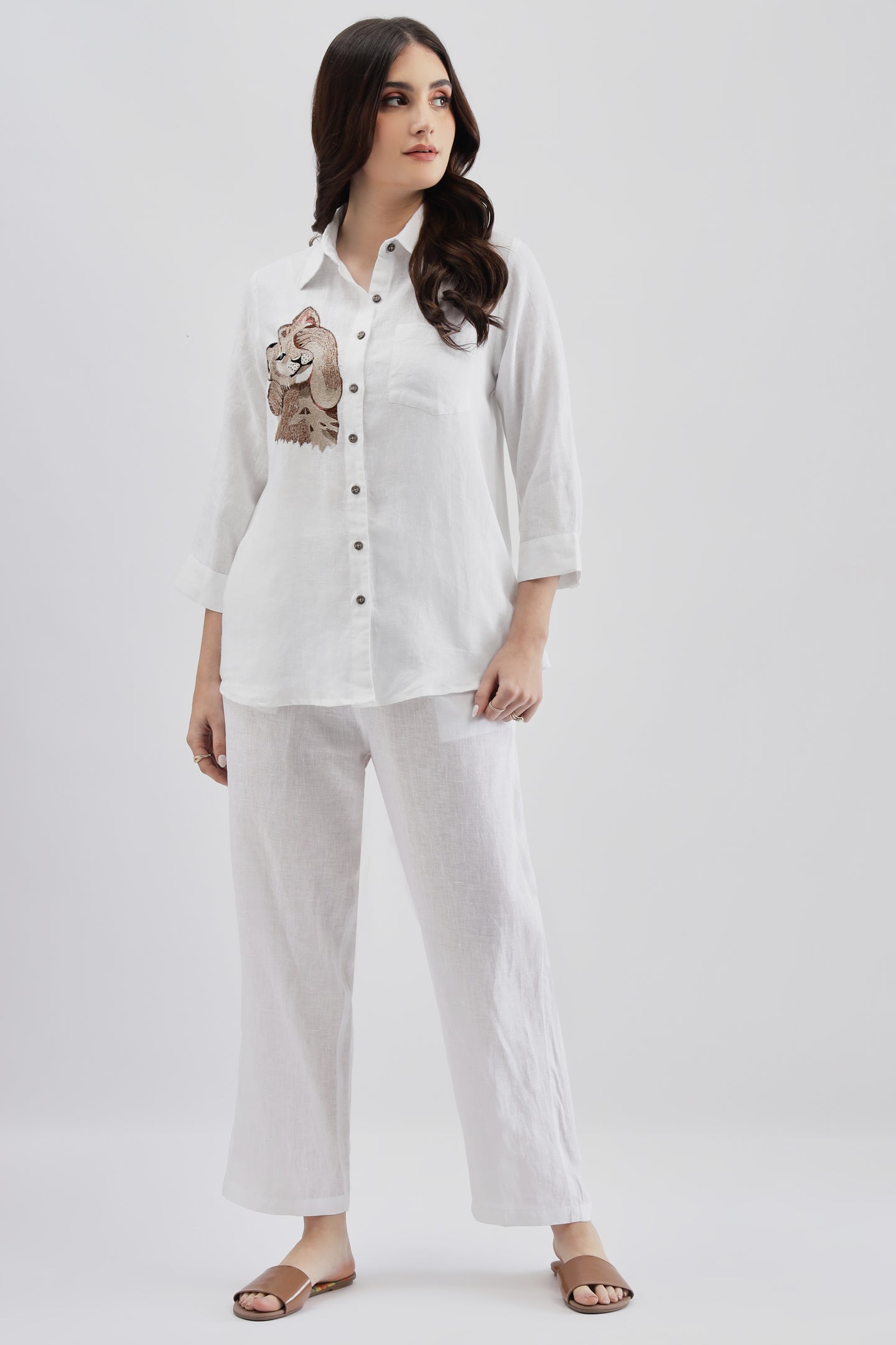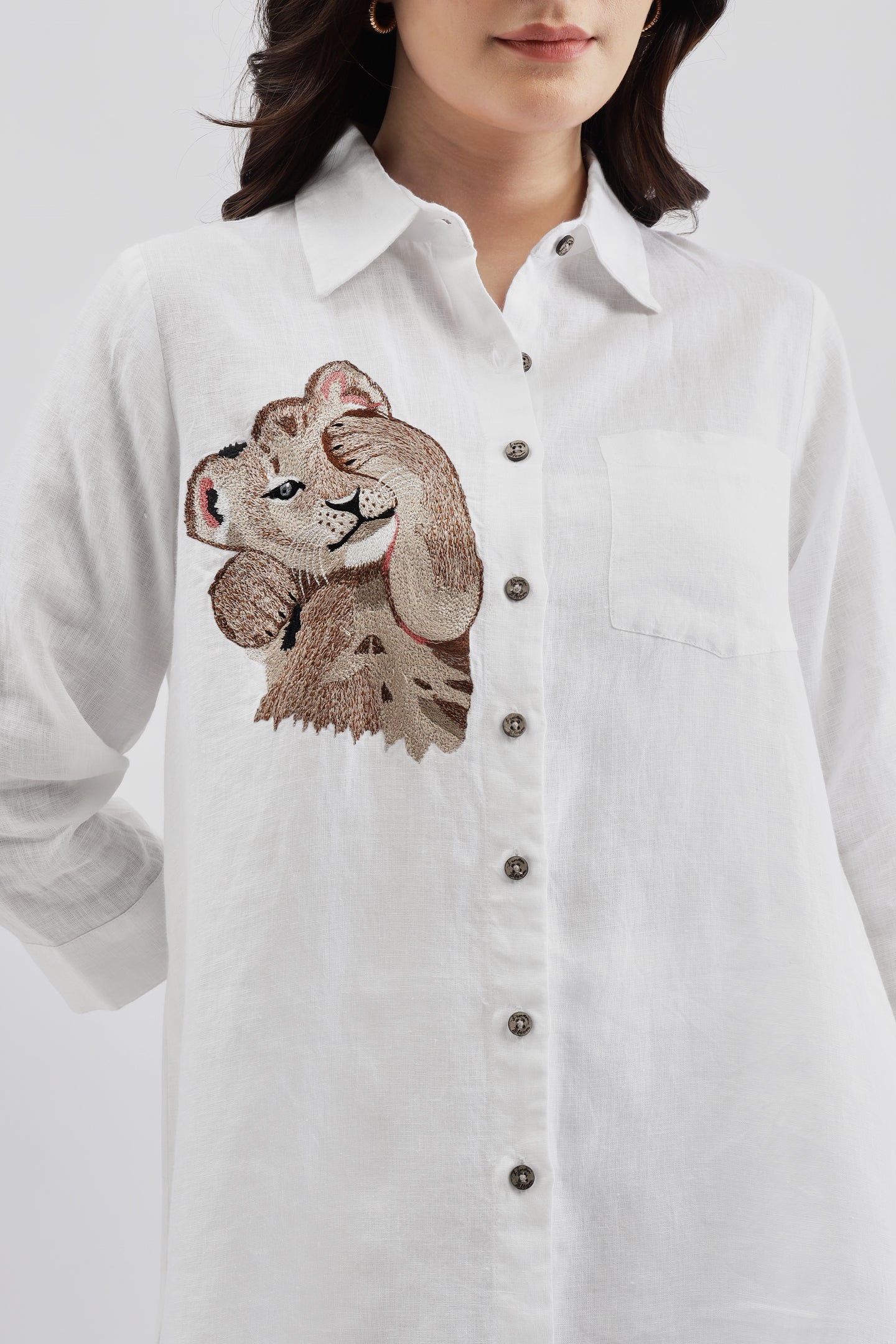 Lion Cub Embroidary Shirt made from soft linen fabric, featuring a cute and playful cub design for a fun and stylish touch.