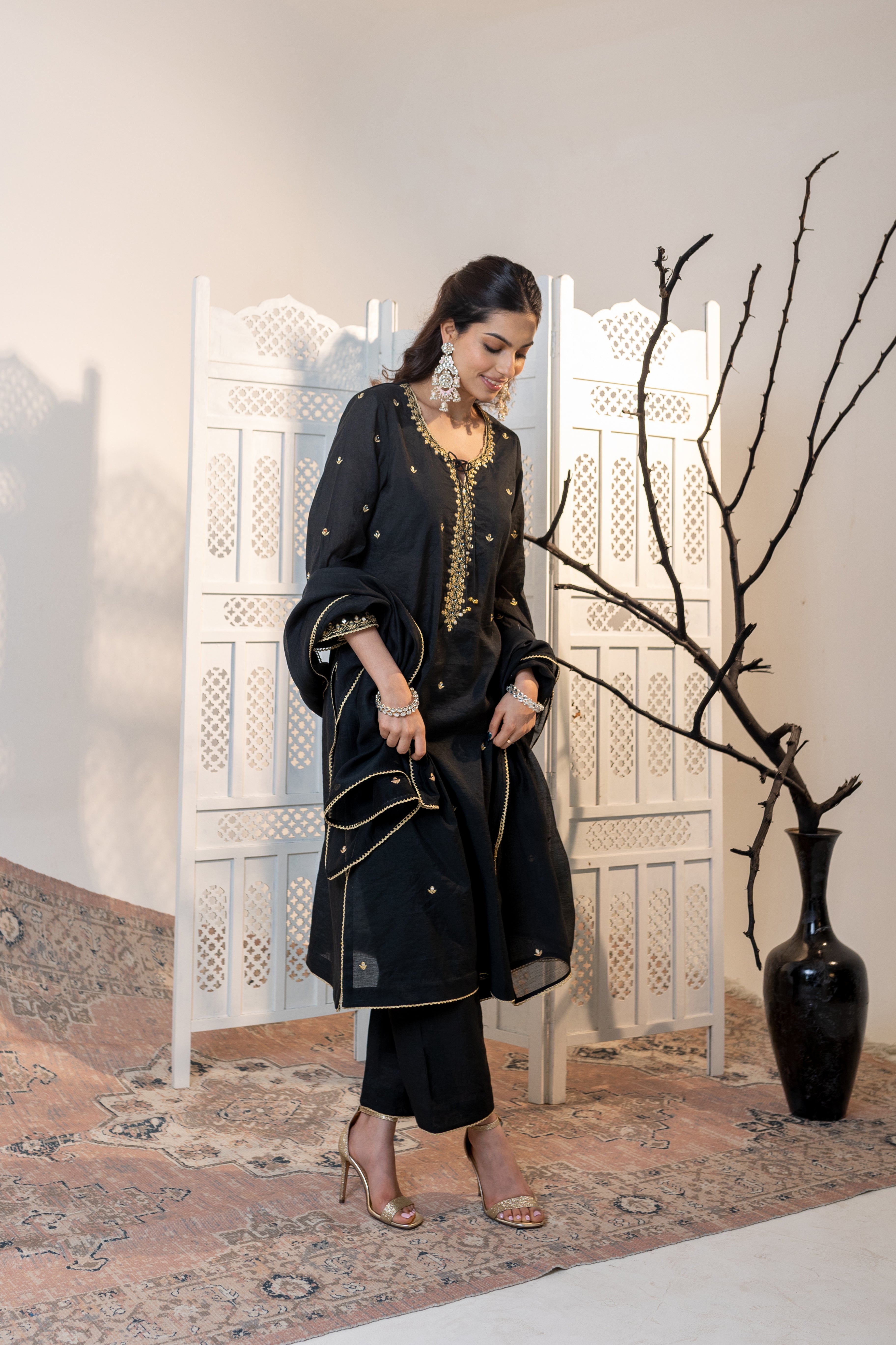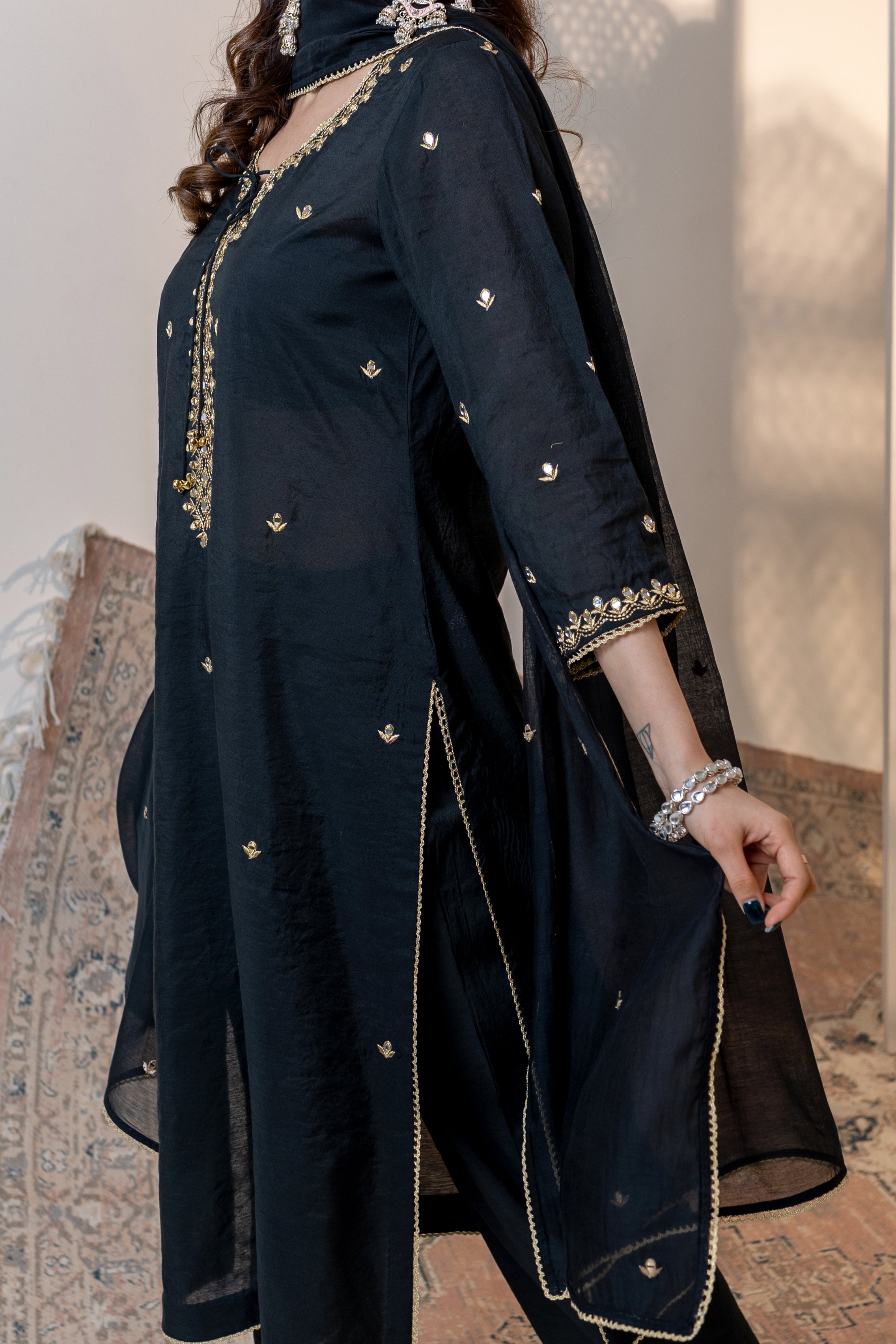 The kurta has mirror work with gold zari work on the neckline, sleeves and scattered all over the shirt & dupatta. Palazzo is elasticated with strings.