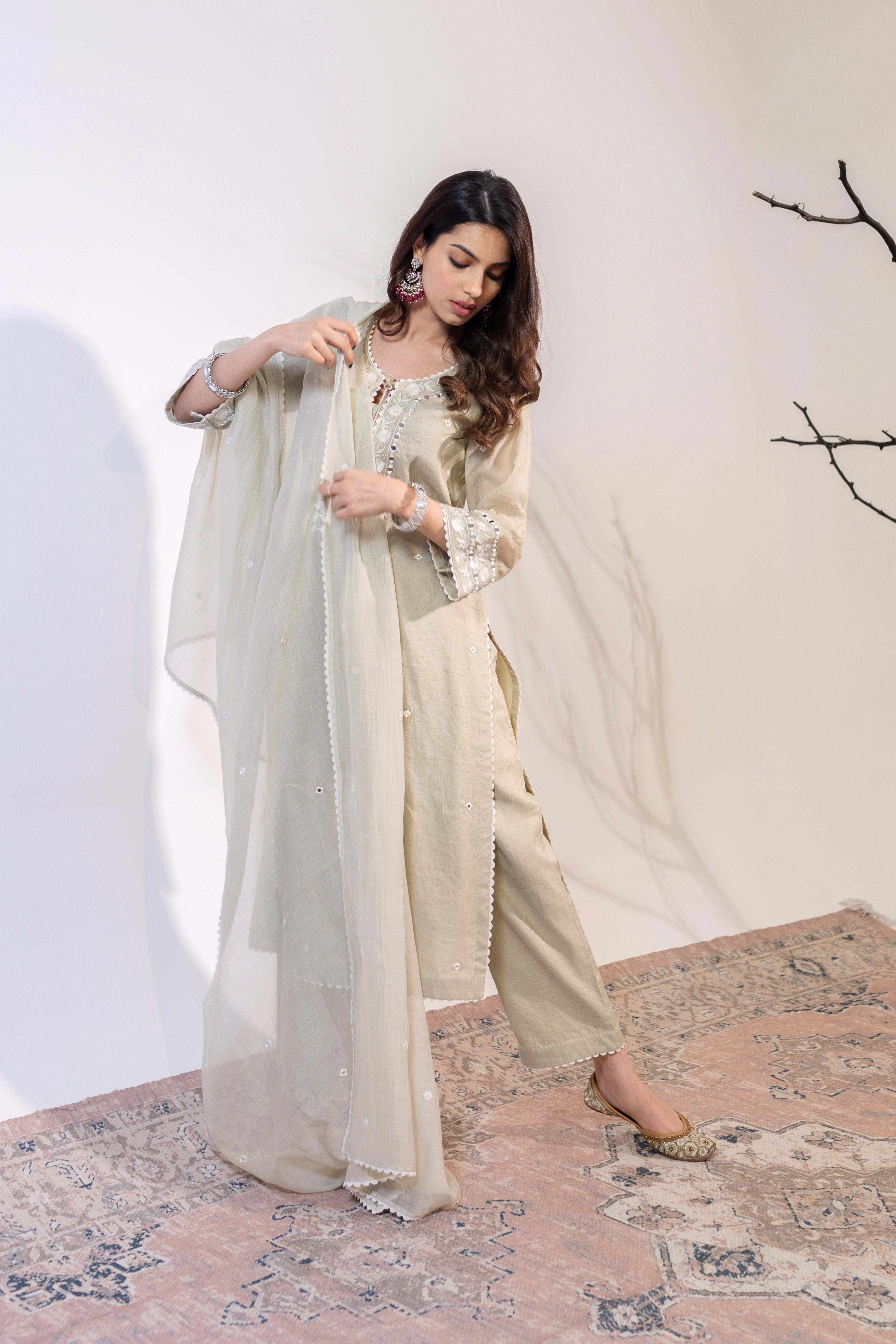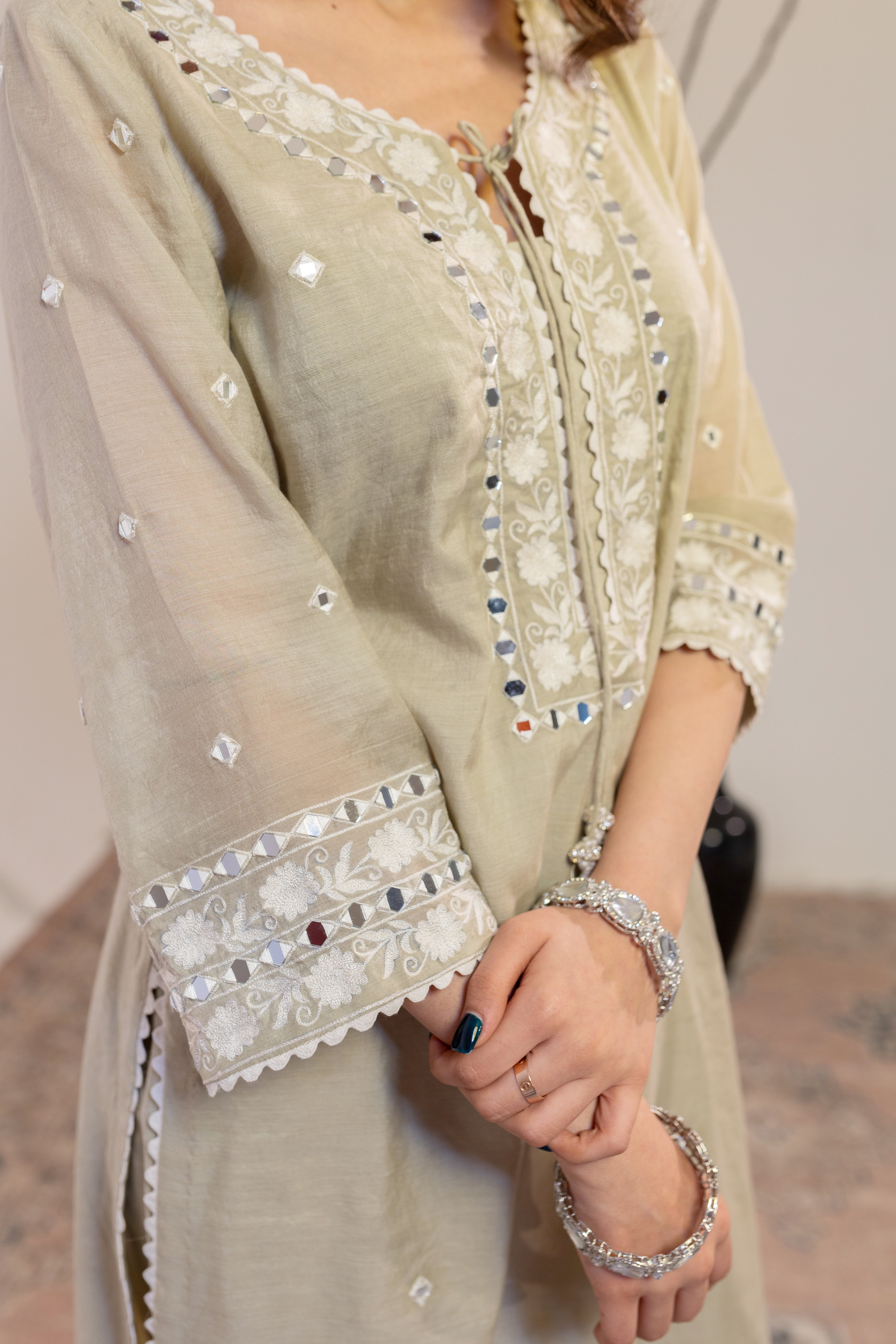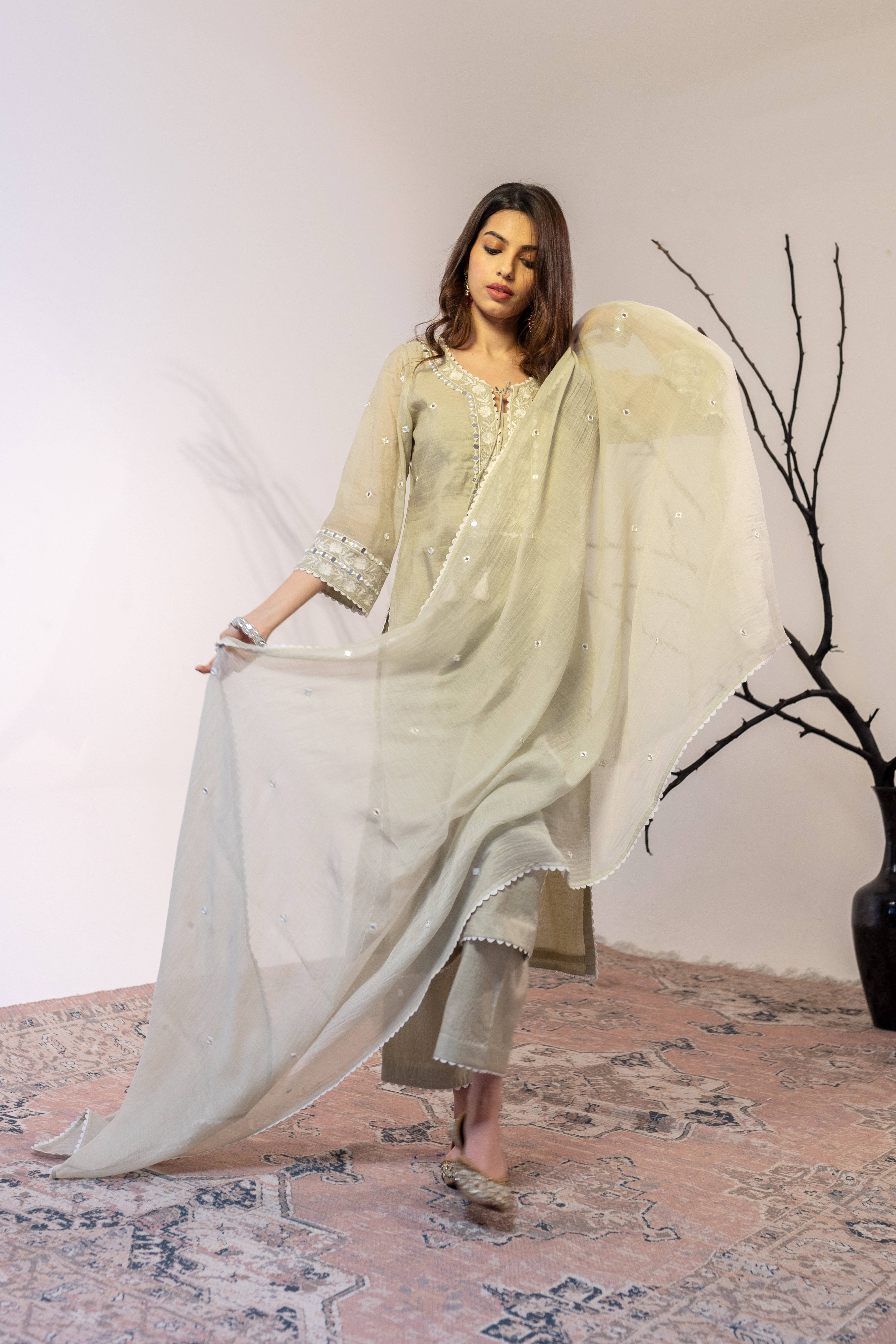 The kurta has mirror work with offwhite threadwork on the neckline, sleeves and scattered all over with a dupatta. Palazzo is elasticated with strings.