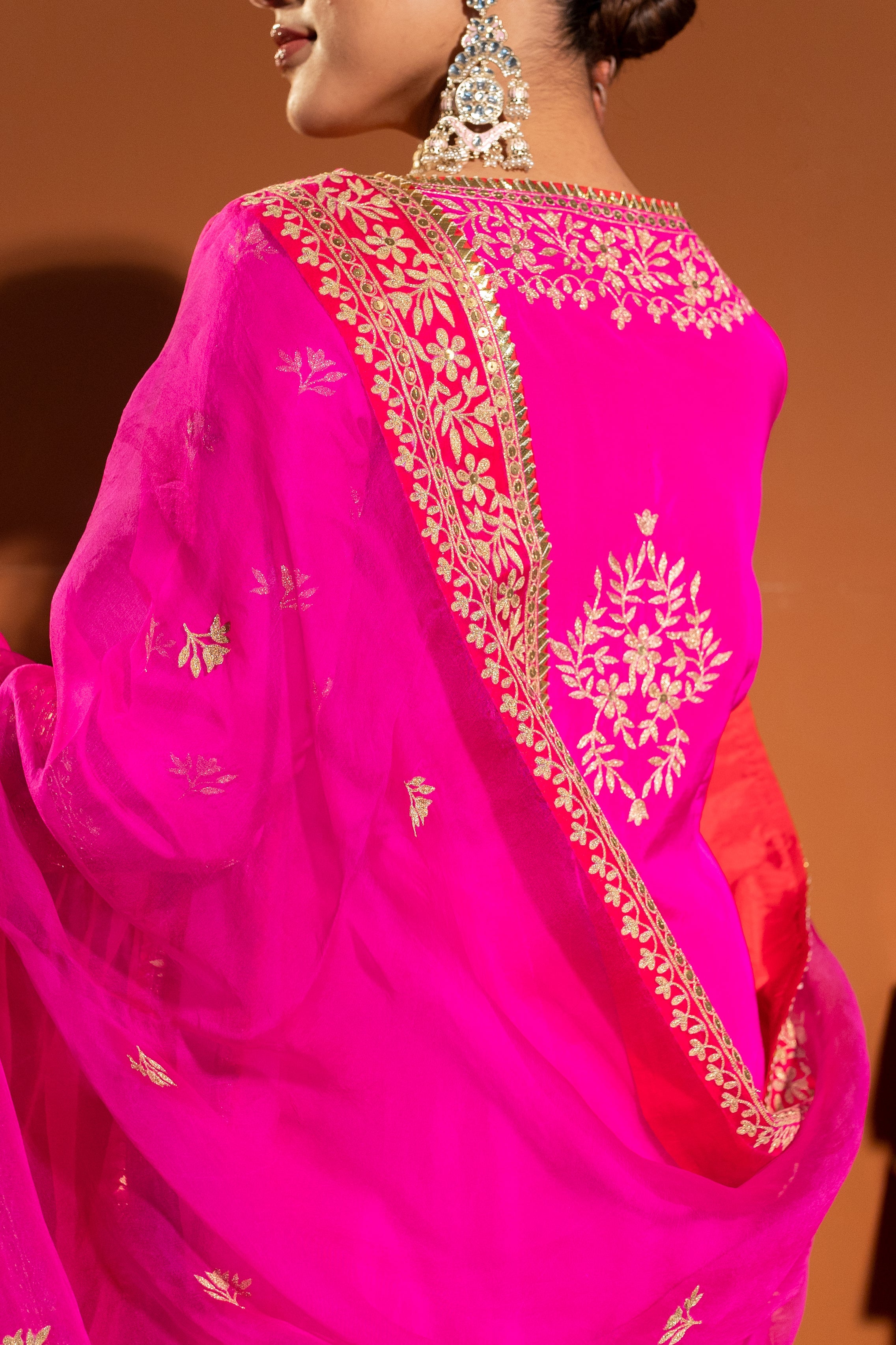 The kurta has gold ari work on the neckline, sleeves and on the palazzo, scattered all over the shirt and dupatta. Palazzo is elasticated with strings.