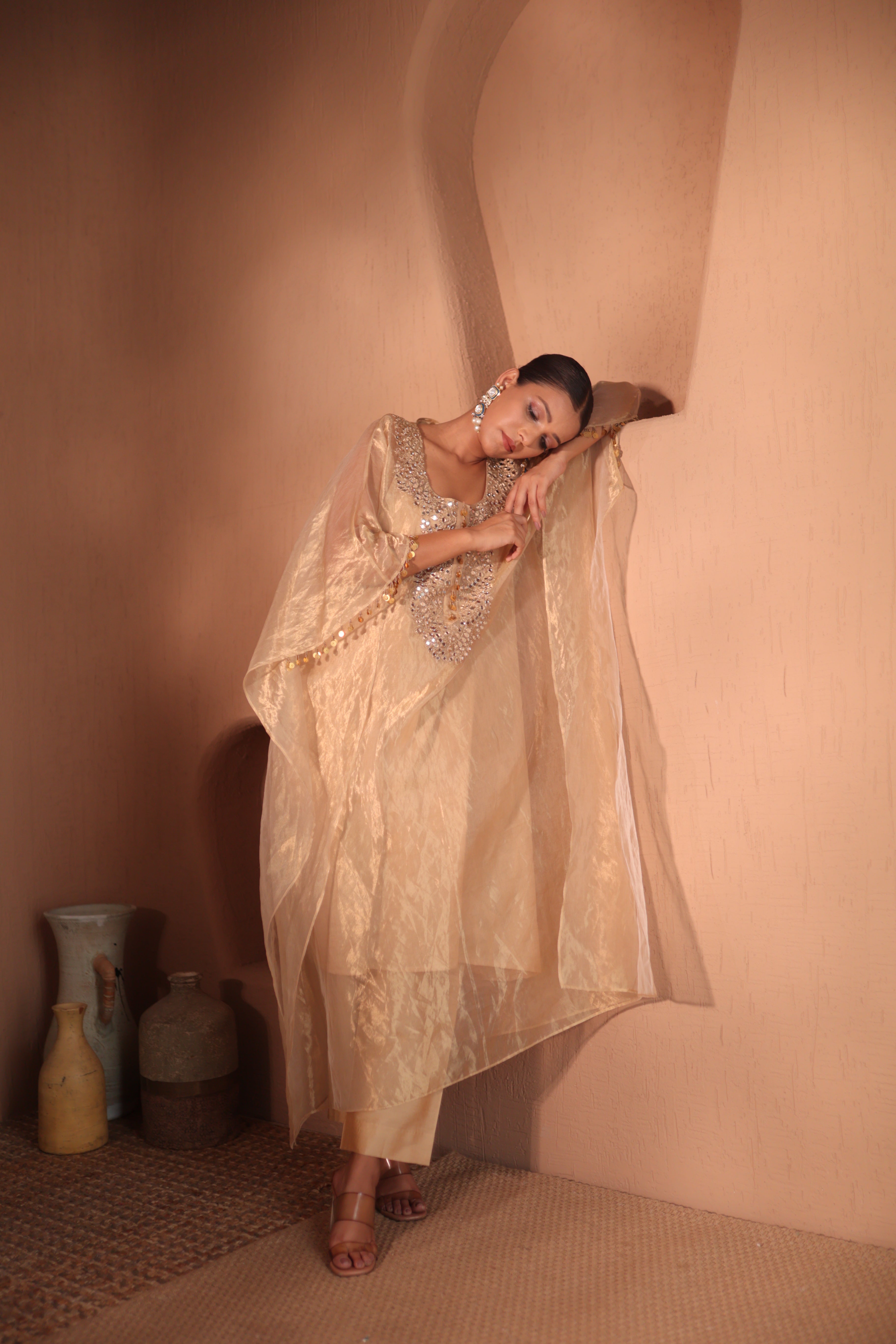 Mirror embroidered kaftan in gold, elasticated pants with strings, comes with a slip.