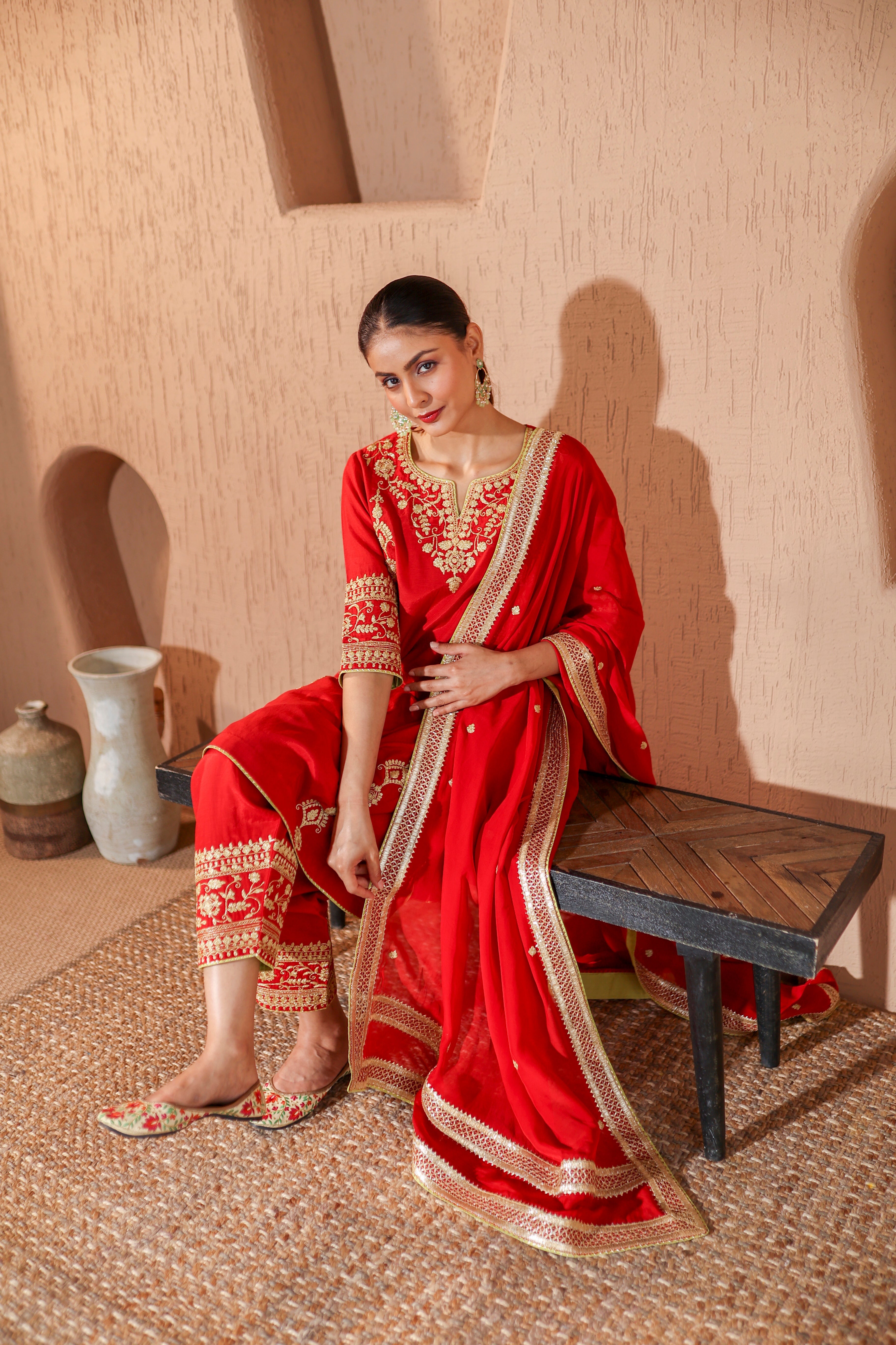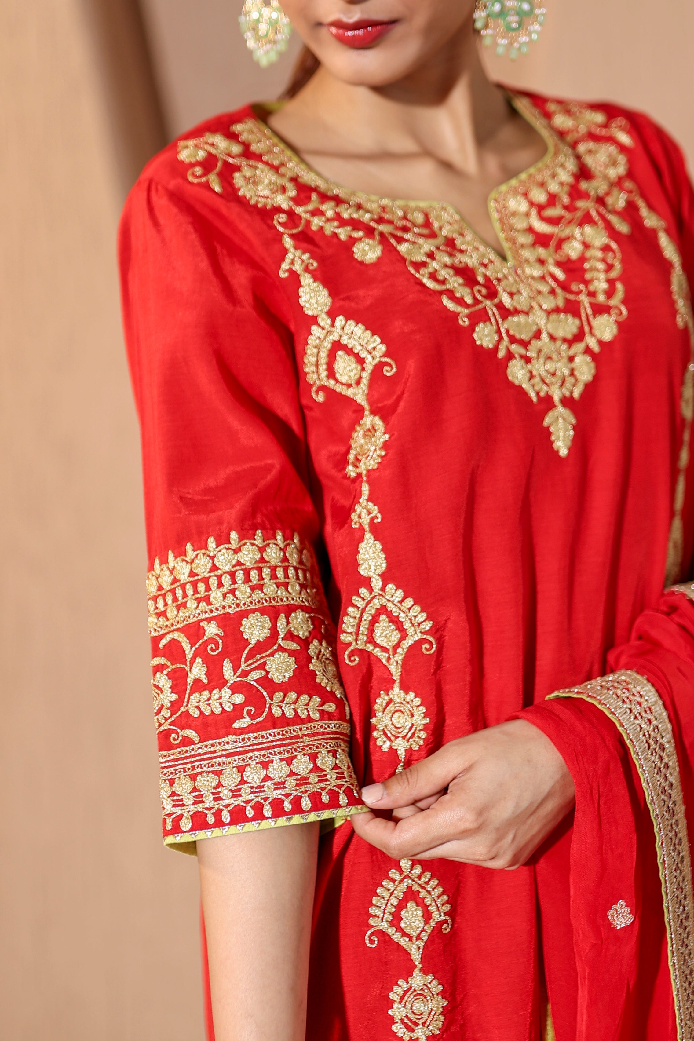 Gold Dori Work All Over the Shirt & Salwar. The whole outfit & Organza dupatta is finished with Lime Green Fabric & Gota
