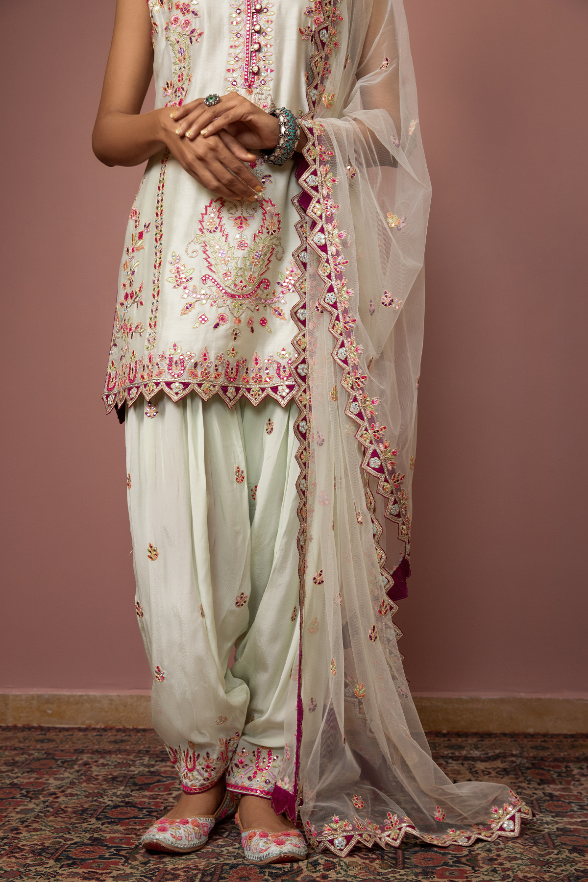 Mint Green Sleeveless Kurta And Salwar Set With Applique,Cutwork,Resham ,Foil Detailing