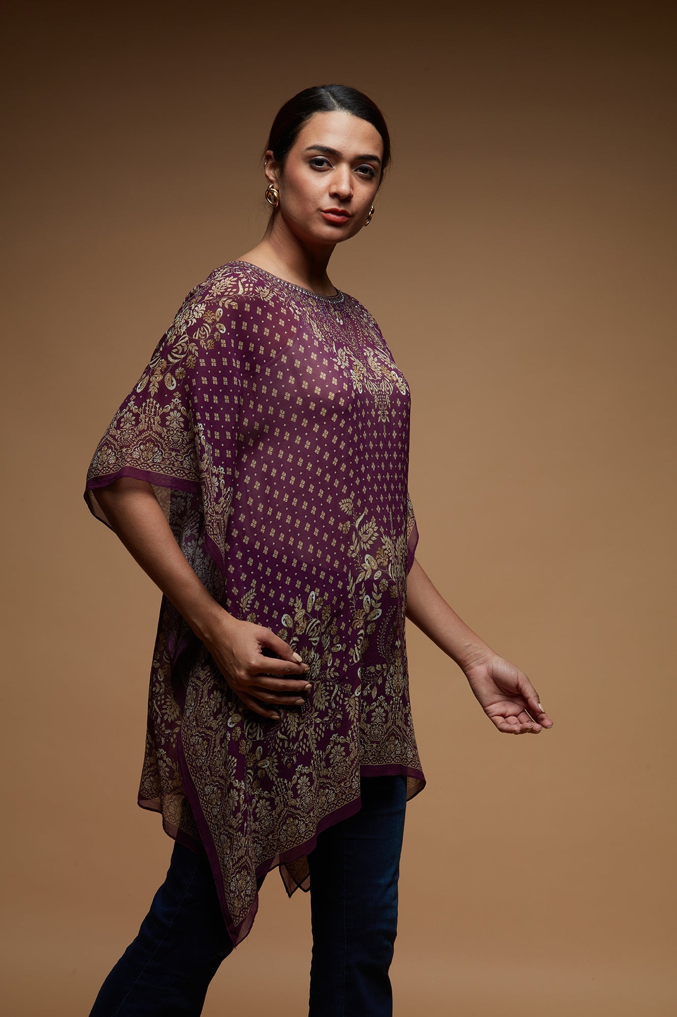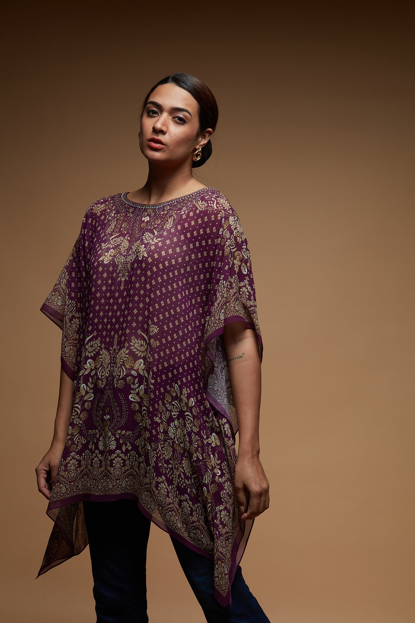 Featuring a digital printed short farasha in ggt ,embroidered with rhinestone.