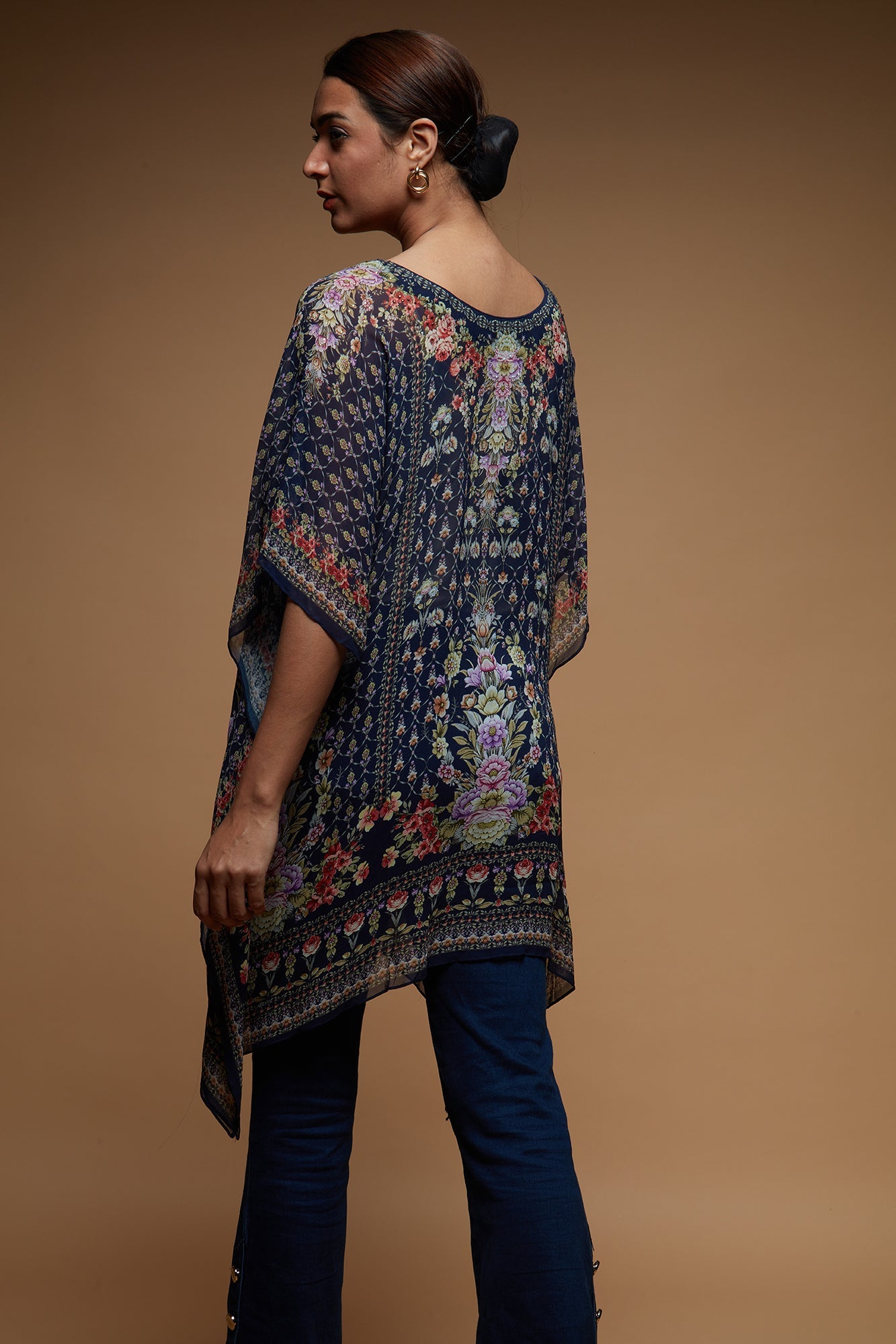 Featuring a short kaftan / farasha with Digital print and embroiderd in swarovski . Can be worn as a tunic or top over tights, jeans, trousers. Perfect attire for casual or occasion. Festive wear collection.