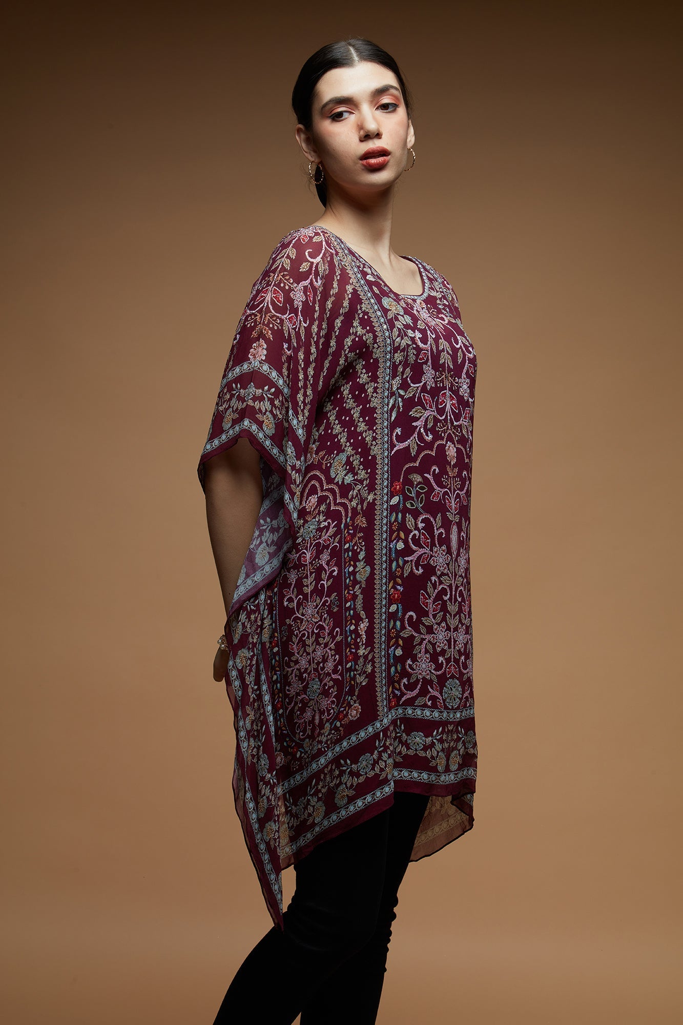 Featuring a Green short kaftan / farasha with Digital print and embroiderd in swarovski . Can be worn as a tunic or top over tights, jeans, trousers. Perfect attire for casual or occasion. Festive wear collection.