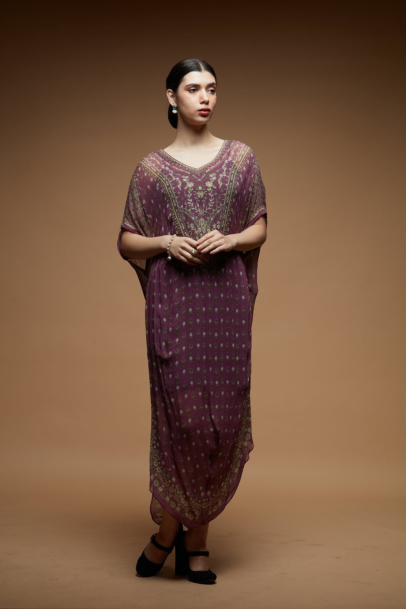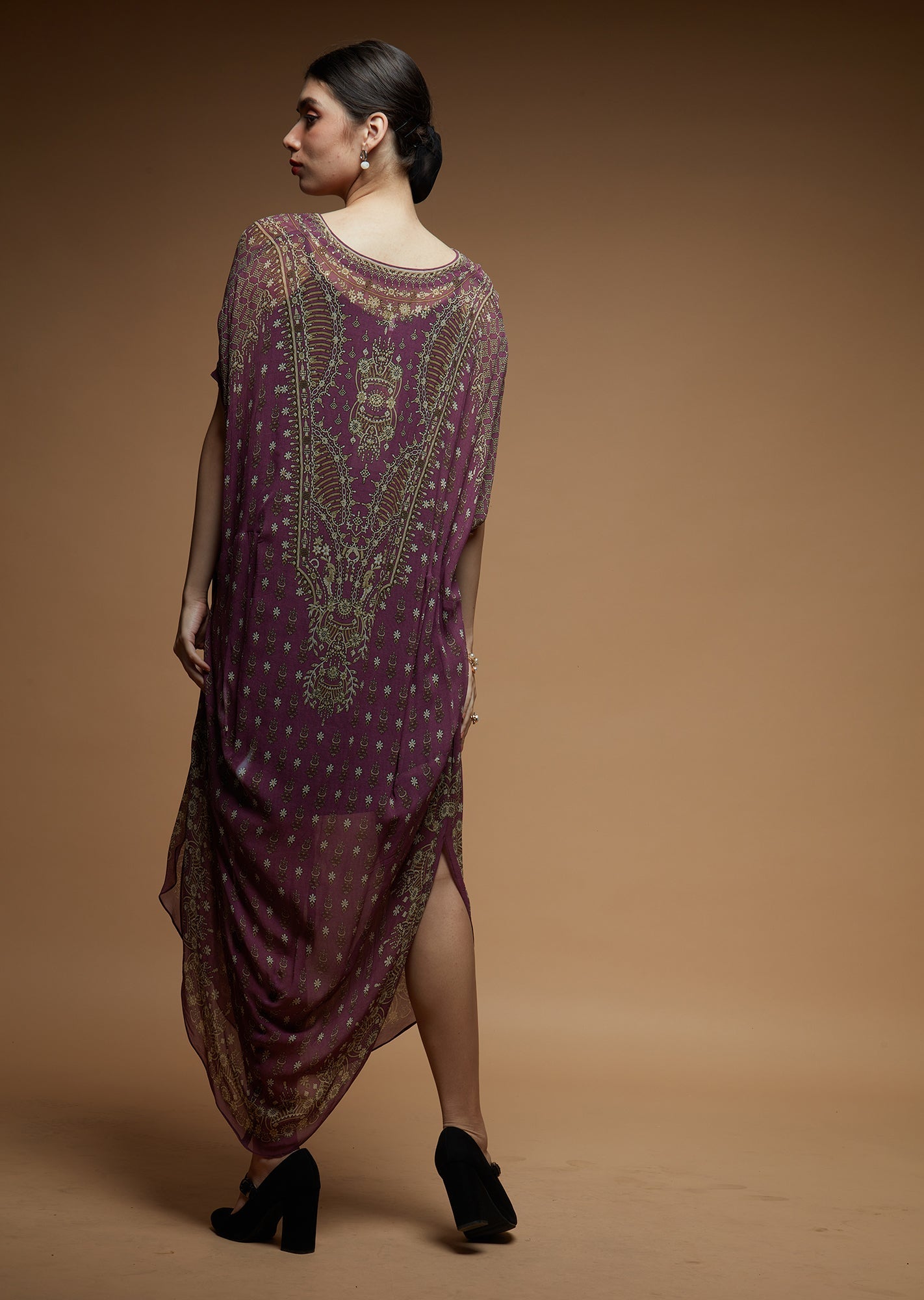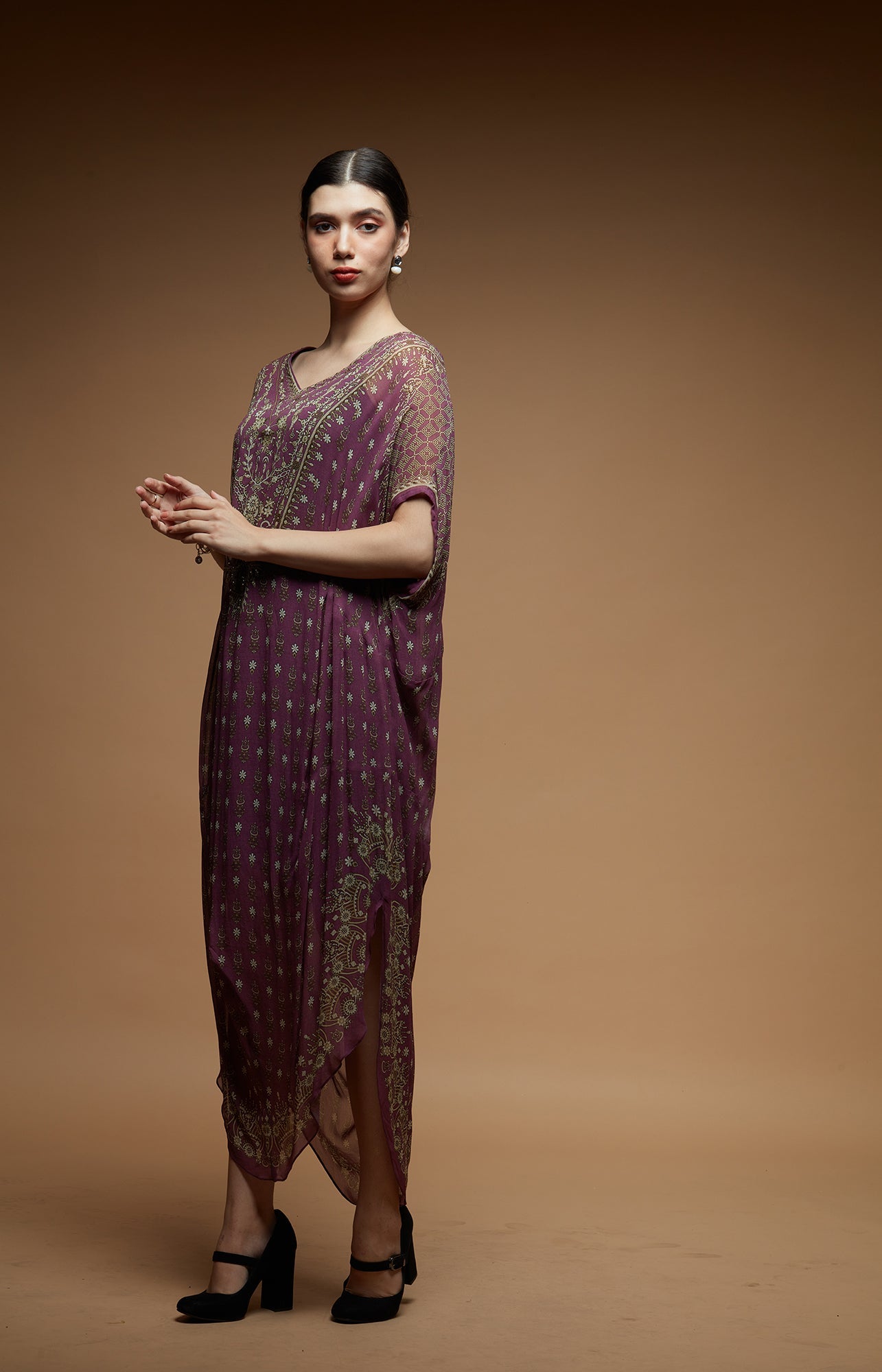 Featuring a BEMBERG GORGETTE tunic with Digital print, It is paired with A JERSEY INNER. The tunic has a good drape ad cowl look at bottom. Accentuate it with dangler earrings and heels for a complete look.