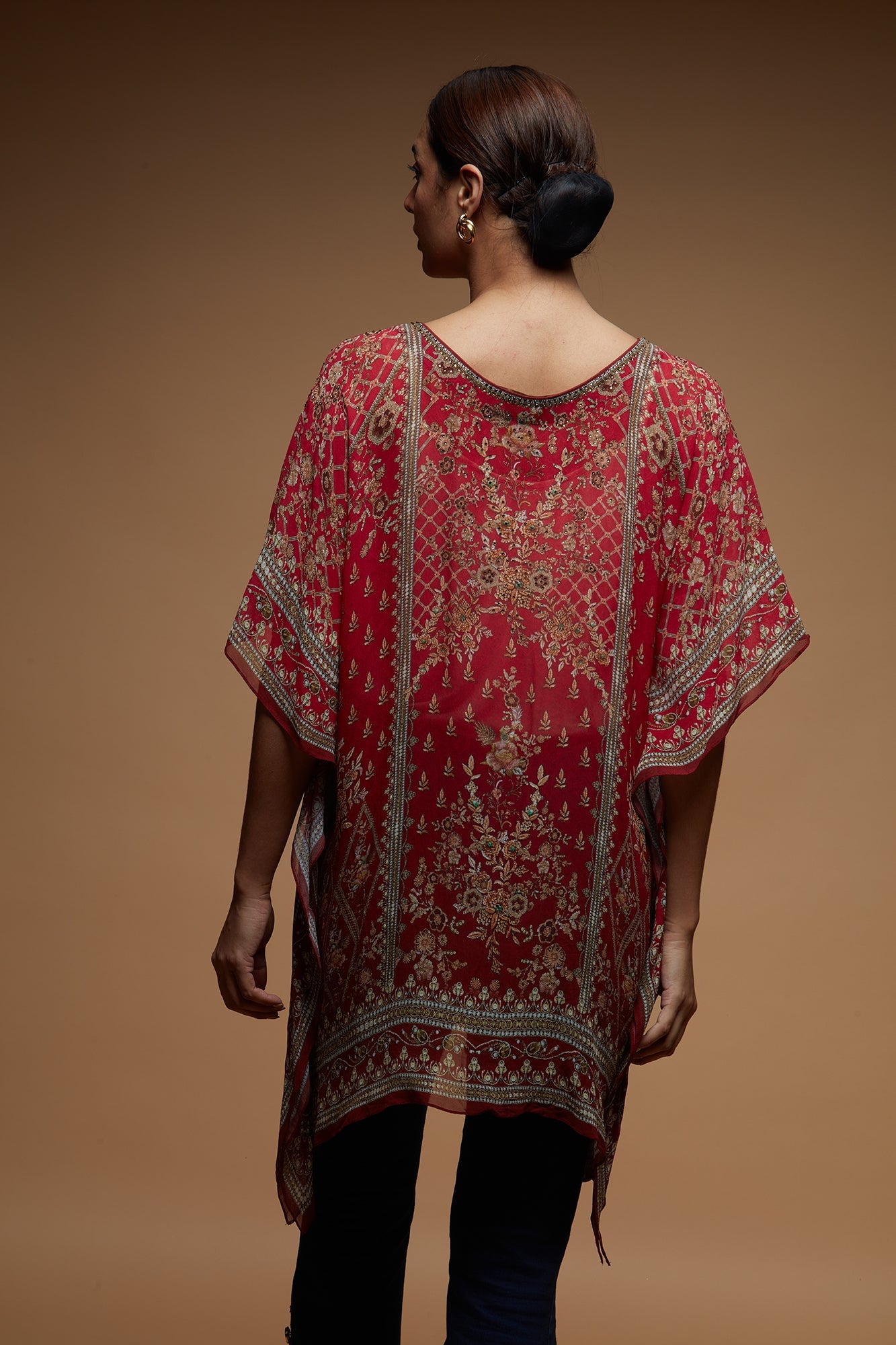 Featuring a digitally printed short farasha in georgette, embellished with rhinestone embroidery.
