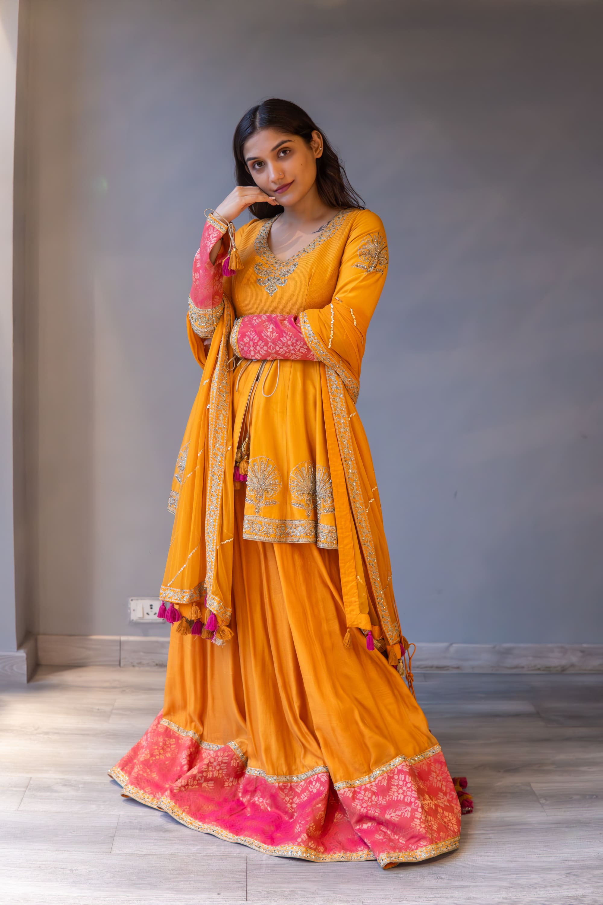Chanderi Hand Embroidered Aari Work V Neck Anarkali with Lehenga