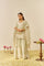 This elegant short straight kurta set is crafted from pure Silk Chanderi fabric, exuding a refined and luxurious appeal. The kurta features a bold, broad deep V-neck at the front, a sophisticated zero-back design, and graceful elbow sleeves, blending contemporary design with classic elegance. It is paired with a delicate Silk Organza dupatta, adding a soft, ethereal touch to the look. The sharara is beautifully designed with a border showcasing intricate jaal work, enhancing the overall grace of the ensemble. Adorned with intricate Parsi Gara embroidery, the outfit is further highlighted with fine Tilla, Gota, and Basra Moti embellishments, which add depth and richness. The sleeves of the kurta are elegantly finished with pearls, adding a refined touch of sophistication. To complete the look, the entire outfit is finished with delicate scallop detailing, adding a perfect finishing touch of elegance and charm to this stunning creation.