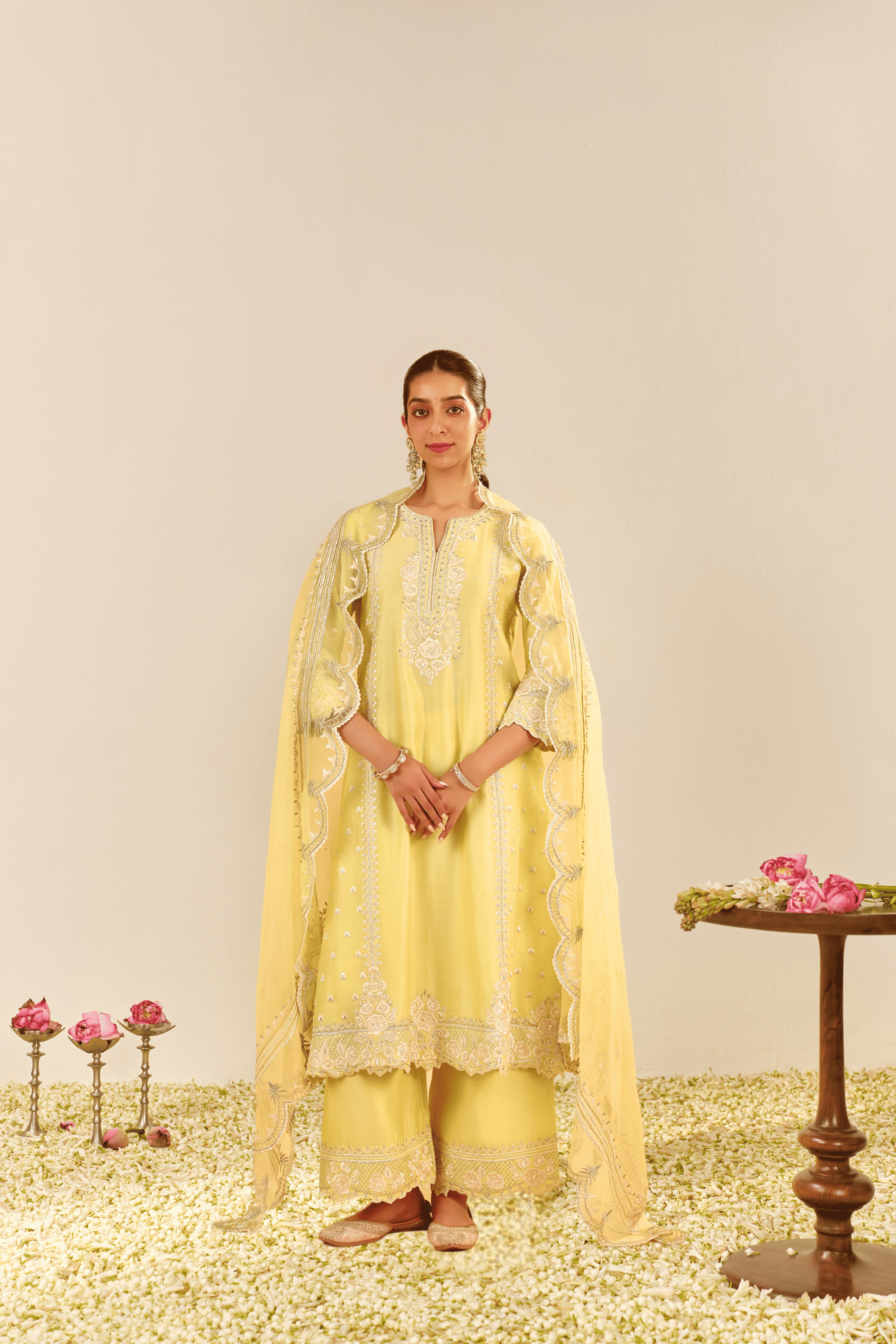 This elegant long A-line ensemble is crafted from pure Silk Chanderi fabric, offering a luxurious and graceful drape. It is beautifully paired with a stylish palazzo and a delicate Silk Organza dupatta, adding an ethereal touch to the look. The outfit features a contemporary zero-neck design with a slit and three-quarter sleeves, blending modern aesthetics with timeless charm. Adorned with intricate Parsi Gara embroidery, the ensemble is highlighted with fine Tilla, Gota, and Basra Moti embellishments, adding richness and depth to the design. The sleeves of the kurta are finished with detailed pearls, providing a refined and sophisticated touch. The entire outfit is completed with scallop detailing, which enhances the overall elegance. The dupatta is also finished with scallop embroidery, perfectly complementing the ensemble and adding an extra layer of finesse. This stunning creation exudes grace, opulence, and attention to detail.