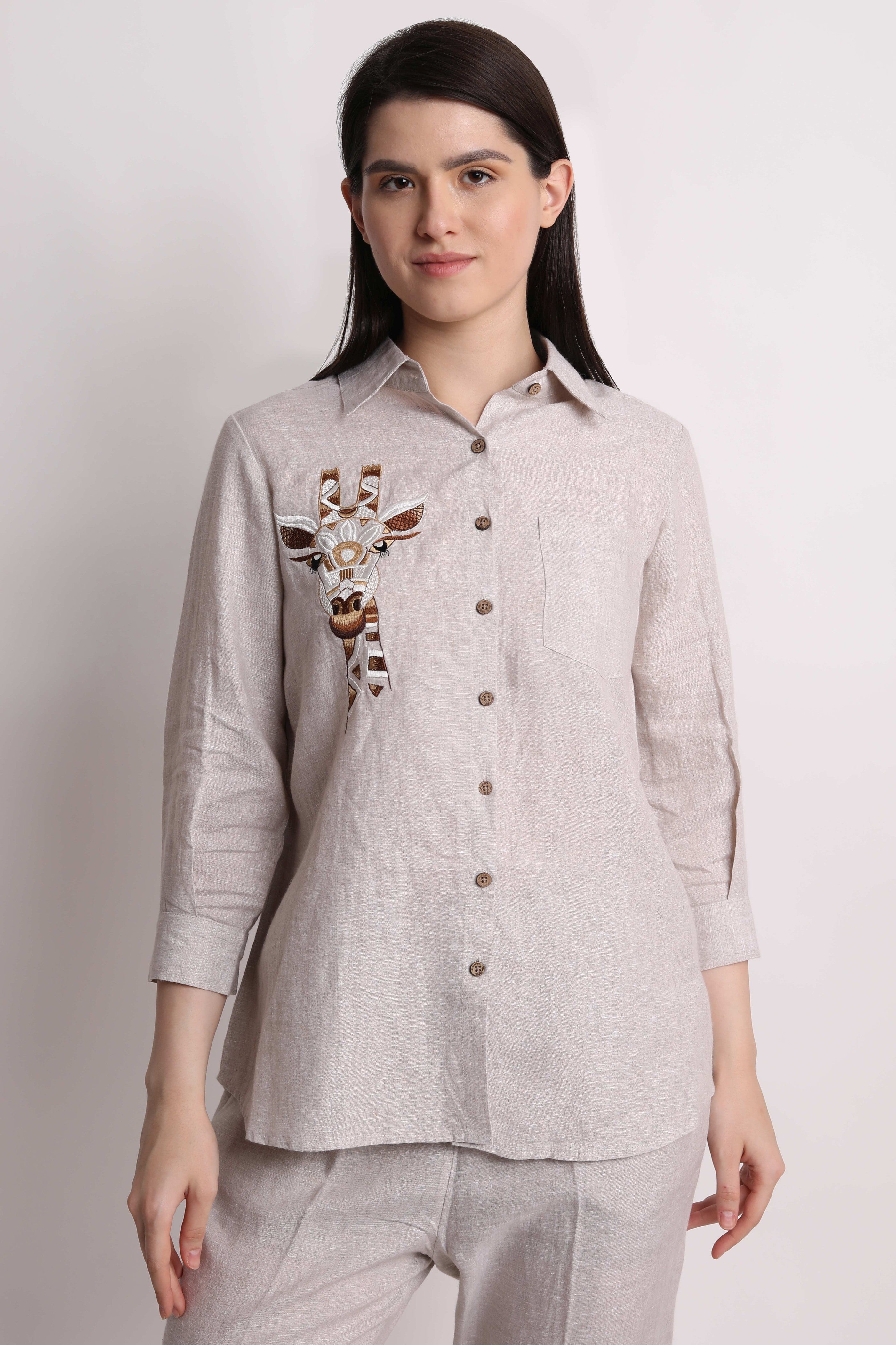 Beige Giraffe Embroidery Shirt