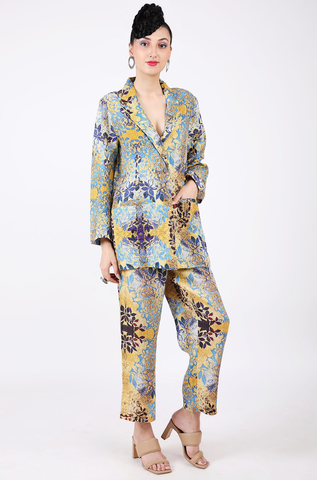 Digital Print Blazer And Pants With Elasticated Back Made In 100% Linen With Super Soft Hand Feel And Relaxed Fit.