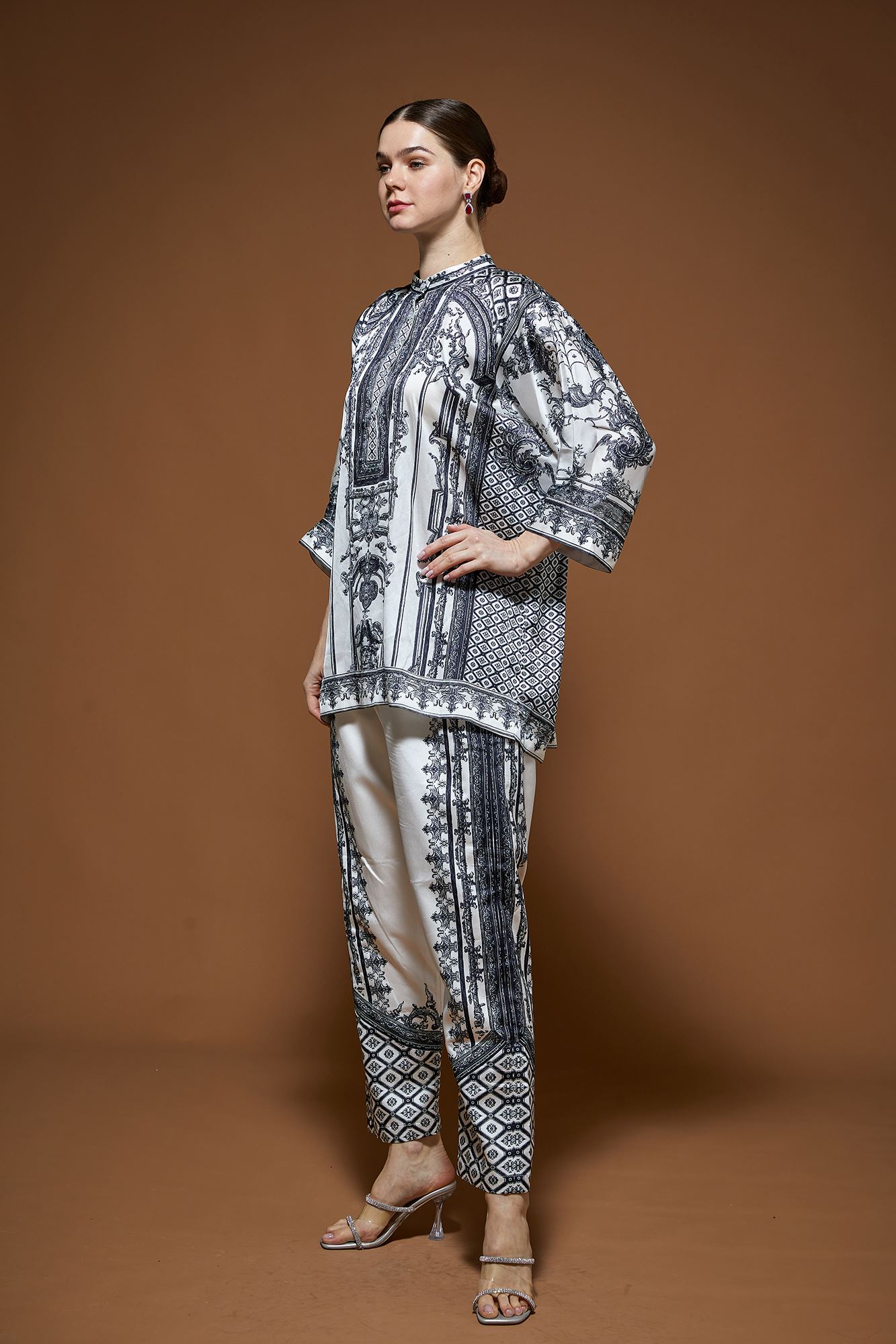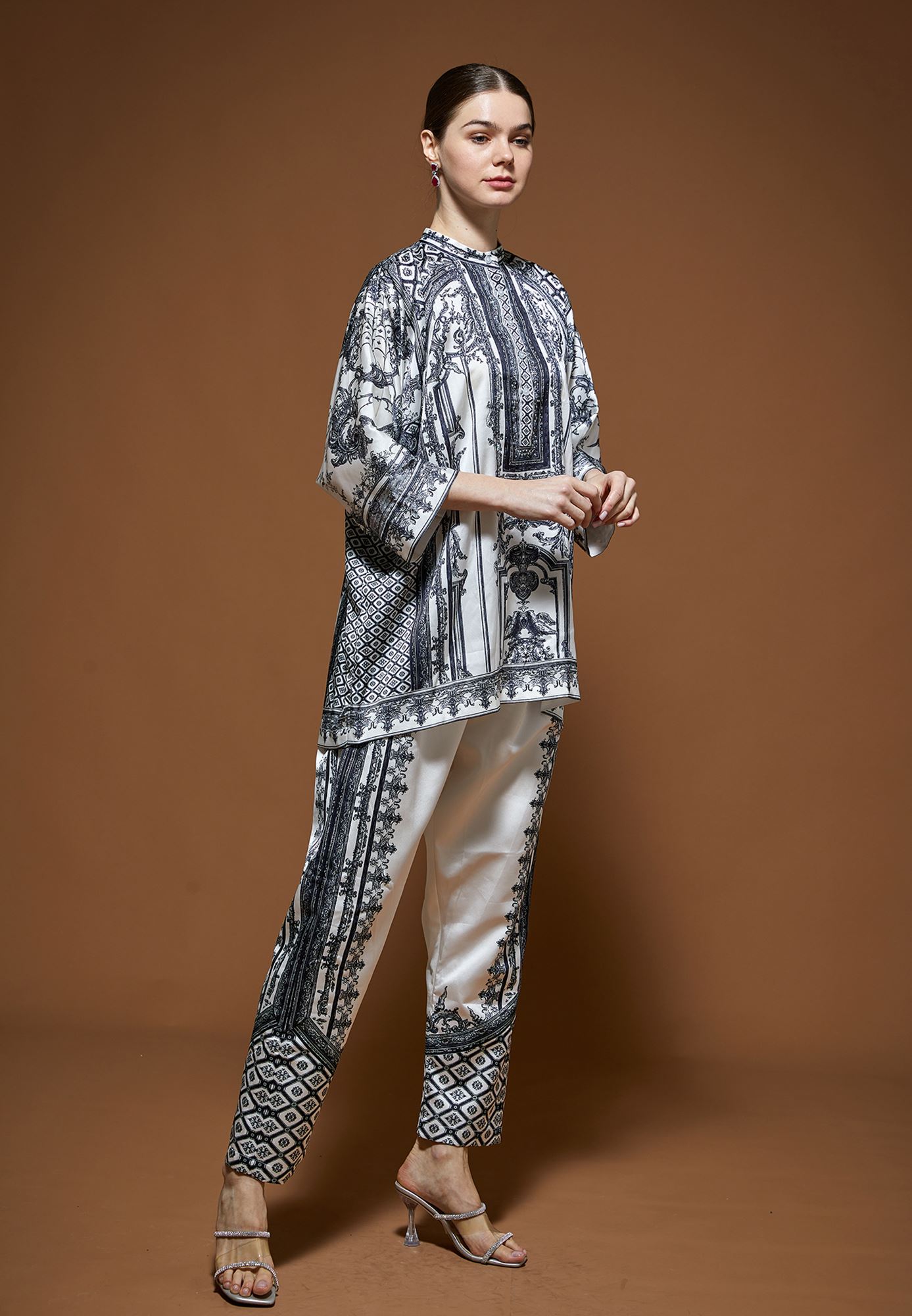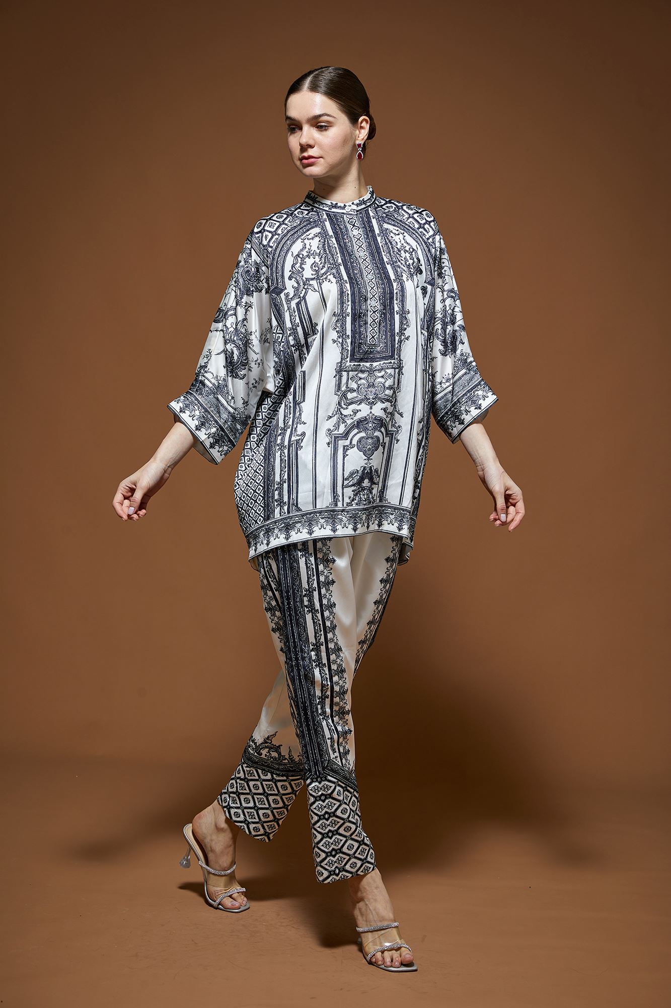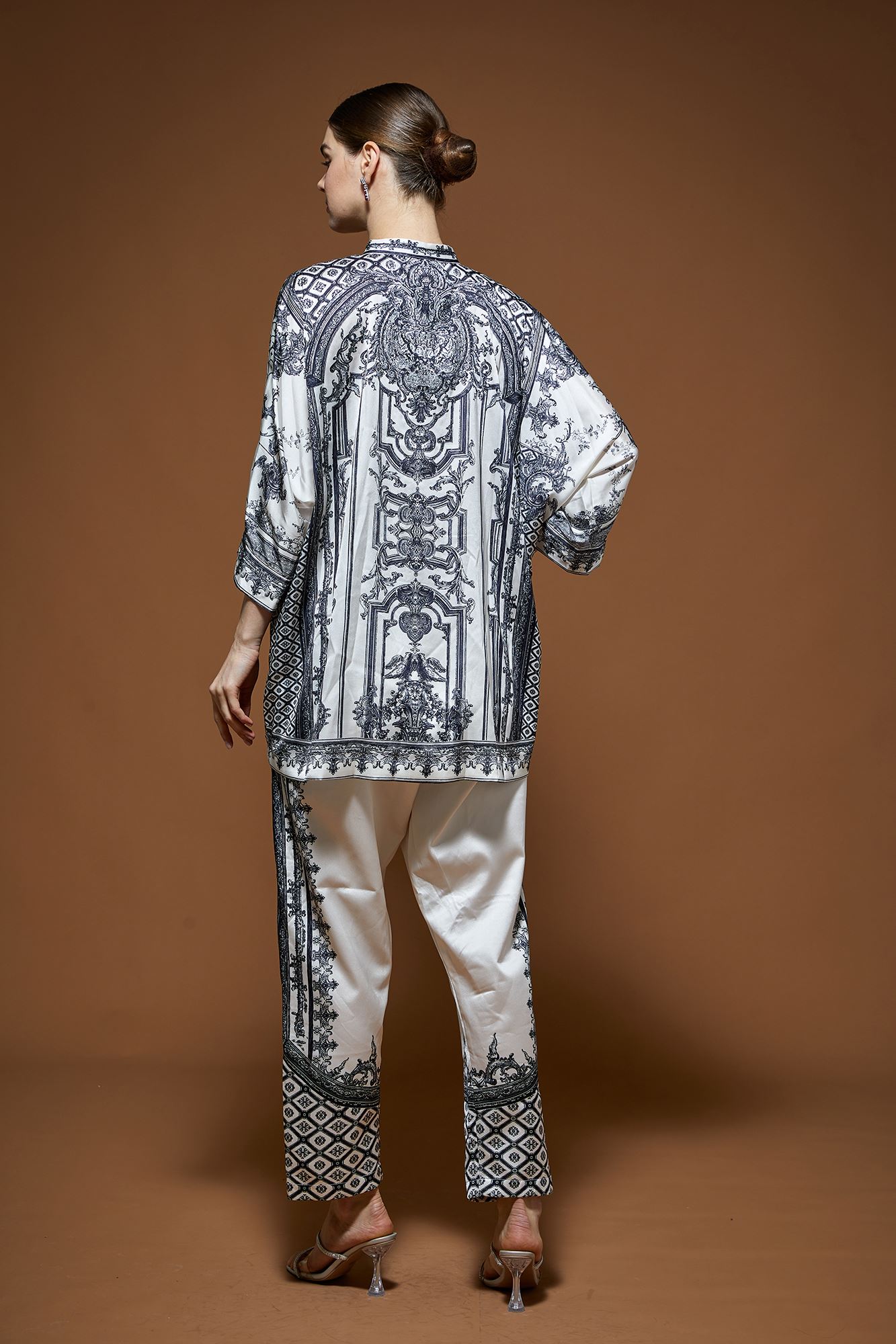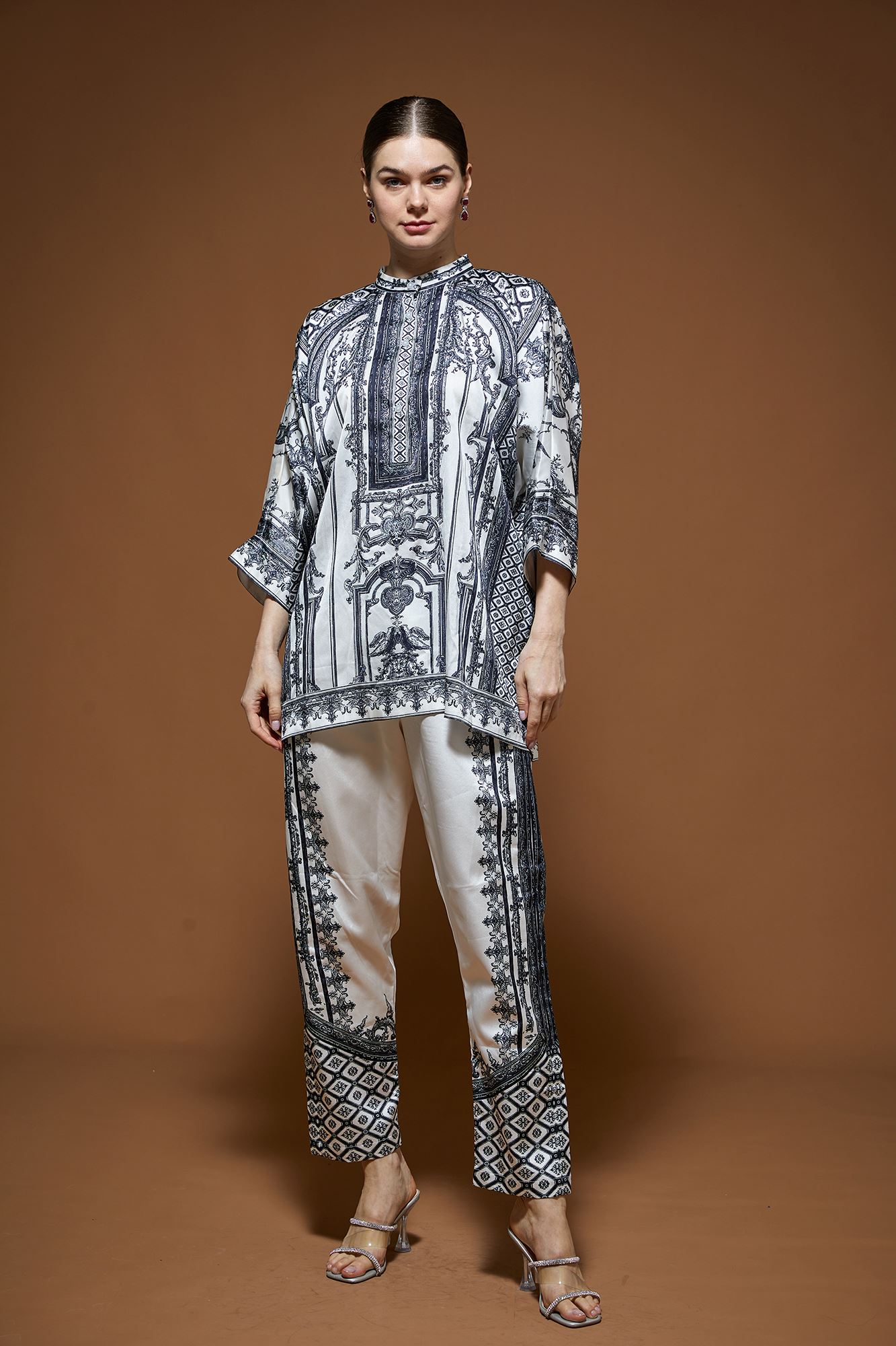 Featuring a baroque printed kurta in satin base with digital print. It is paired with pyjama pants. Accentuate with dangler earrings and heels for festive occasions.