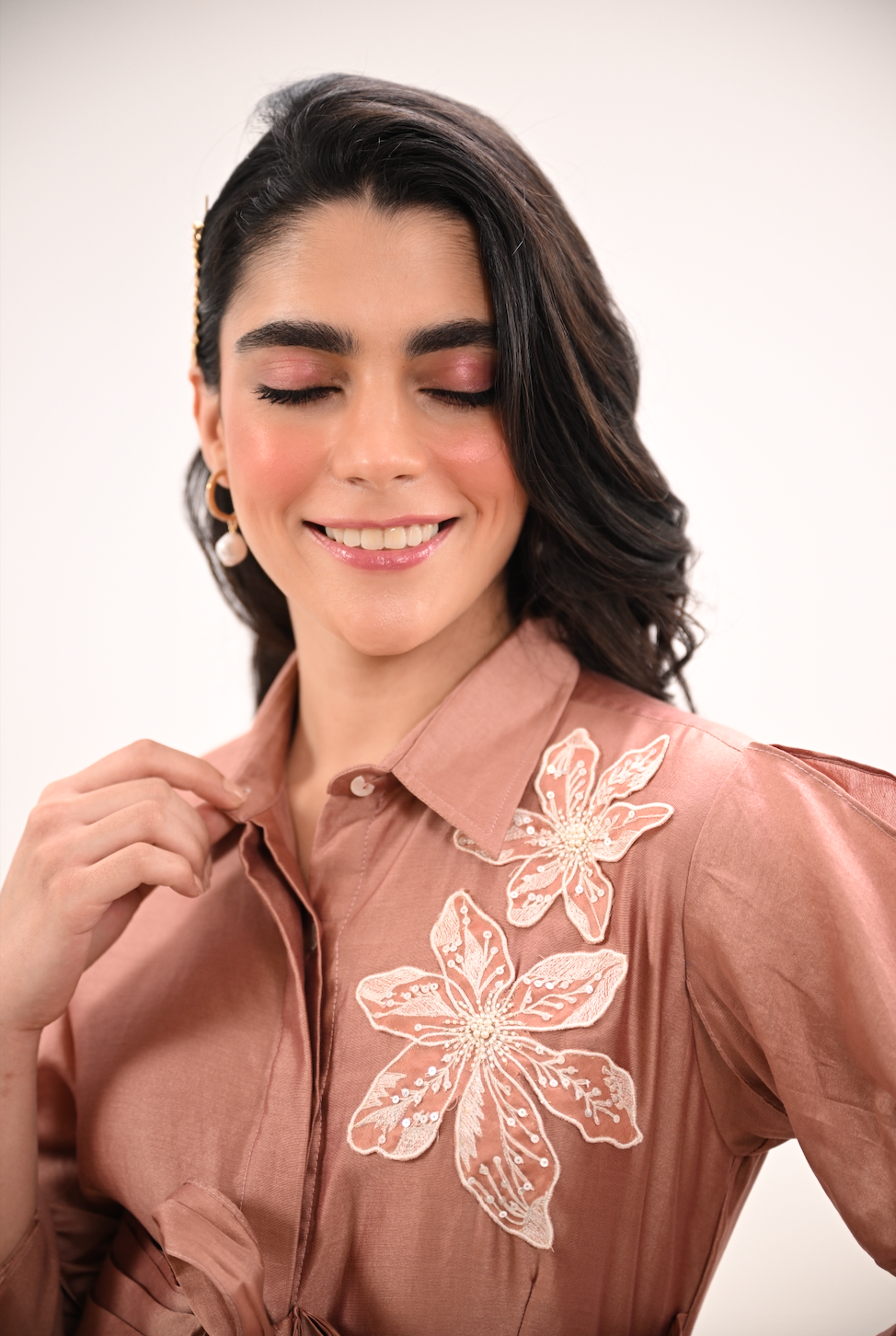 A cinnamon-toned coord set featuring ruched statement sleeves, a flattering tie-up waist, and a bold floral appliqué. Smart, soft, and designed for when structure meets effortless femininity.