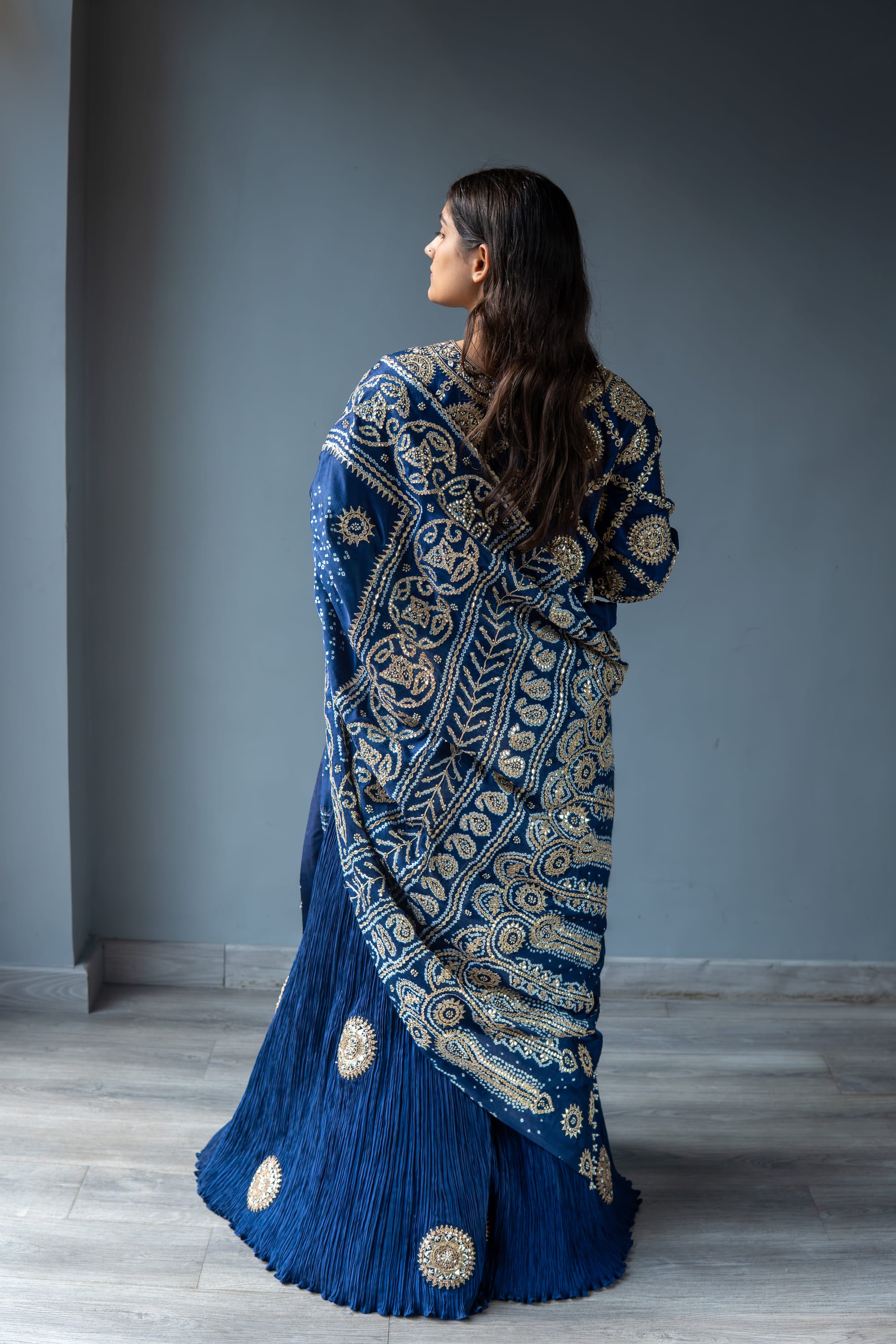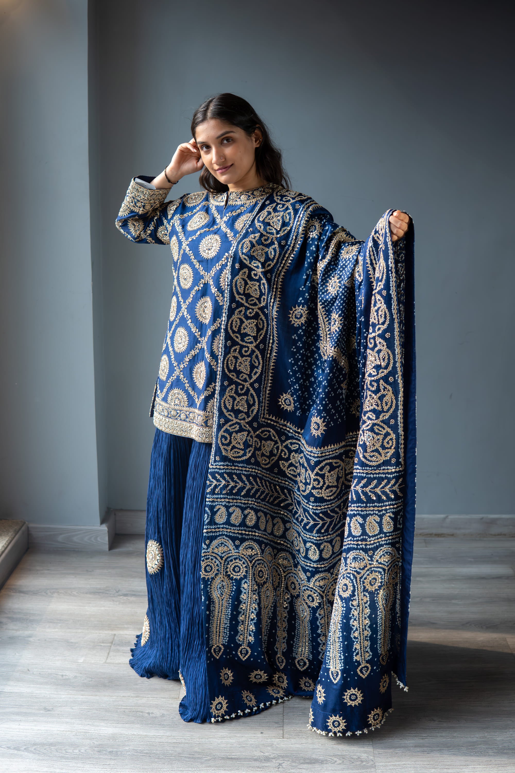 Featuring ink blue kurta in dupion silk base. It is paired with sharara pants and a ajrakh bandhani dupatta