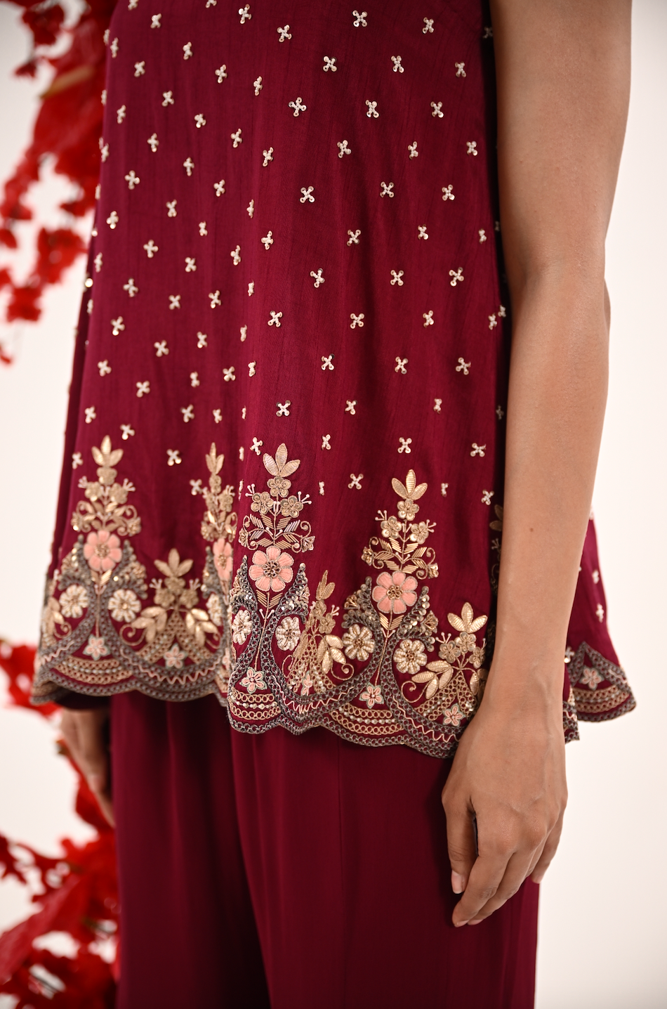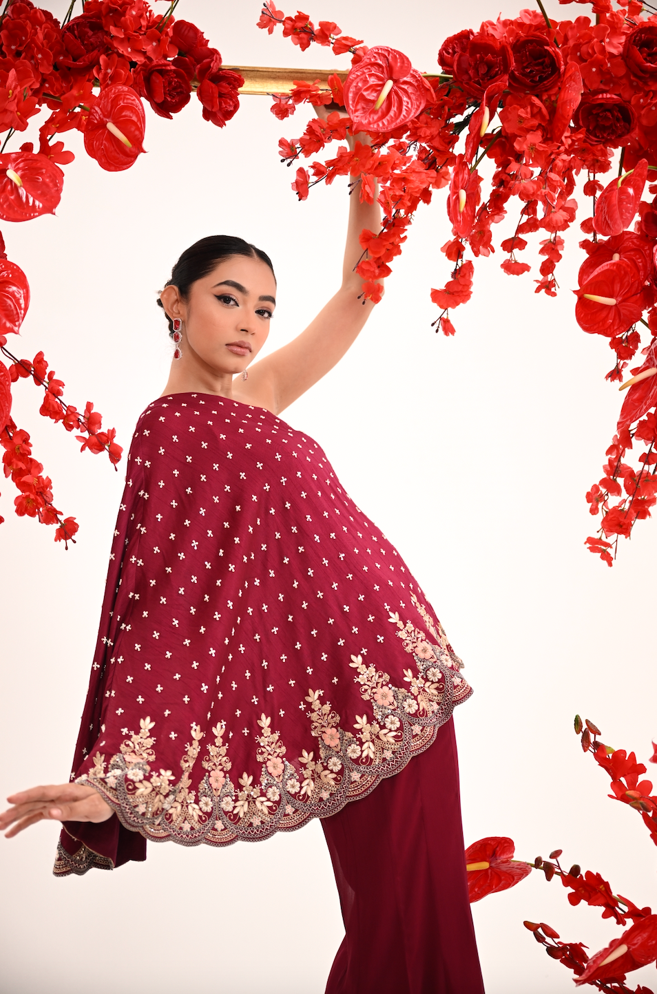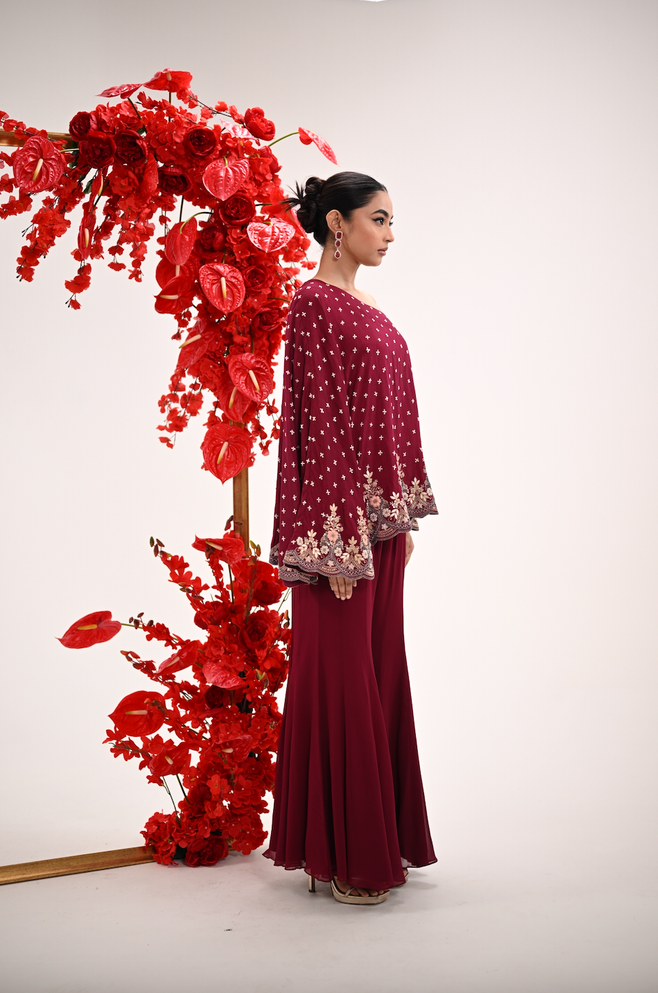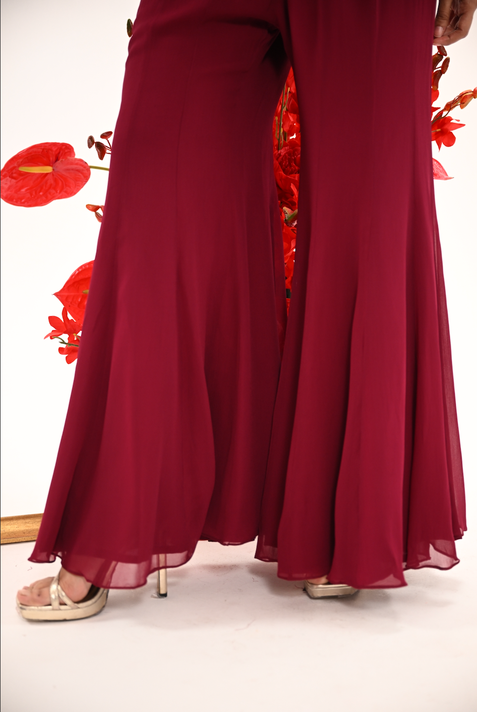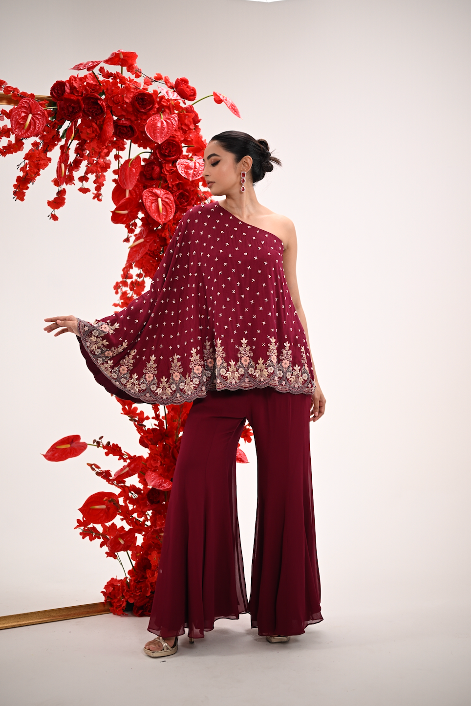 A one-shoulder marcella flare set with a heavily hand-embroidered hem and flared pants that bring the drama. Bold yet elegant, this look is made for statement moments — whether it’s a cocktail night or a modern sangeet.
