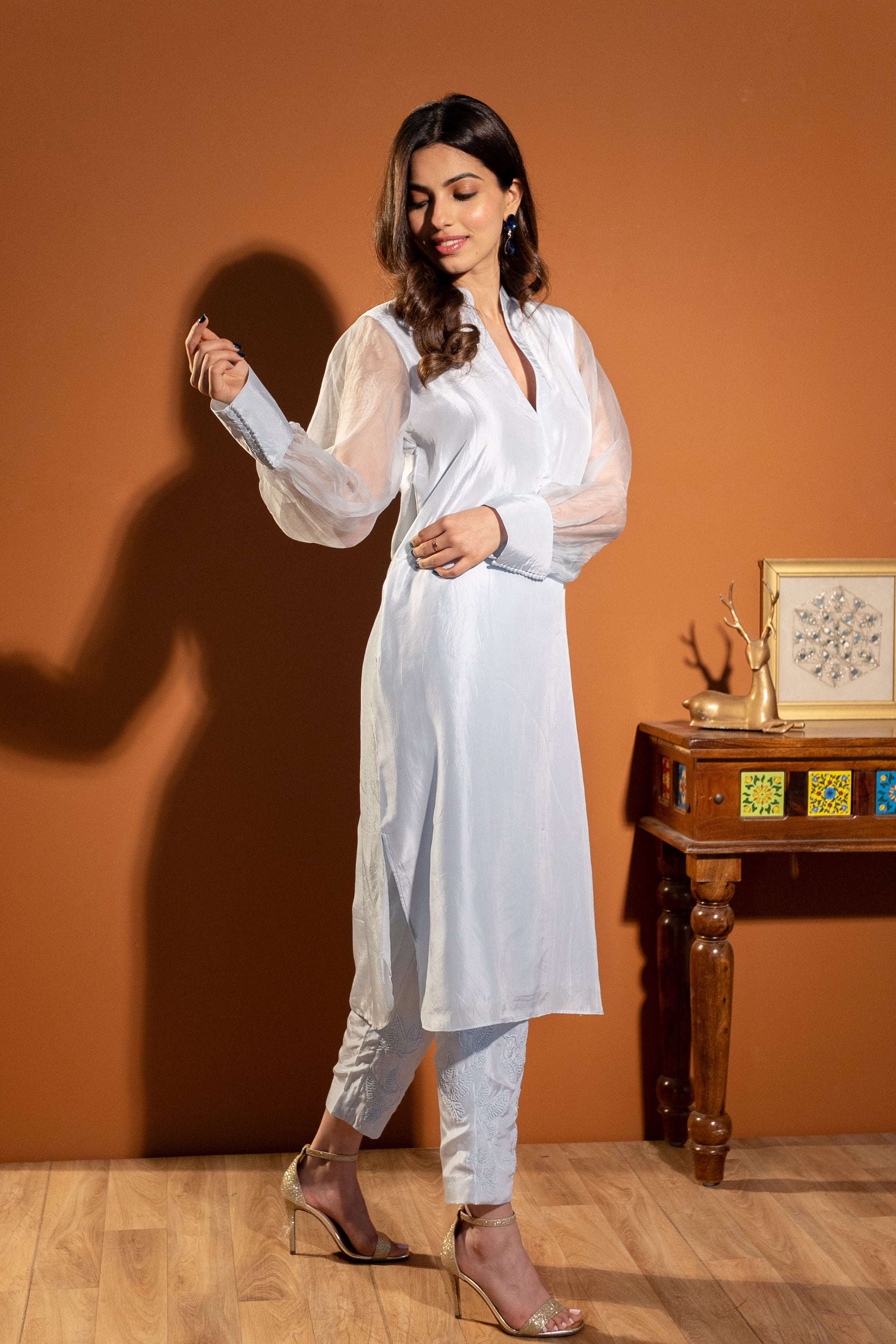 The shirt has organza cuff sleeves. Pants come with an elasticated waist with strings & fitted pants with birds motifs in beads hand embroidery.
