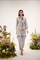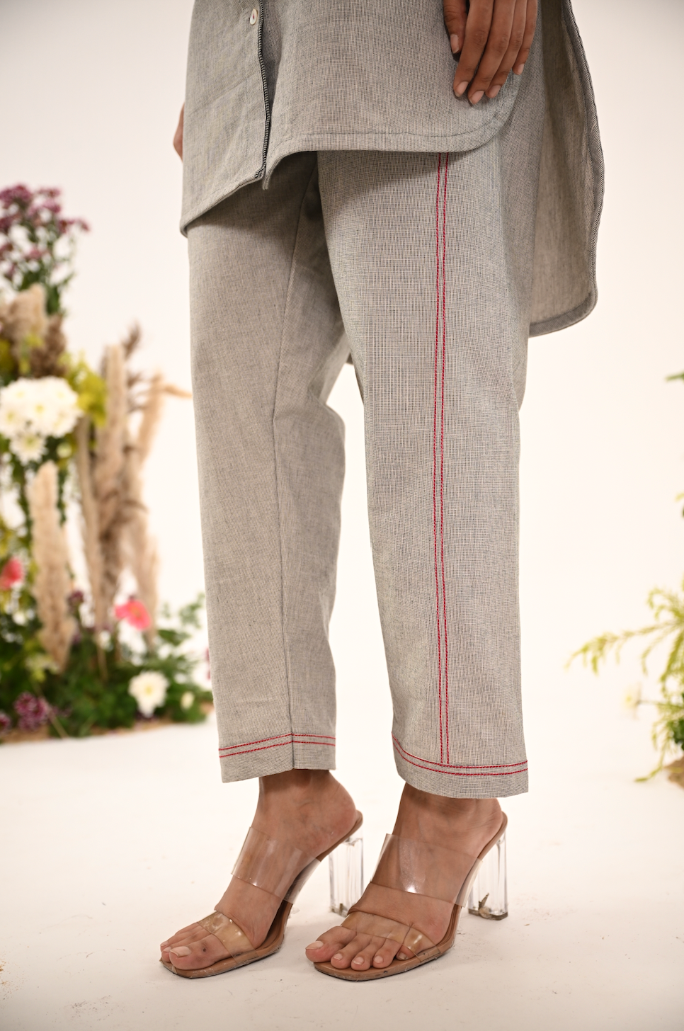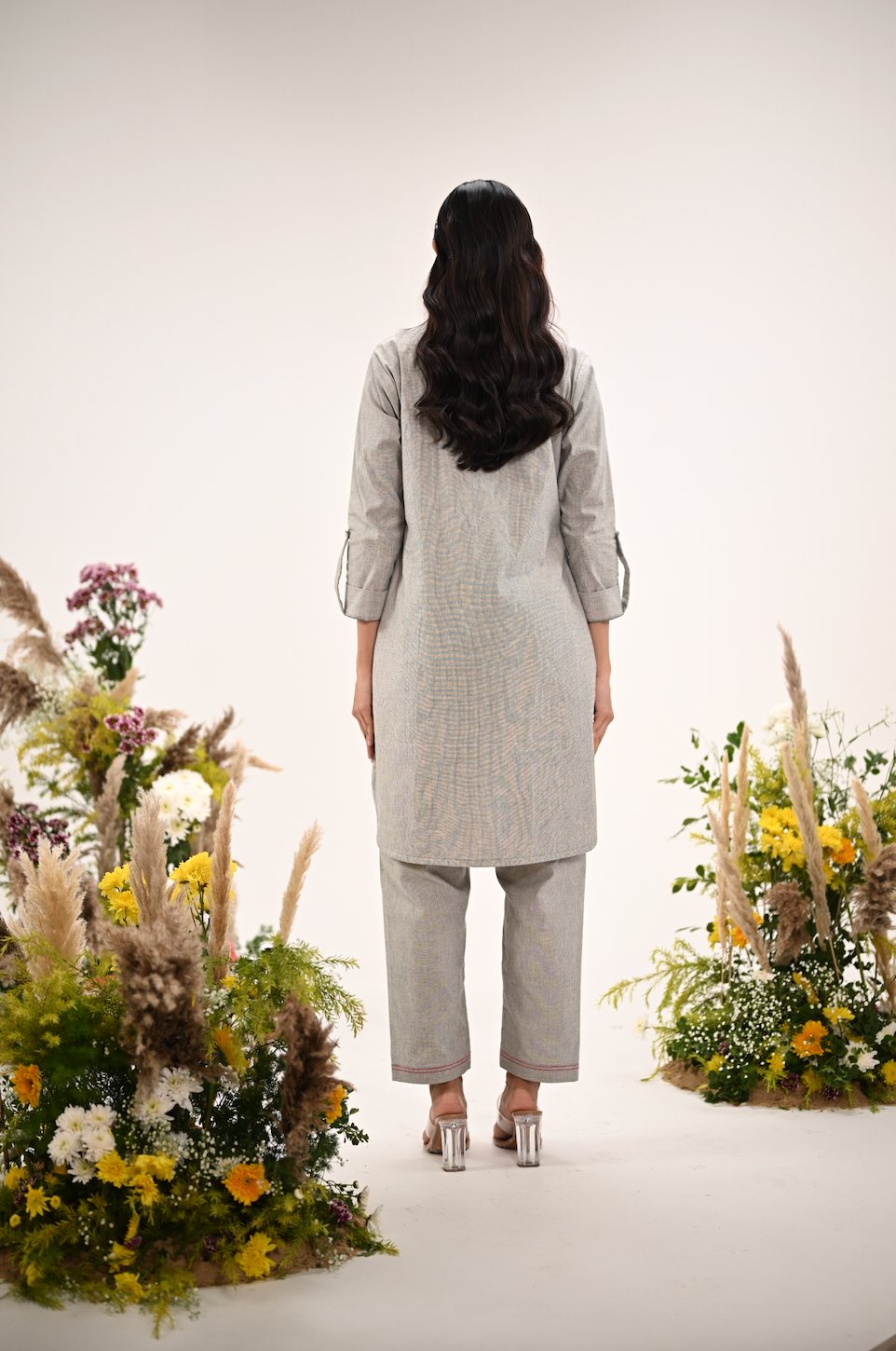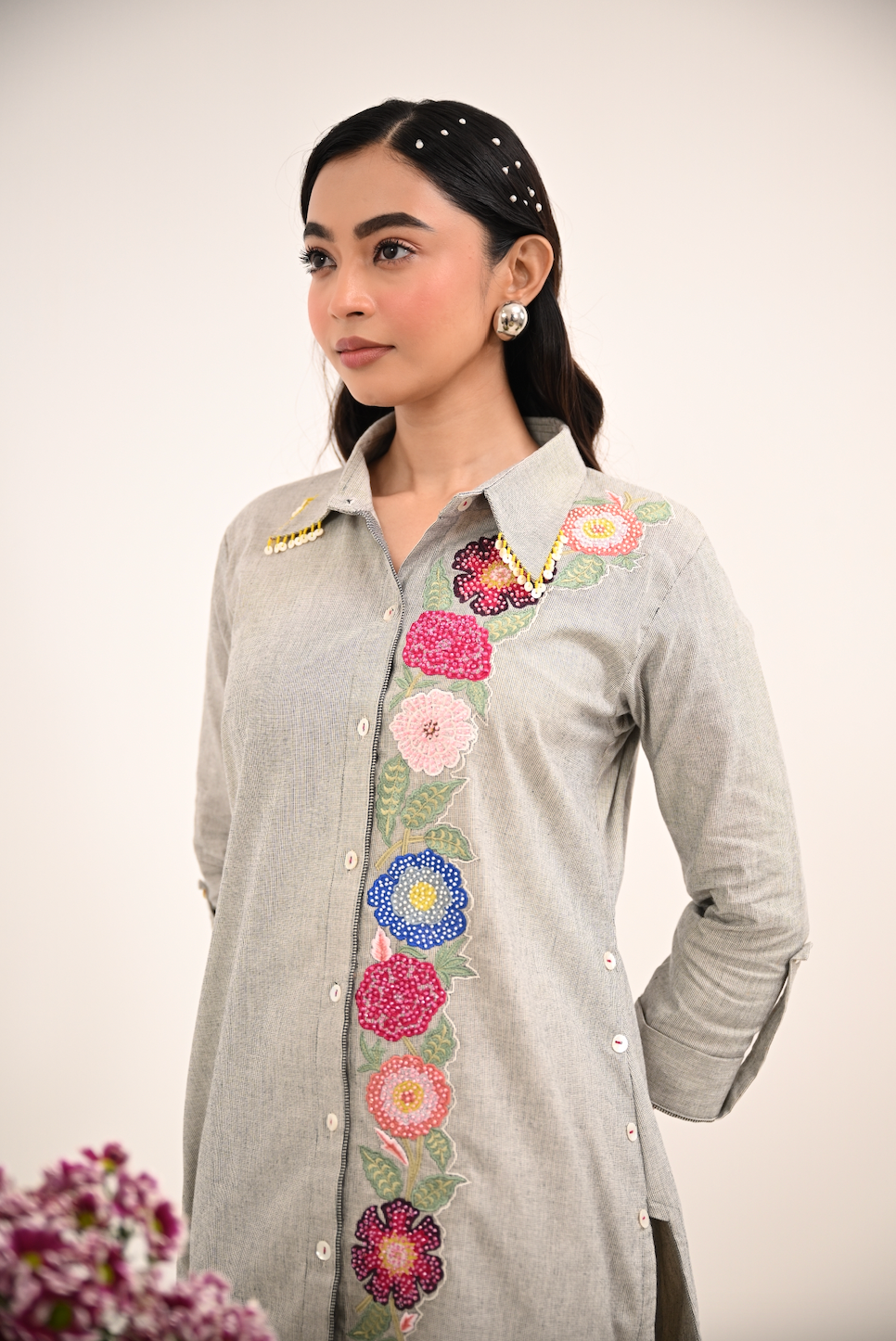A soft grey coord set featuring a vertical panel of multicolour floral embroidery and a hand-embellished collar. A perfect balance of minimalism and craft — made for days when subtle details speak the loudest.