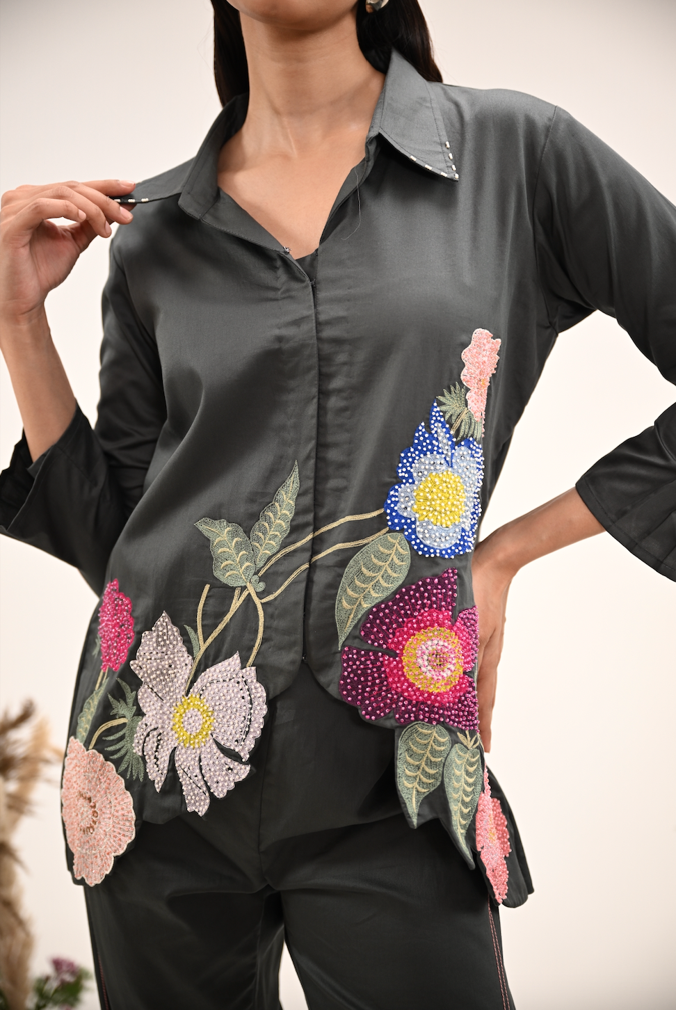 A deep charcoal coord set with vibrant floral hand embroidery and beadwork along the side seam. Sculptural, striking, and artfully detailed — made for statement-makers who love modern craft.