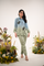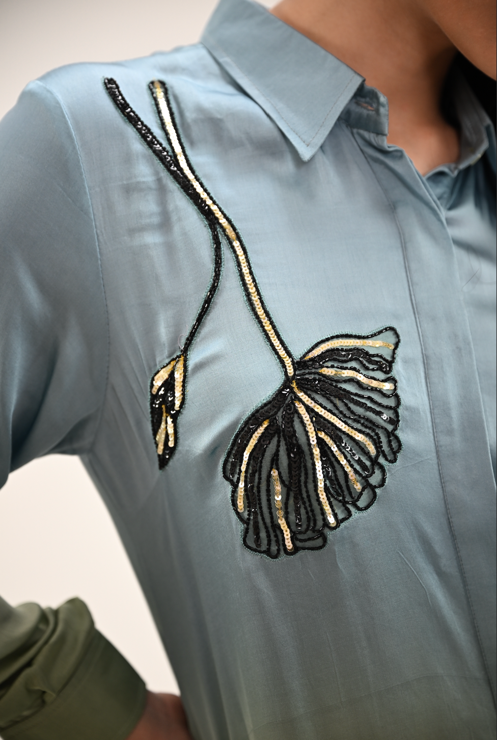 A dip-dyed ombré set blending sage green and soft blue, finished with bold botanical appliqué and adjustable tie-up sleeves. A breezy, statement-making piece rooted in nature and modern design.
