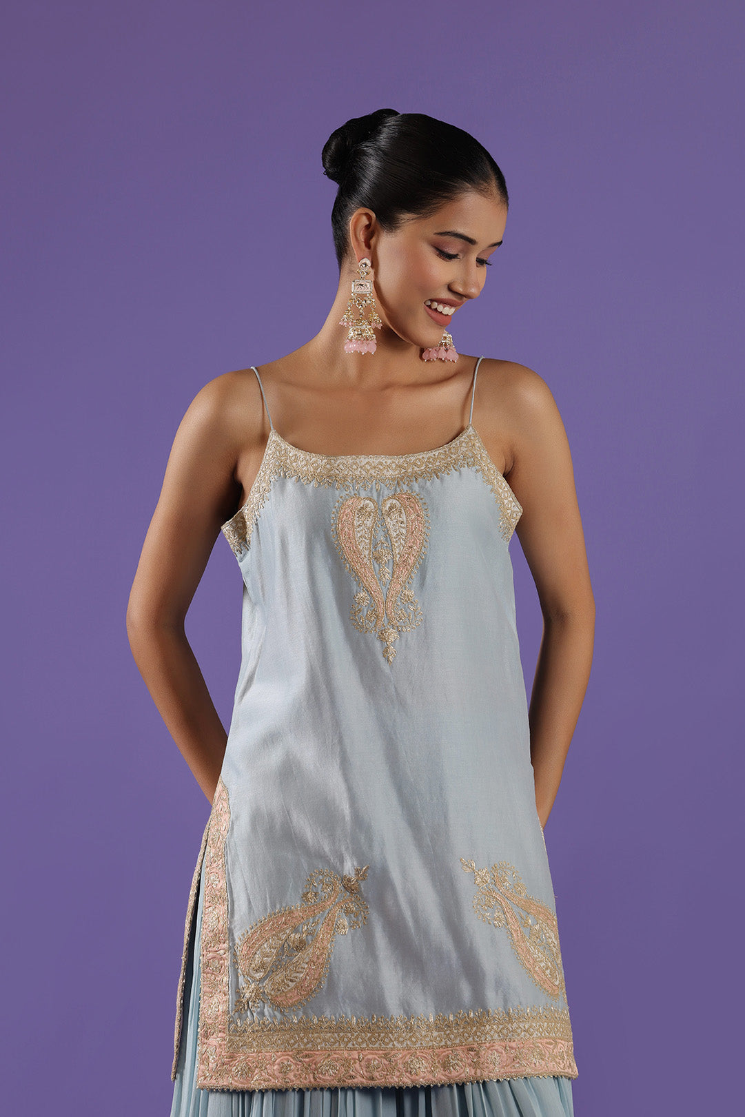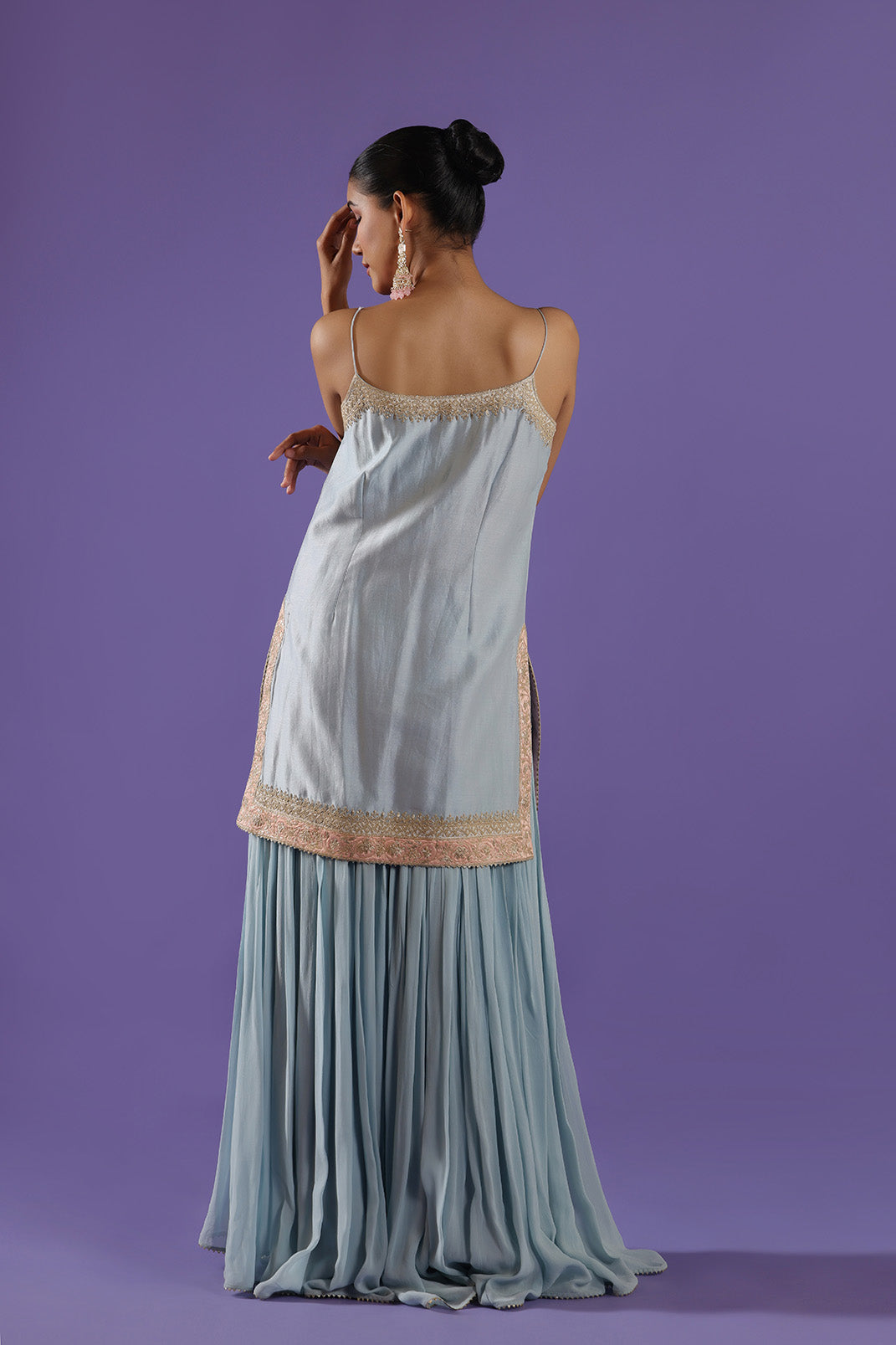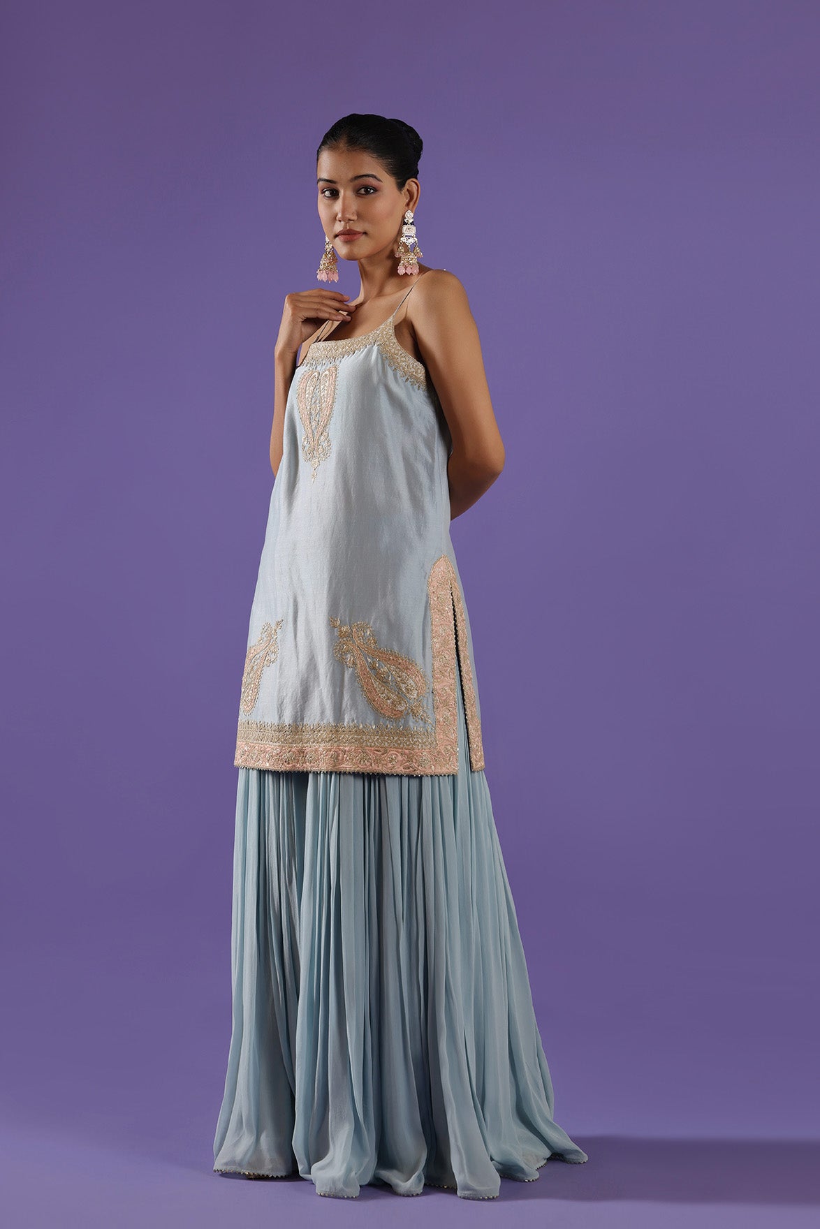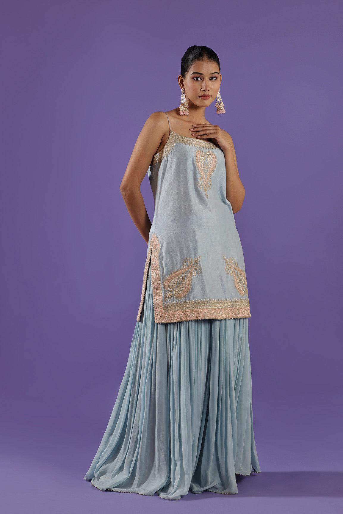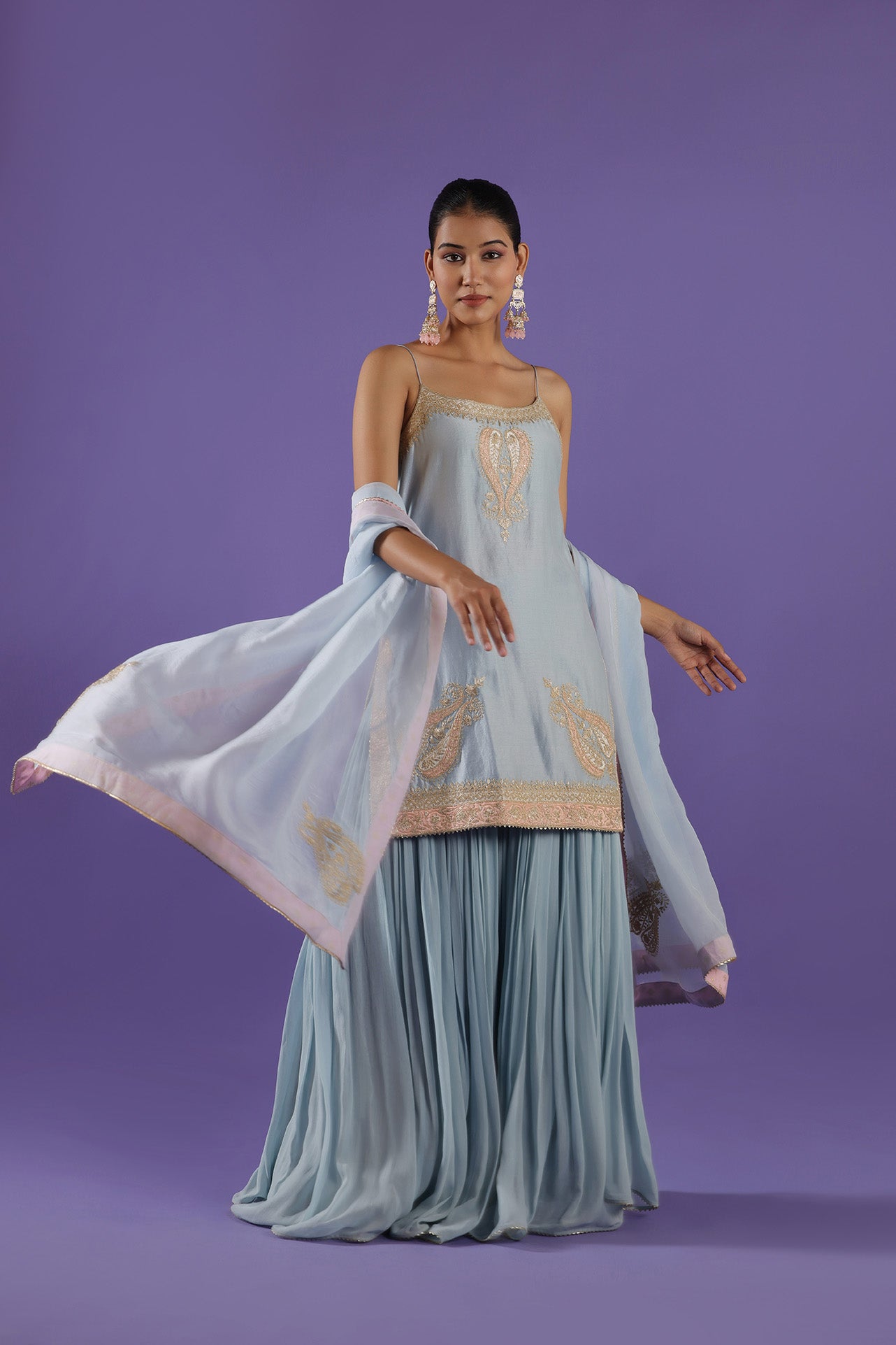 This Pastel Blue Short Shirt and Garara Set embodies ethereal charm and grace. The Chanderi Kurta features intricate Kashmiri Tilla embroidery, exuding timeless elegance. Paired with a flowy Georgette Garara, it creates a mesmerizing silhouette that allows for effortless twirls. The delicately embellished Organza Dupatta adds an enchanting finishing touch. Whether you're attending a festive celebration or a wedding soirée, this ensemble ensures you radiate sophistication with every step.