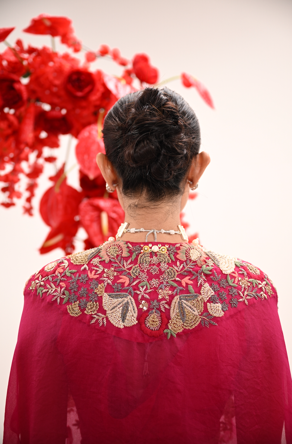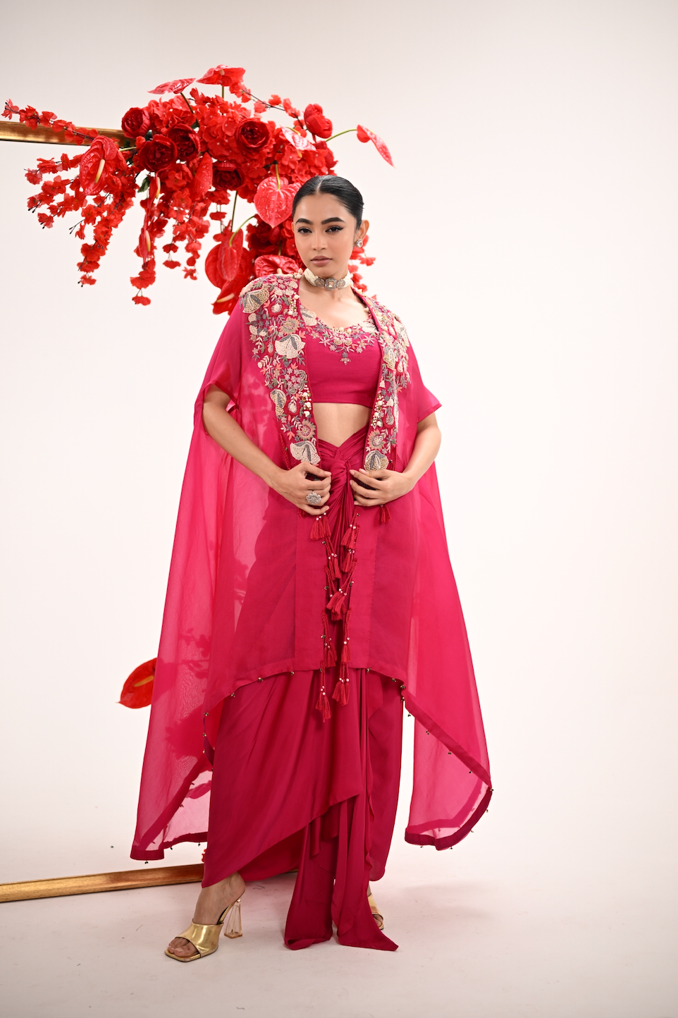 A fierce hot pink draped ensemble featuring a pleated knotted skirt, embroidered blouse, and a cape that brings all the flair. Light, bold, and made for twirling through cocktail nights and mehendi dance floors — this set is your main character moment.