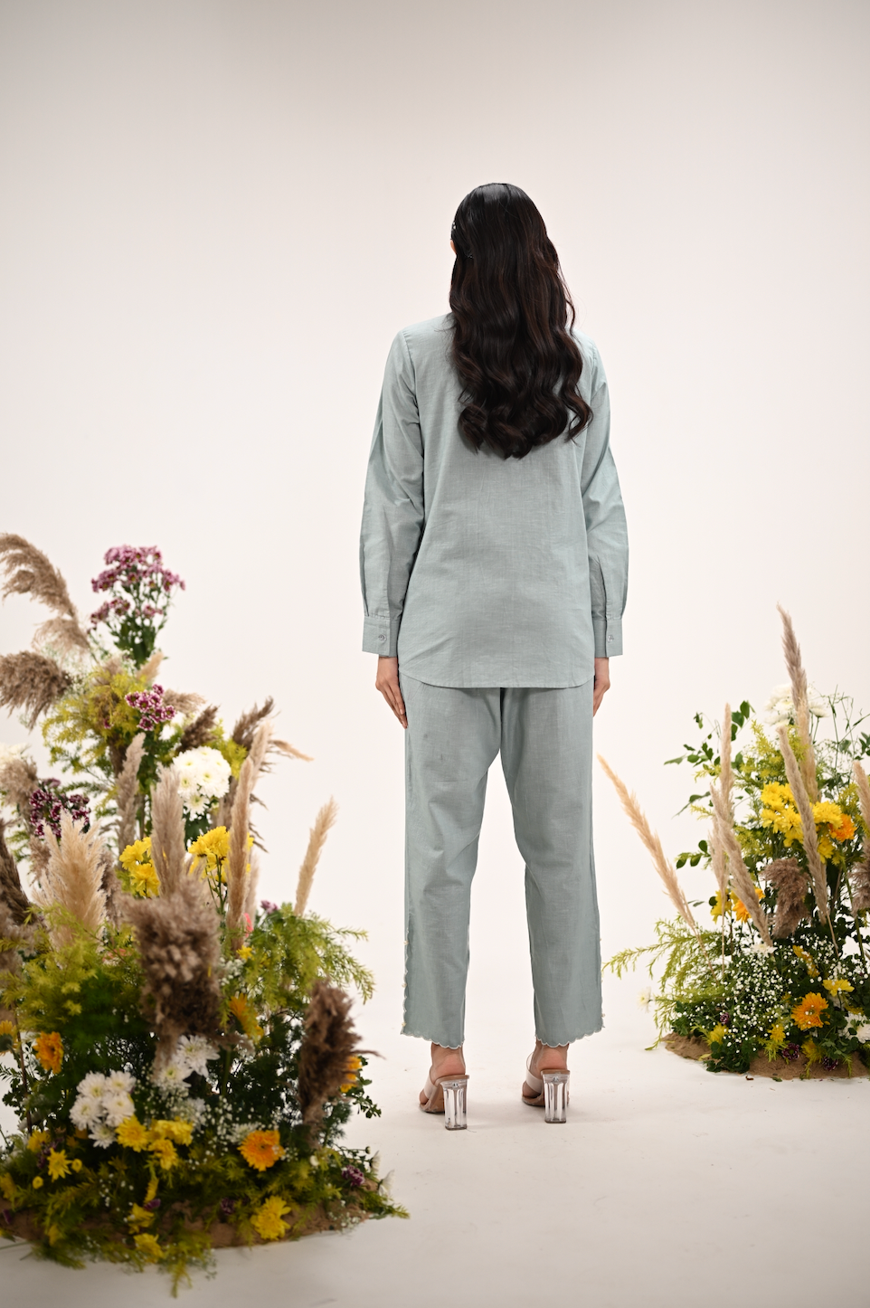 A Powder Blue coord set detailed with delicate organza 3D appliqué embroidery across the yoke. Crafted in soft cotton, it’s the perfect blend of texture, comfort, and understated elegance — ideal for festive mornings or intimate gatherings.